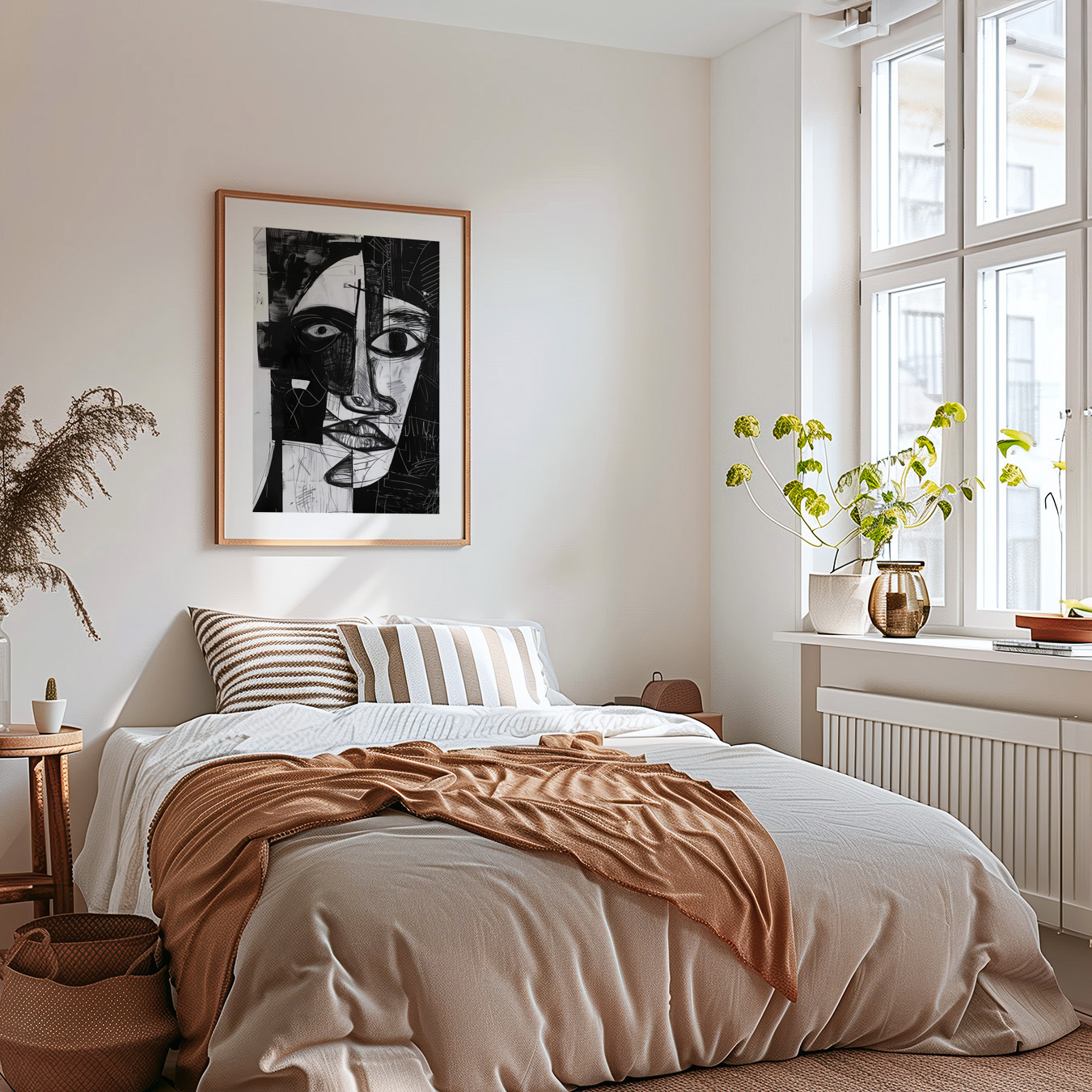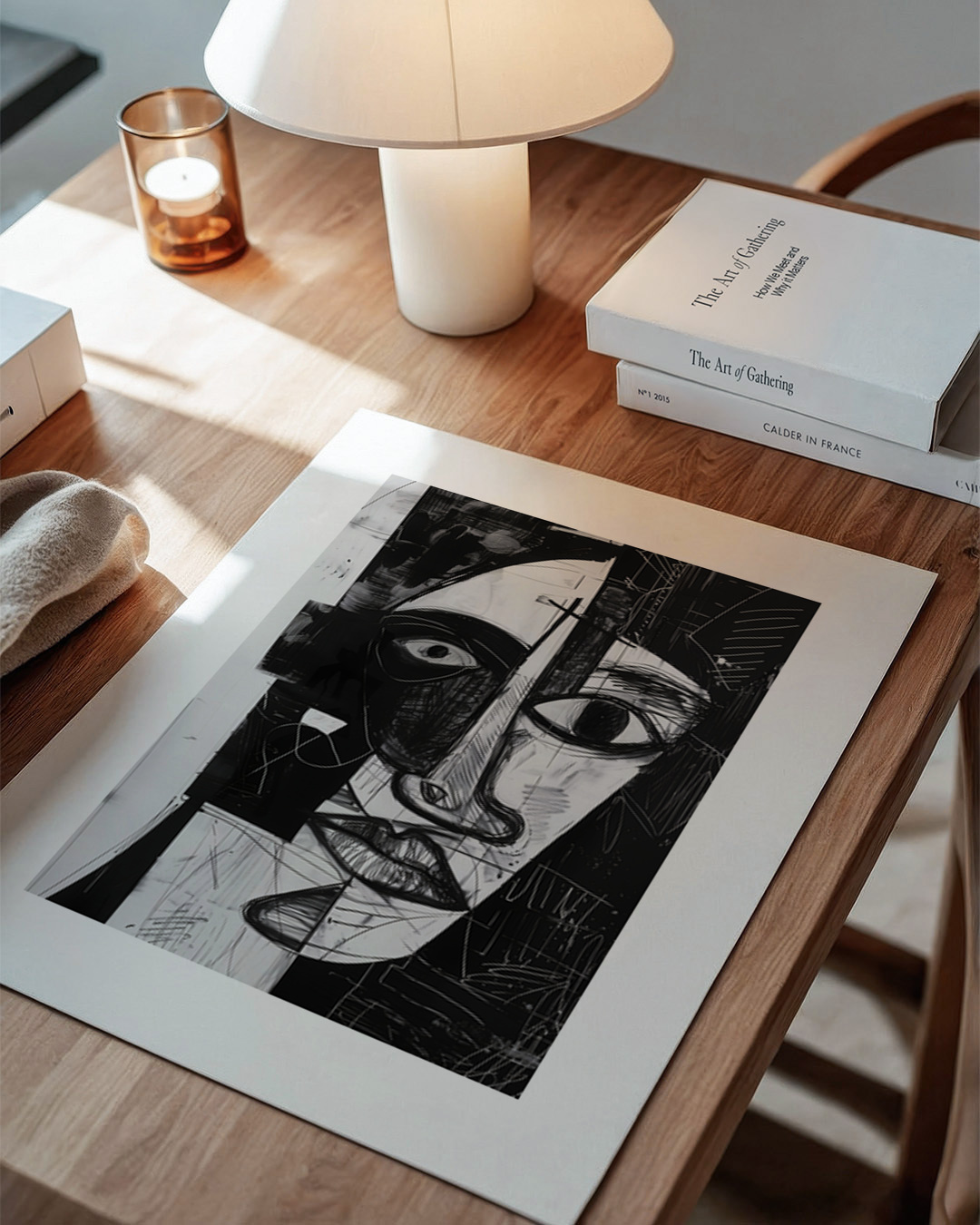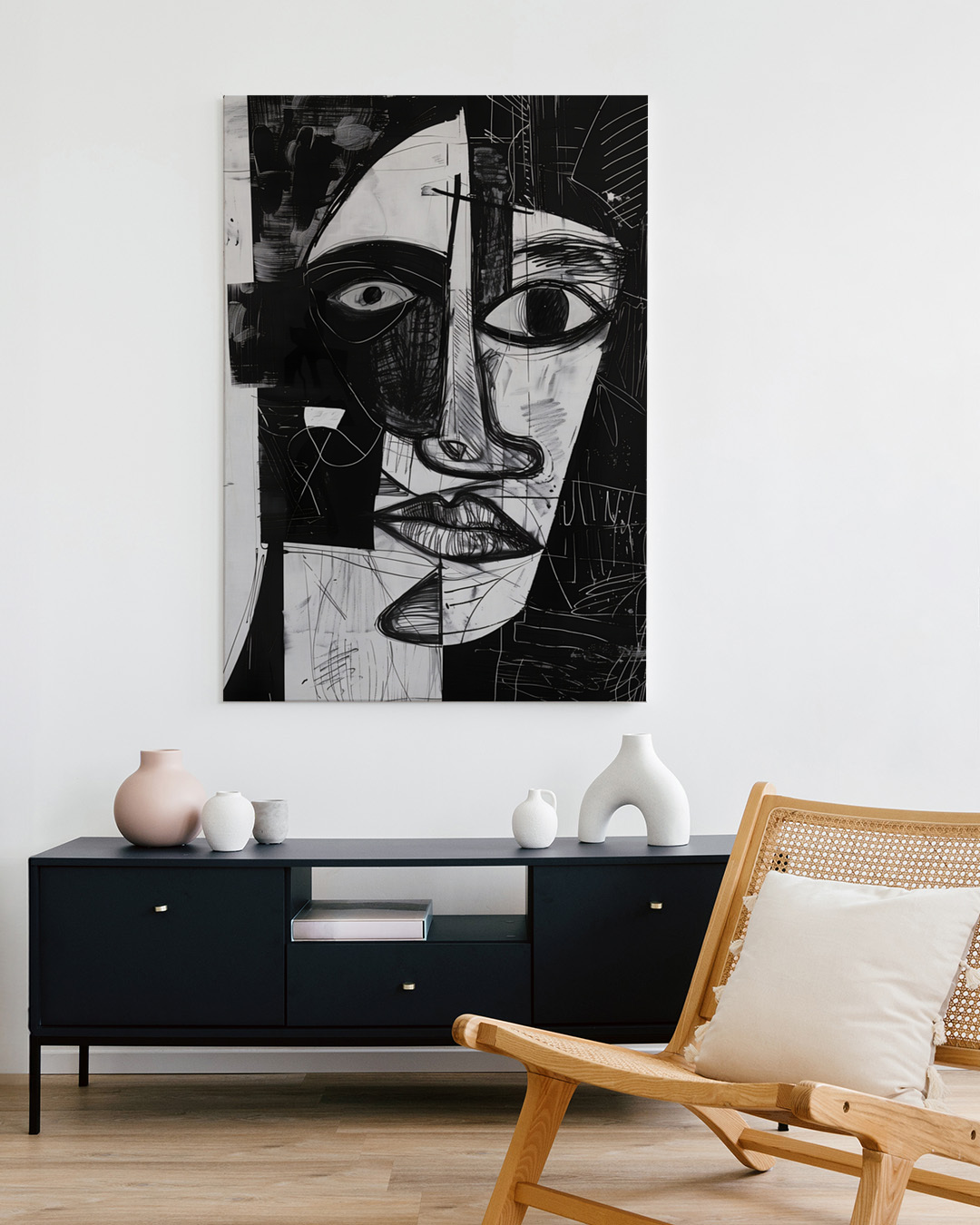 Denne slående monokrome kunsttryk har et abstrakt ansigtsdesign med dristige linjer og udtryksfulde detaljer, der fanger menneskelige følelser og unikhed i en konceptuel stil.