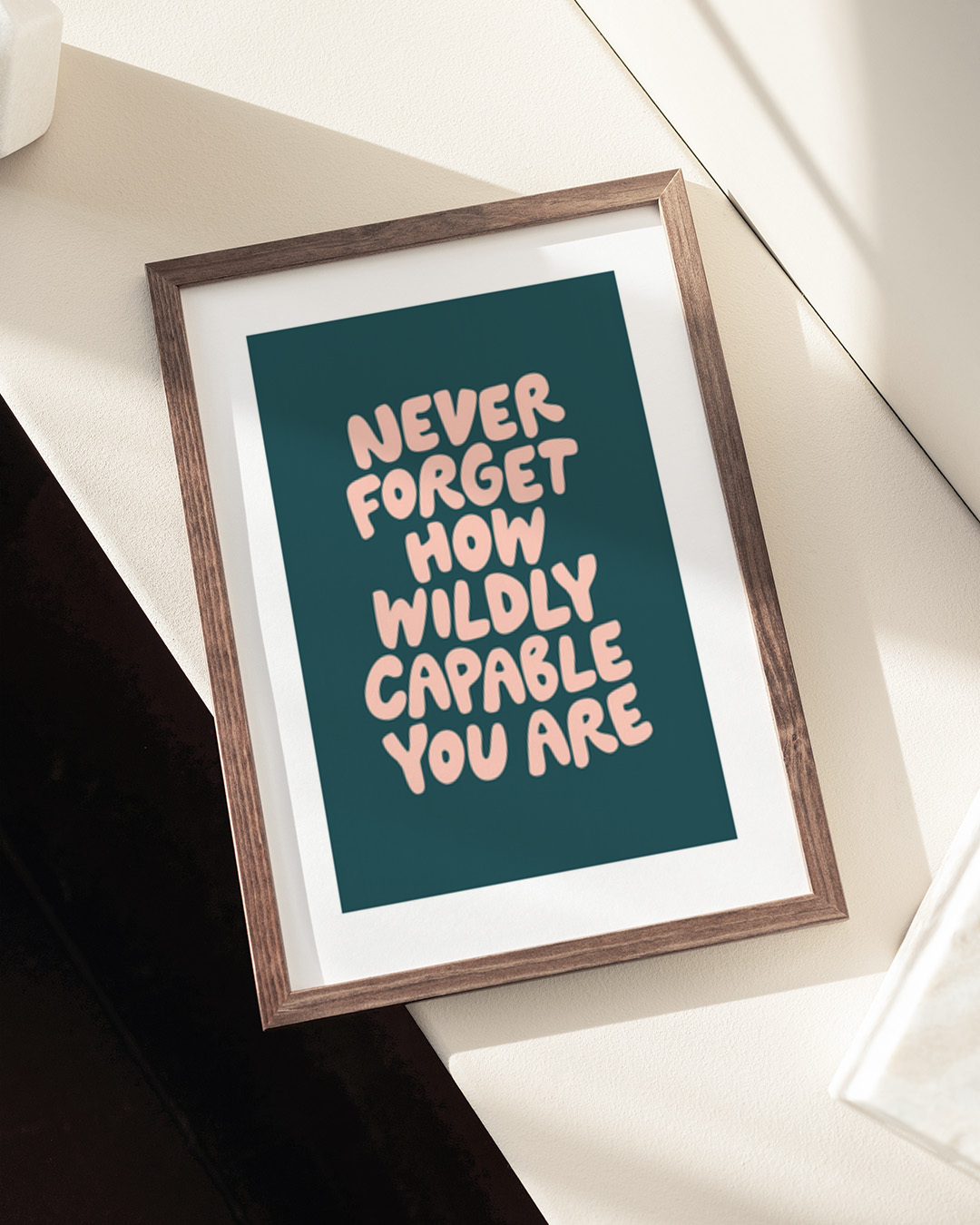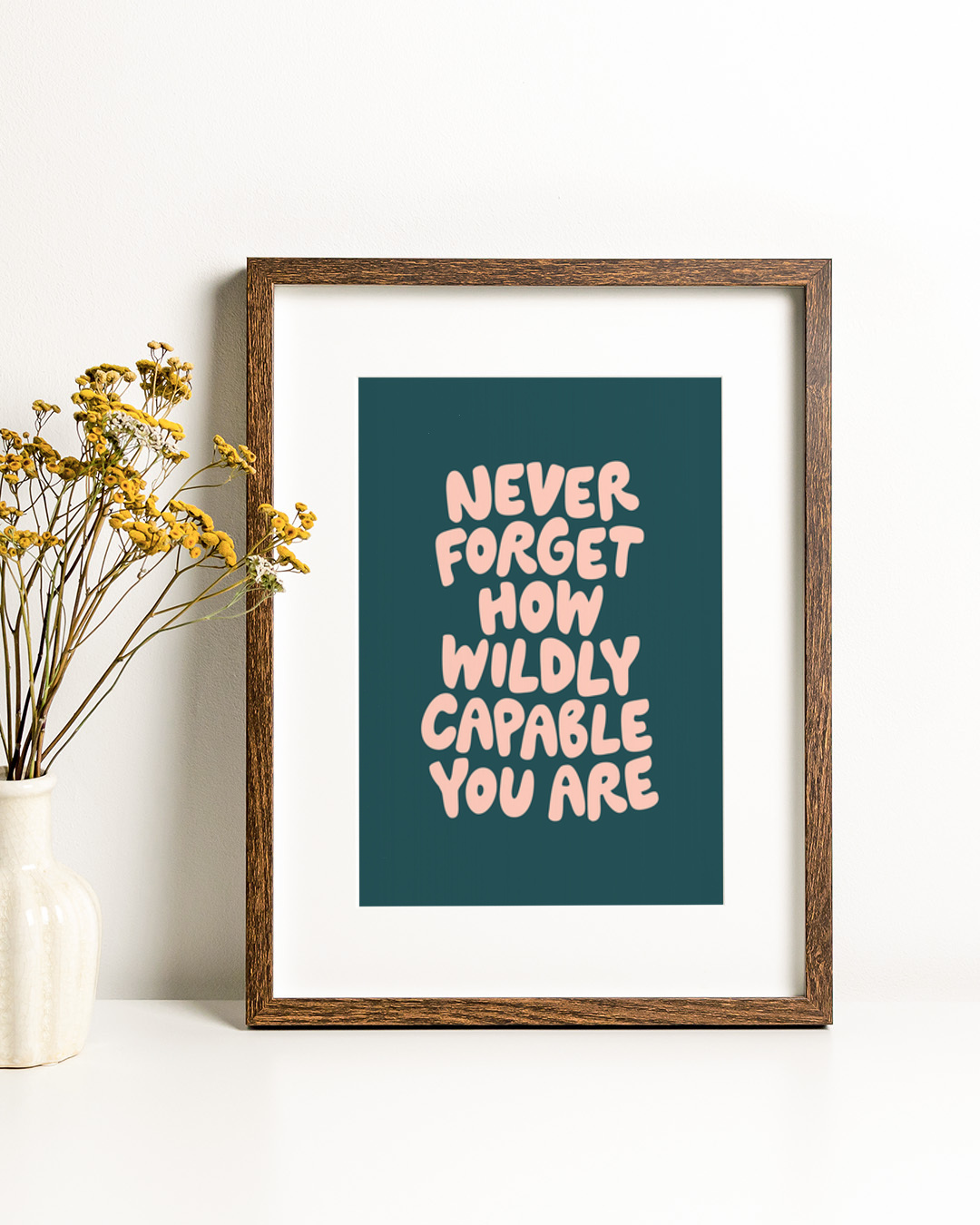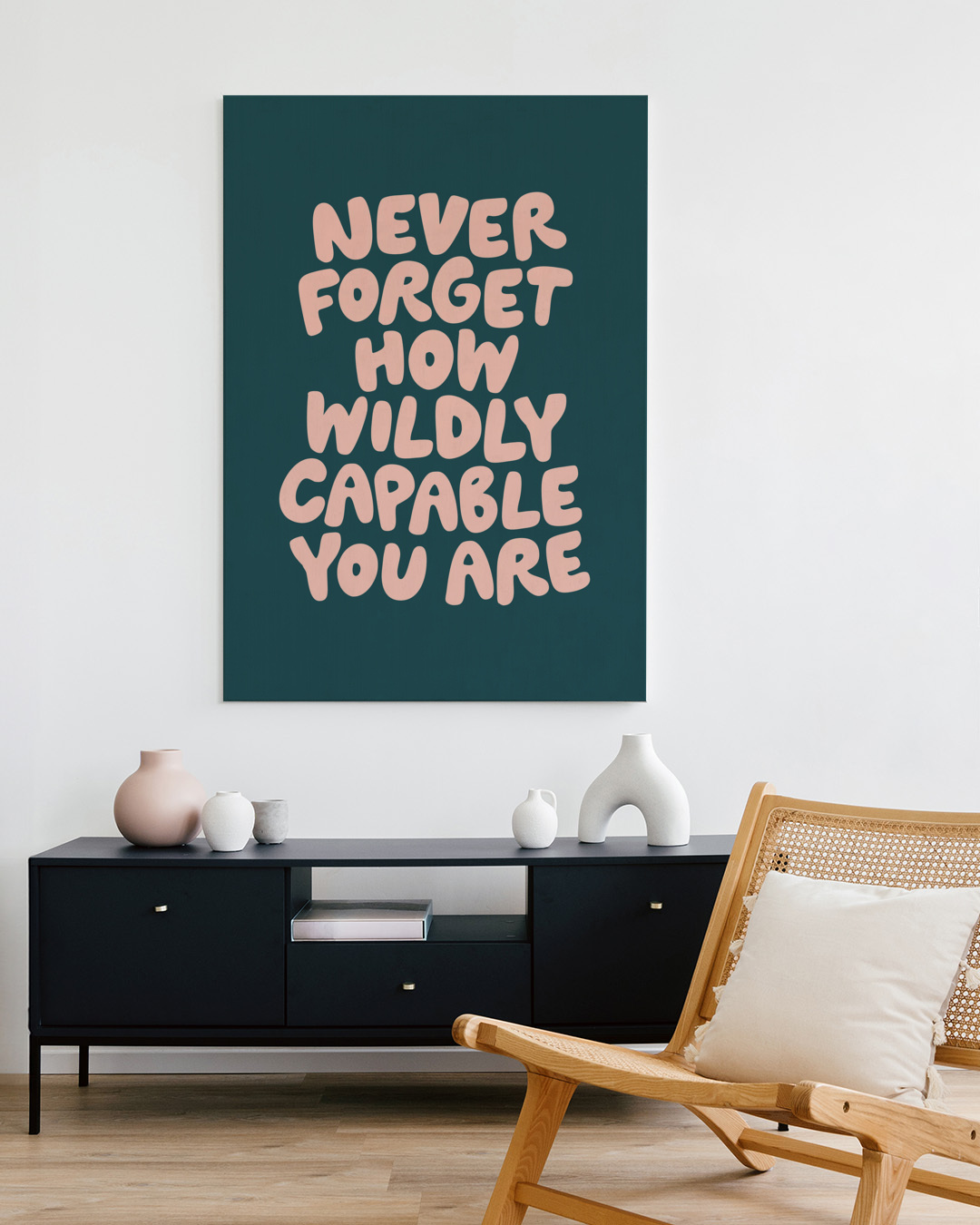 Brett Wilson inspirerer med 'Never Forget How Wildly Capable You Are', med pink tekst på en grøn baggrund. Perfekt til at tilføje motiverende charme til enhver plads.