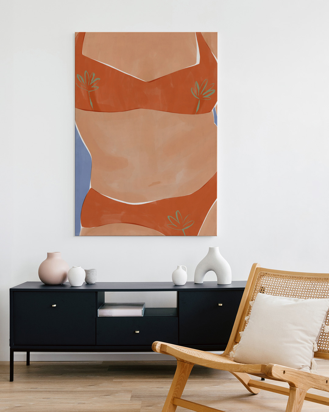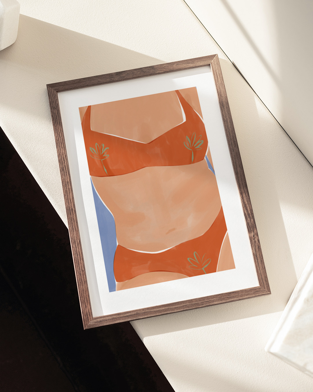 Oplev den levende stil med denne illustration, der viser en person i en orange bikini med blomsterdetaljer på en blå baggrund.