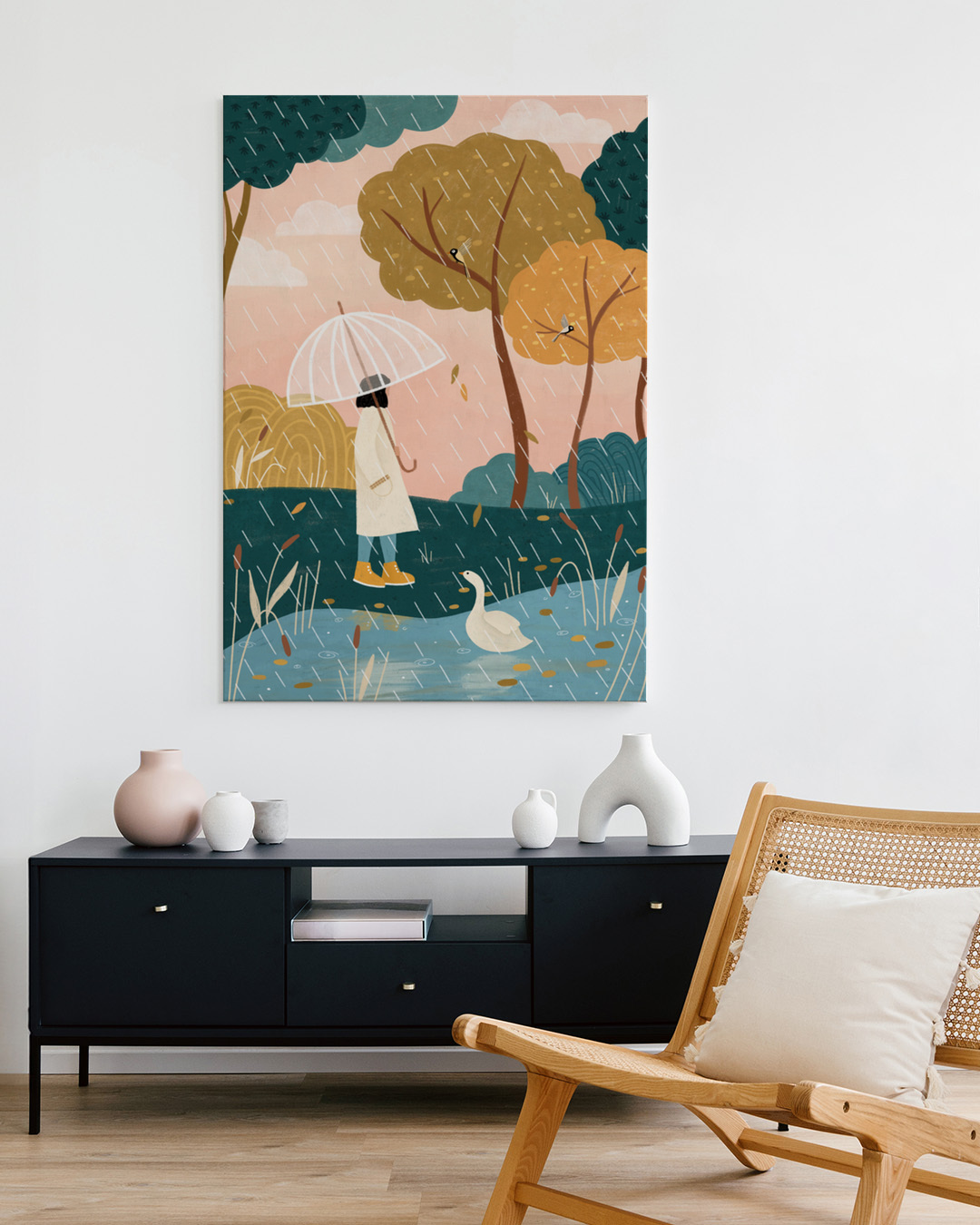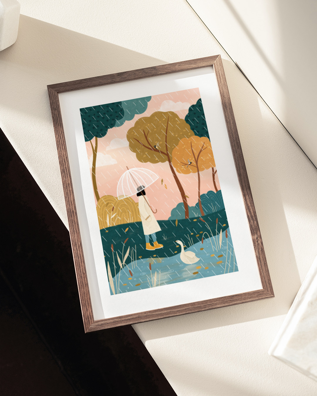 En charmerende illustration af Bea Müller, der viser en person i en park, der går med en paraply i efterårsregnen. Den fredfyldte stemning er smukt skildret, hvilket gør scenen indbydende.