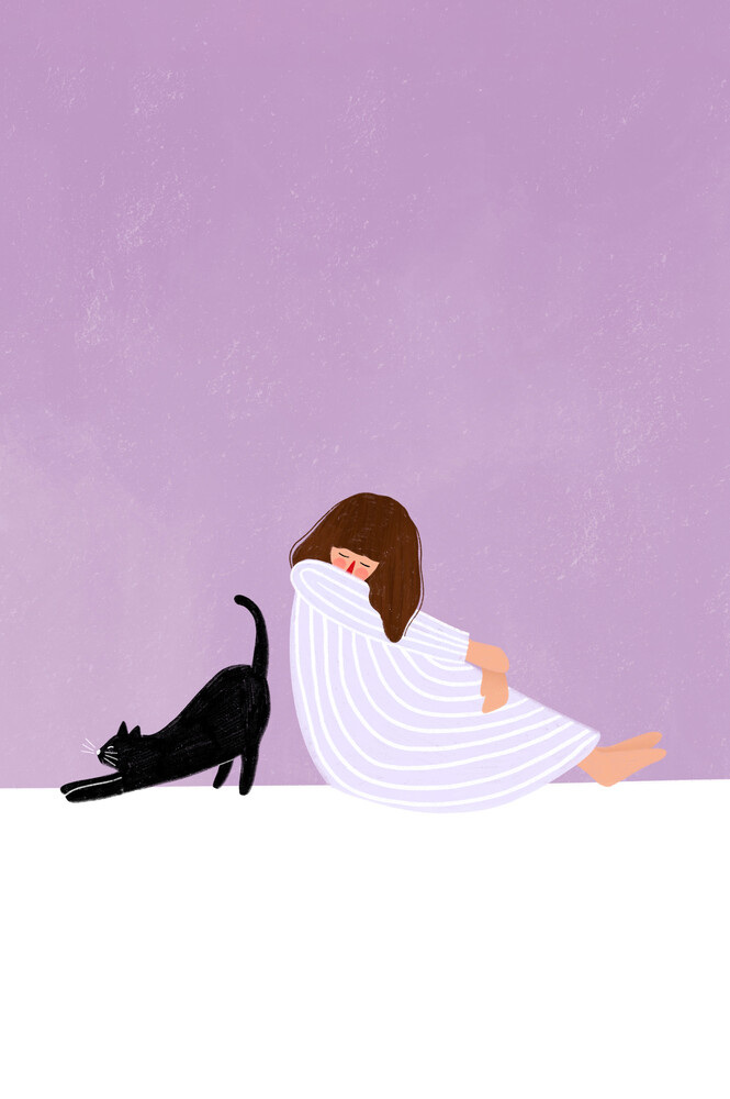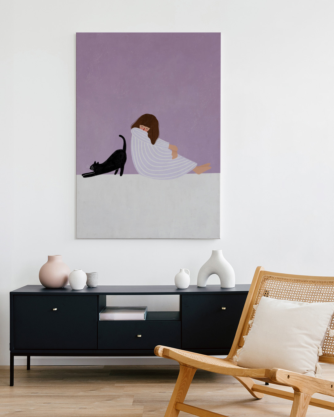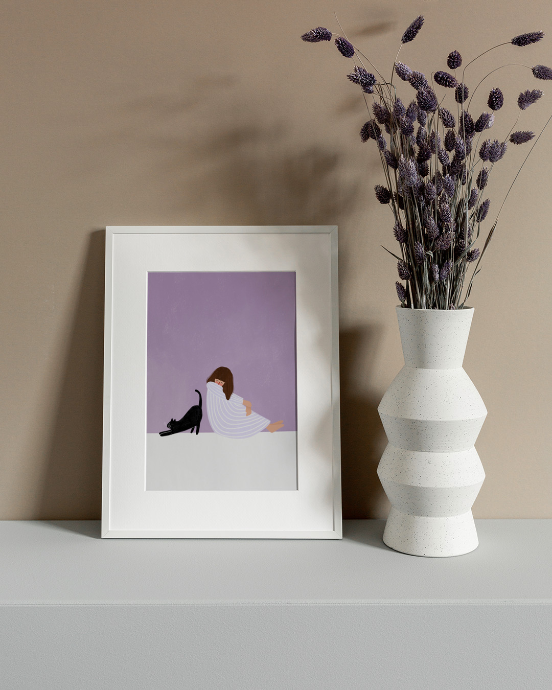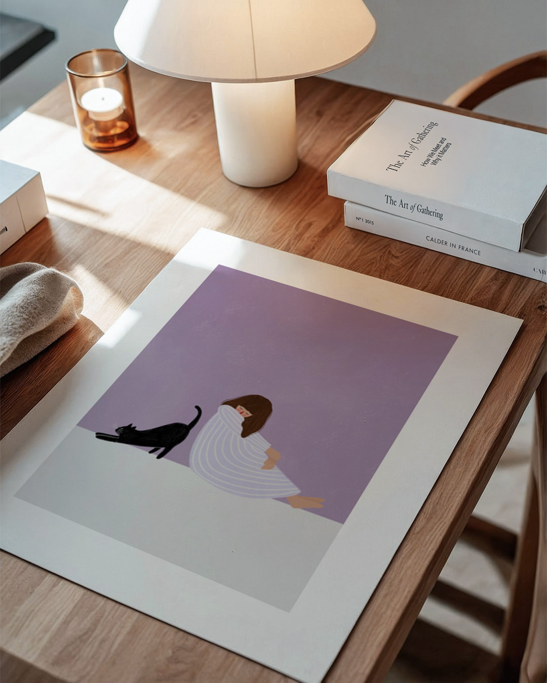Bea Müllers illustration viser en rolig pige ledsaget af en sort kat mod en blød lilla baggrund, der fanger et øjeblik af stille venskab og enkel forbindelse.