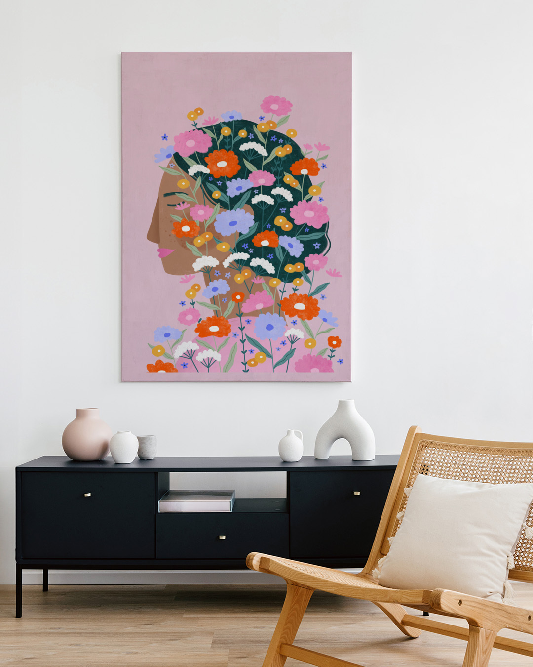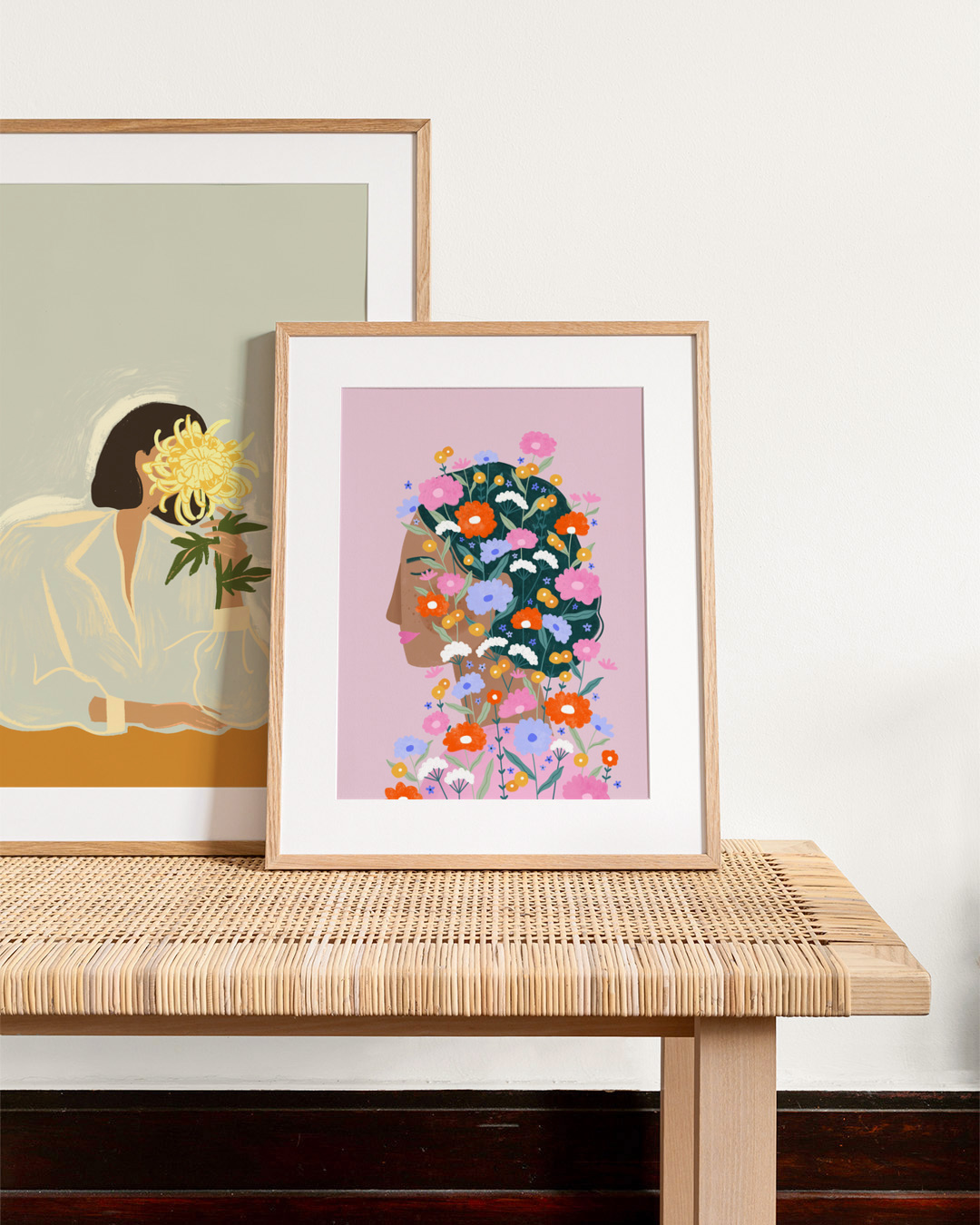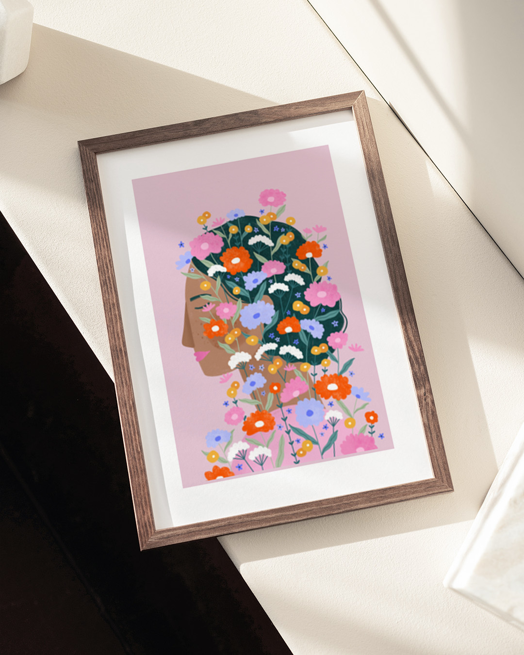 Dette fortryllende tryk af Bea Müller viser en kvindes profil smukt prydet med et kaskade af farverige blomster. En harmonisk blanding af natur og menneskelig form, dette kunstværk er en dejlig blanding af botaniske og feminine elementer.