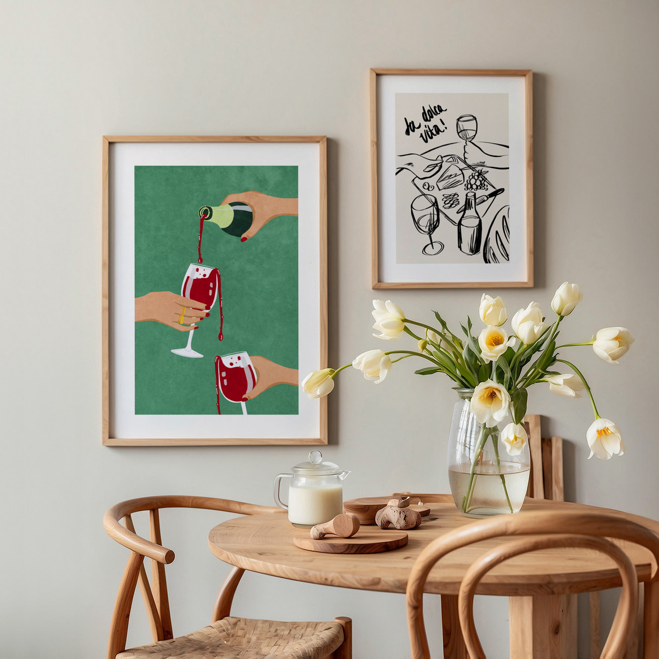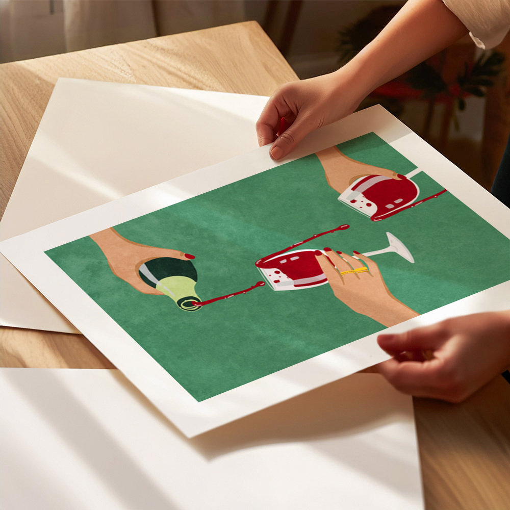 En grafisk afbildning af tre hænder, der hælder rødvin i glas. Dette levende billede viser fejring og god vin.