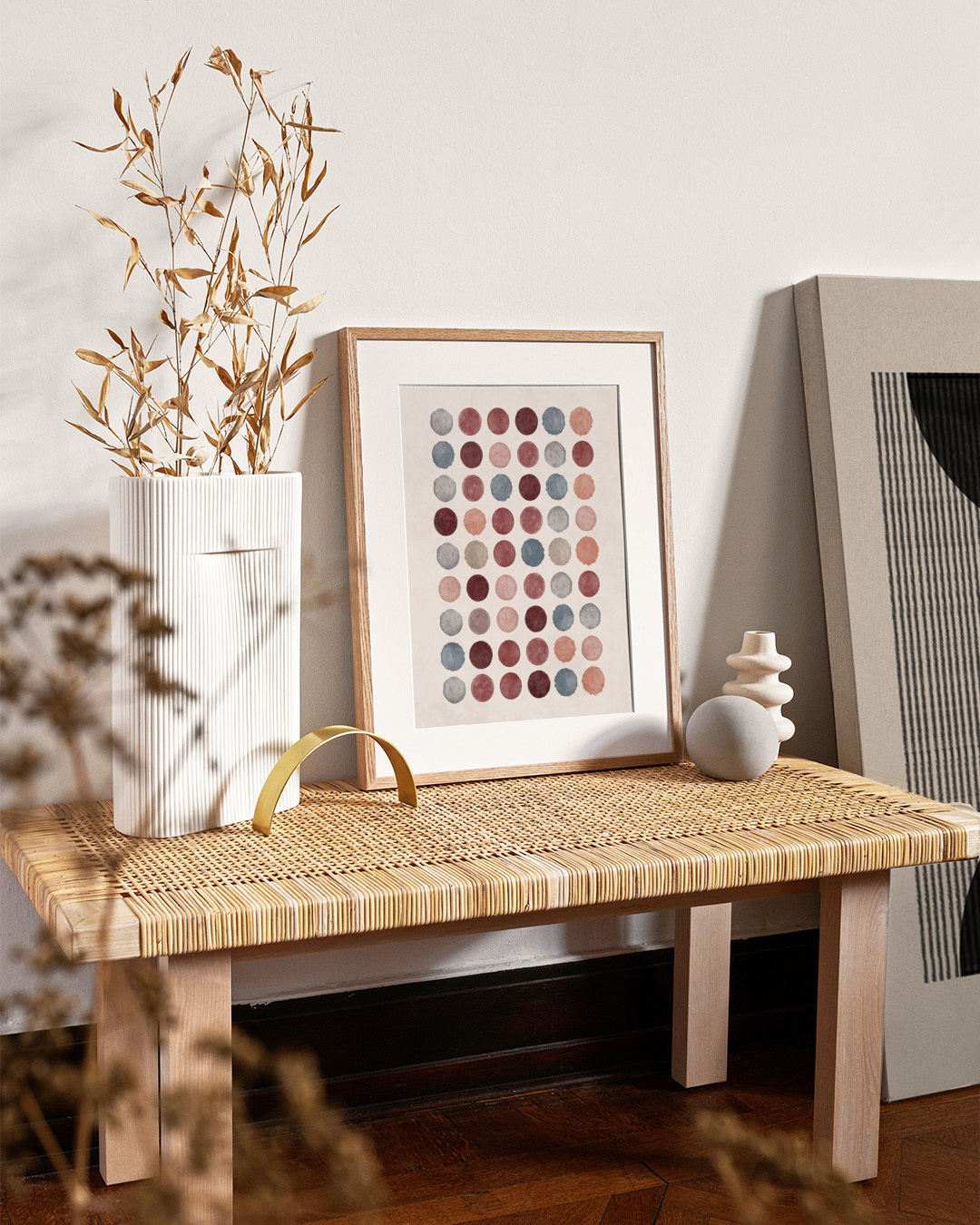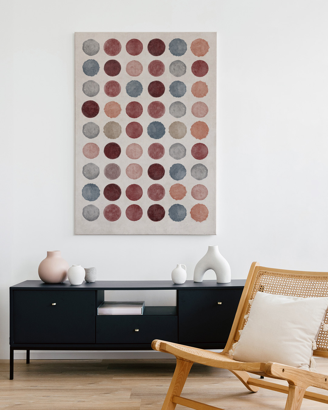 Den opstrakte lærred er indrammet med en elegant svæveramme i ægte træ for et stilrent udseende og ekstra dimension. Afstanden mellem lærredet og rammen skaber en svævende effekt.