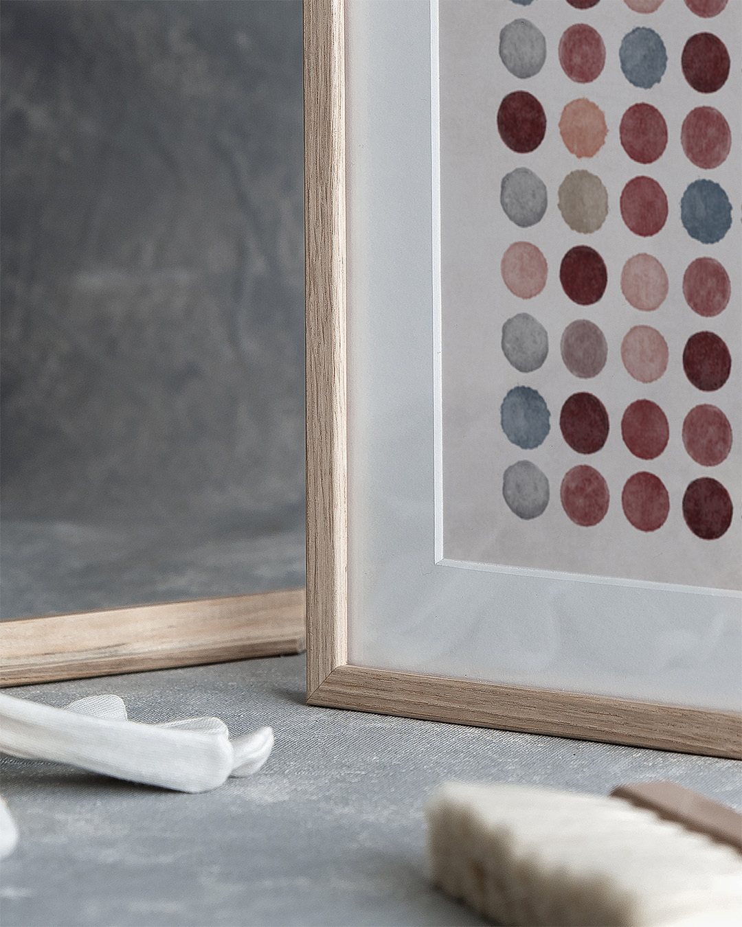 Den ekstra dybe og brede rammeprofil skaber stabilitet og et ægte blikfang på din væg. Håndlavet og afsluttet med et præcisionsskåret