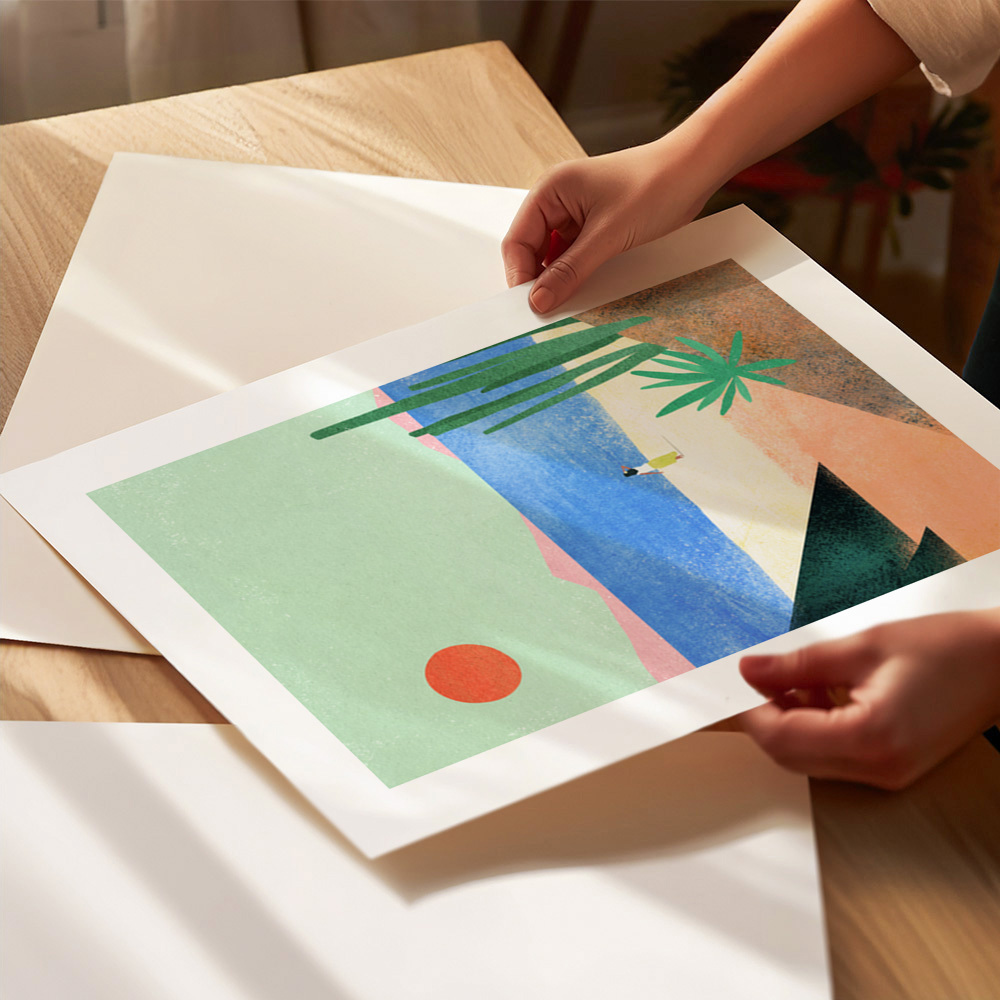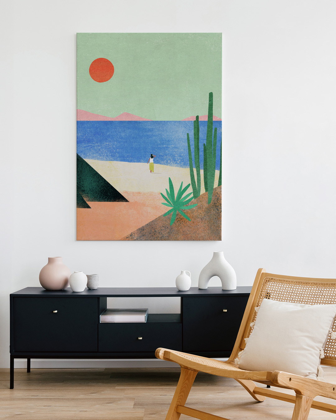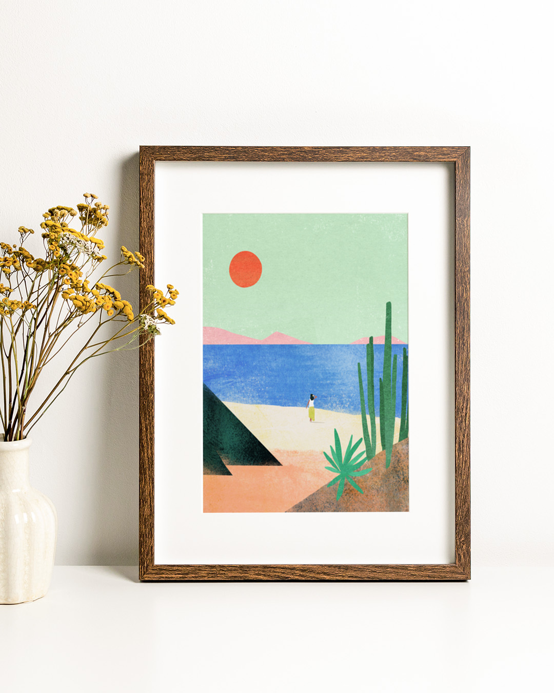 Dette kunsttryk skildrer en rolig strandscene med en ensom figur, den livlige turkise hav og frodige grønne kaktusser under den blide sol. Perfekt til at bringe en følelse af ro og kystcharme til ethvert rum.