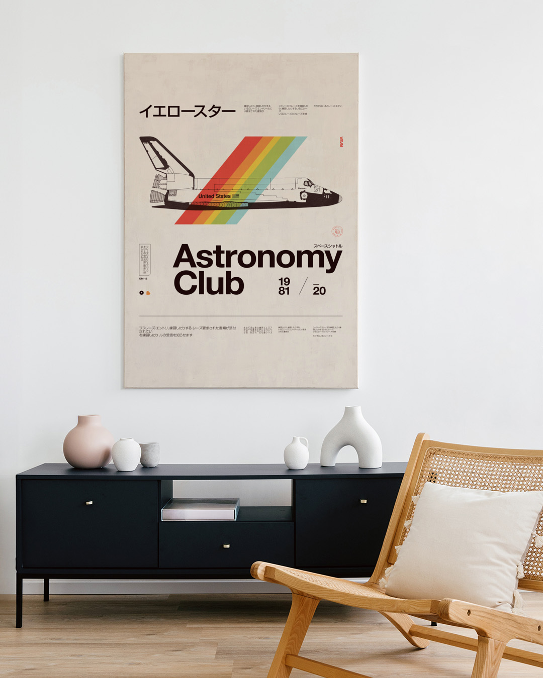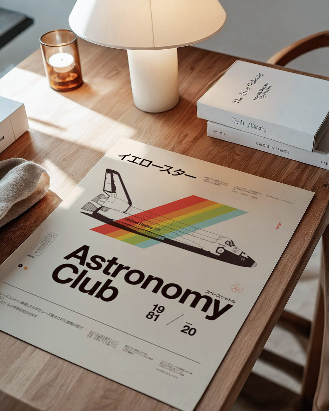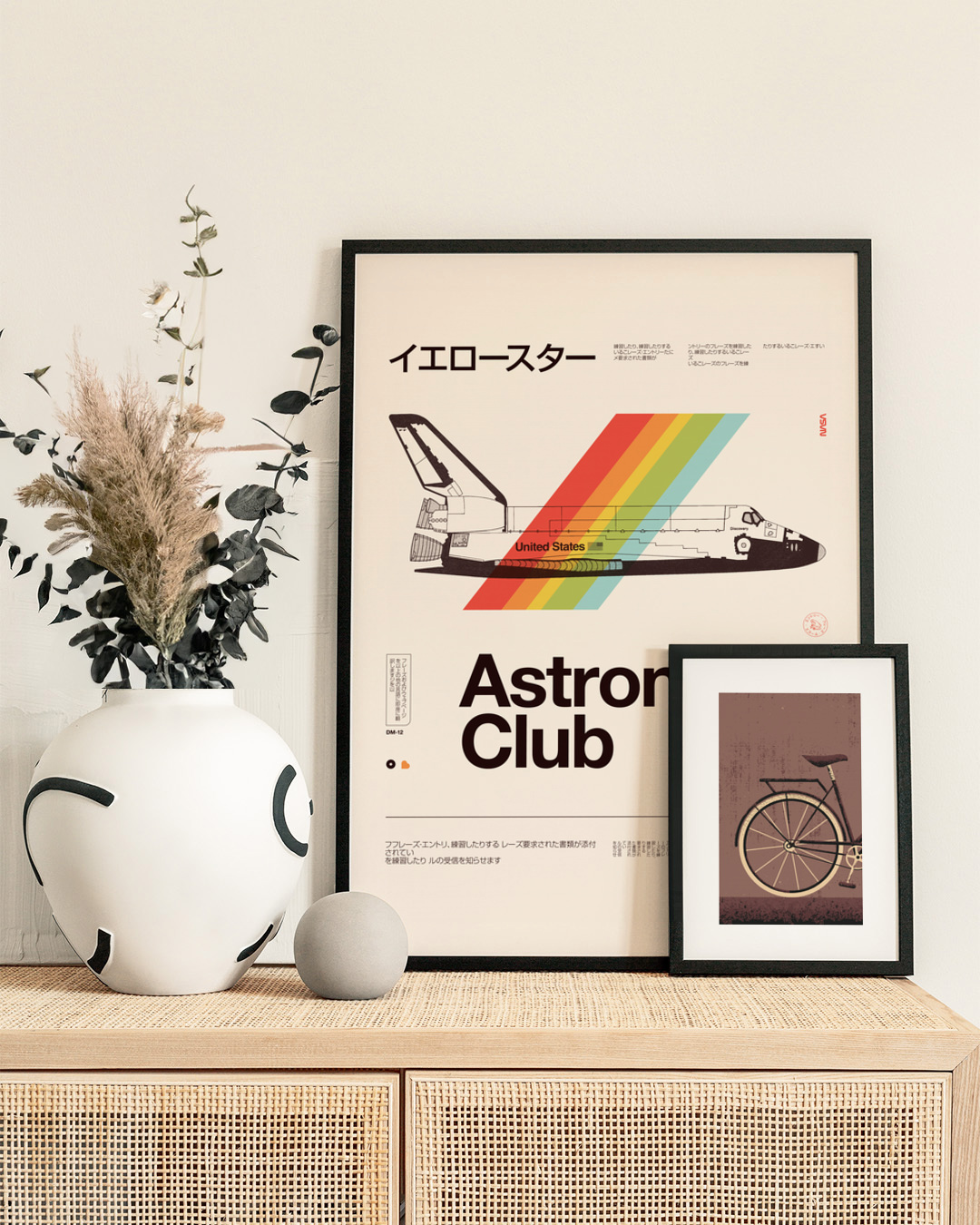 En retro fremstilling af en rumfærge mod en stribet lyserød regnbuebaggrund. Perfekt til at tilføje en vintage-kosmisk stemning til ethvert rum. Designet af Florent Bodart.