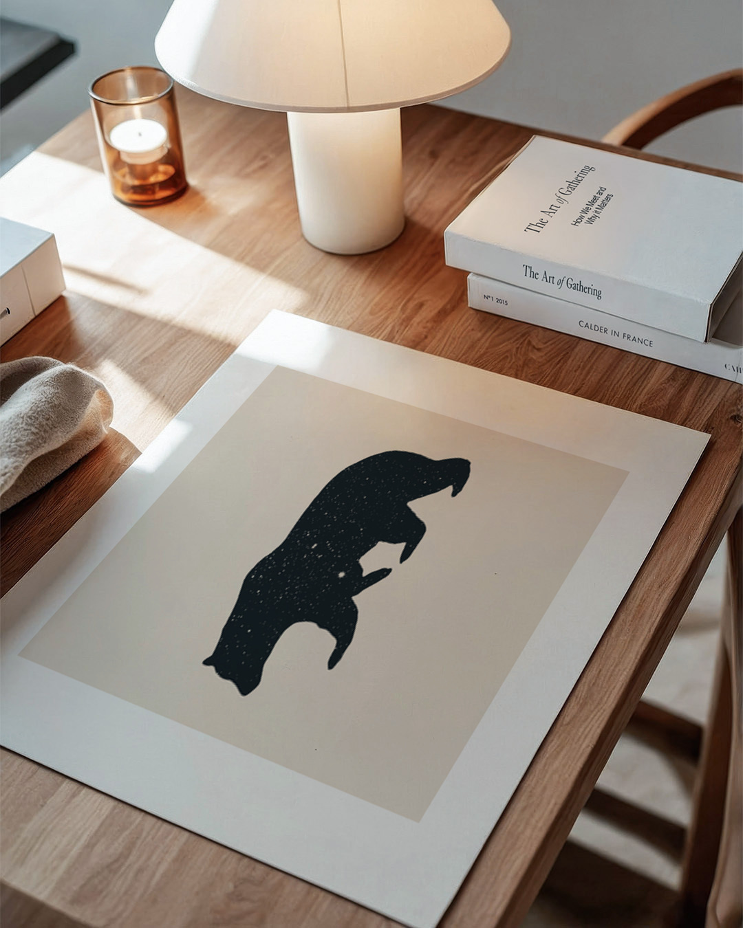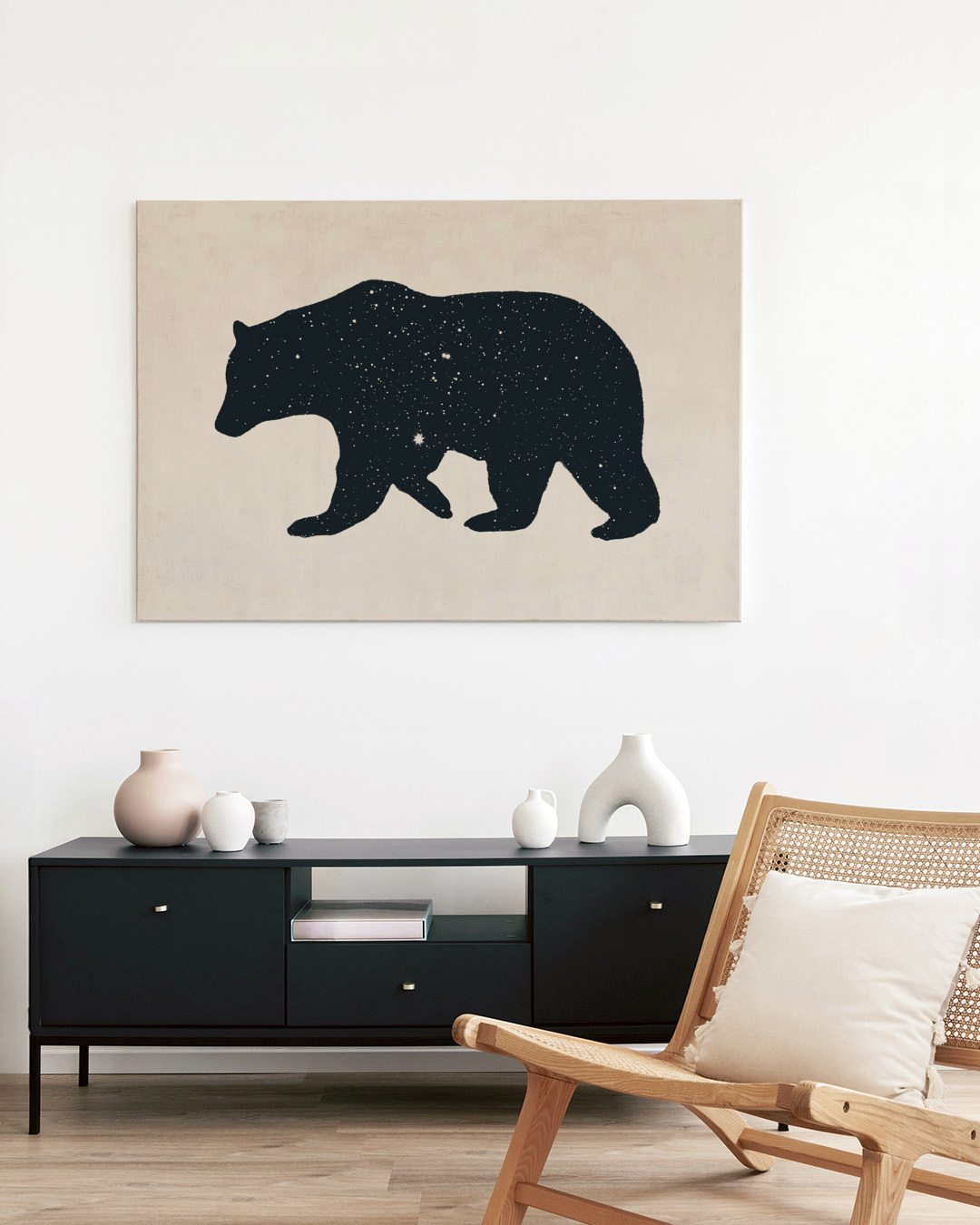 Oplev universet inden i en bjørns silhuet i dette fængslende grafiske kunstværk af Florent Bodart. På en beige baggrund er bjørnens sorte silhuet smukt fyldt med kosmiske stjerner.
