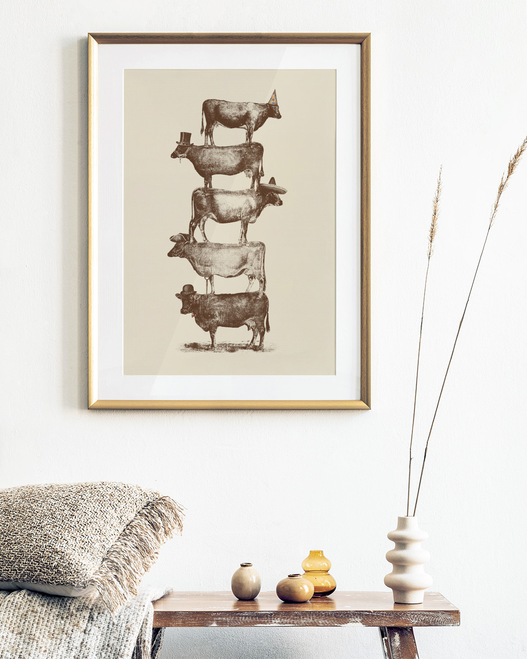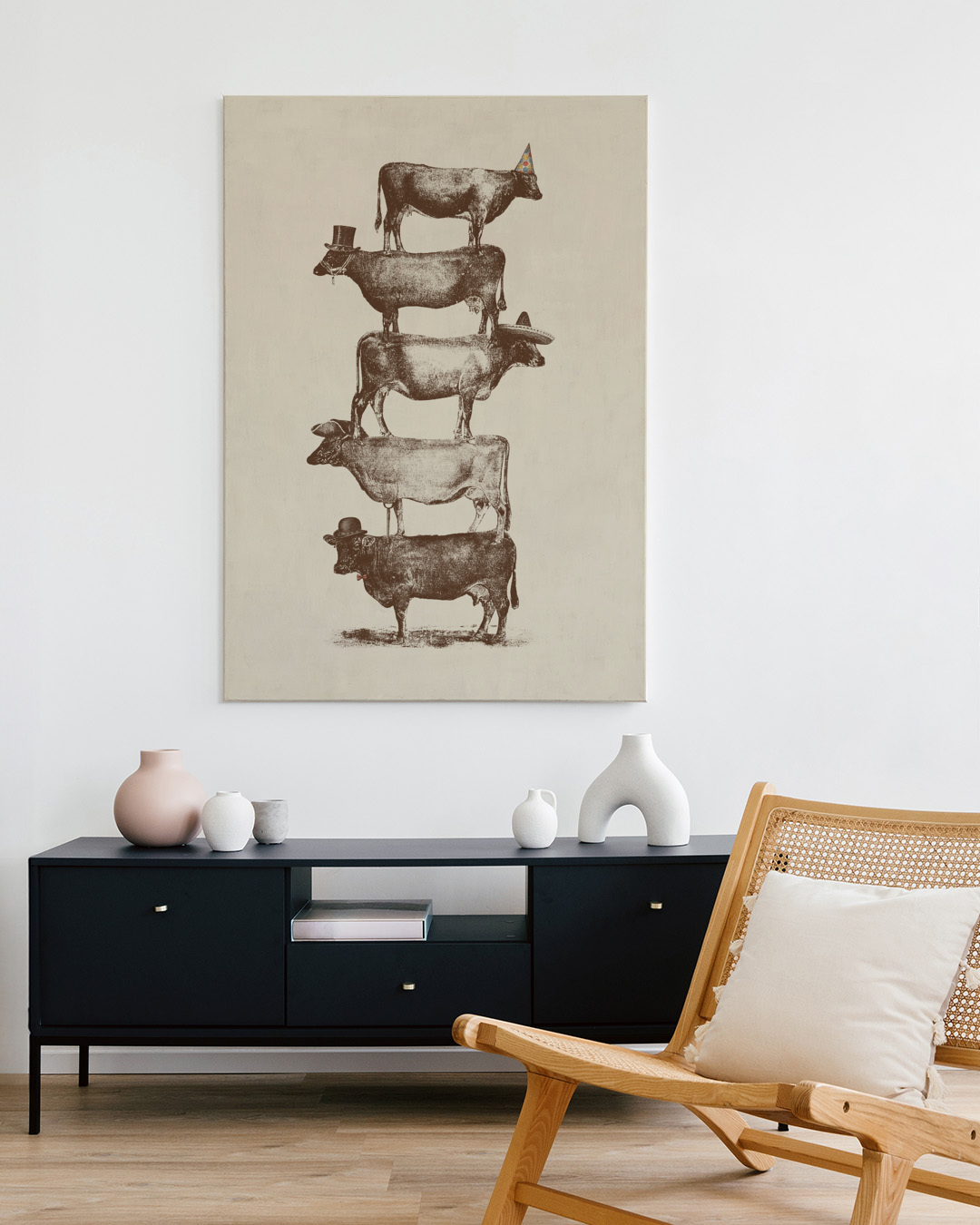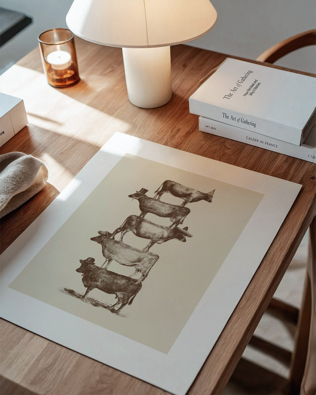 Florent Bodarts legende illustration viser stablede køer, hver med en sjov hat, mod en beige baggrund. Denne humoristiske fremstilling af husdyr tilføjer et legende strejf til ethvert rum.