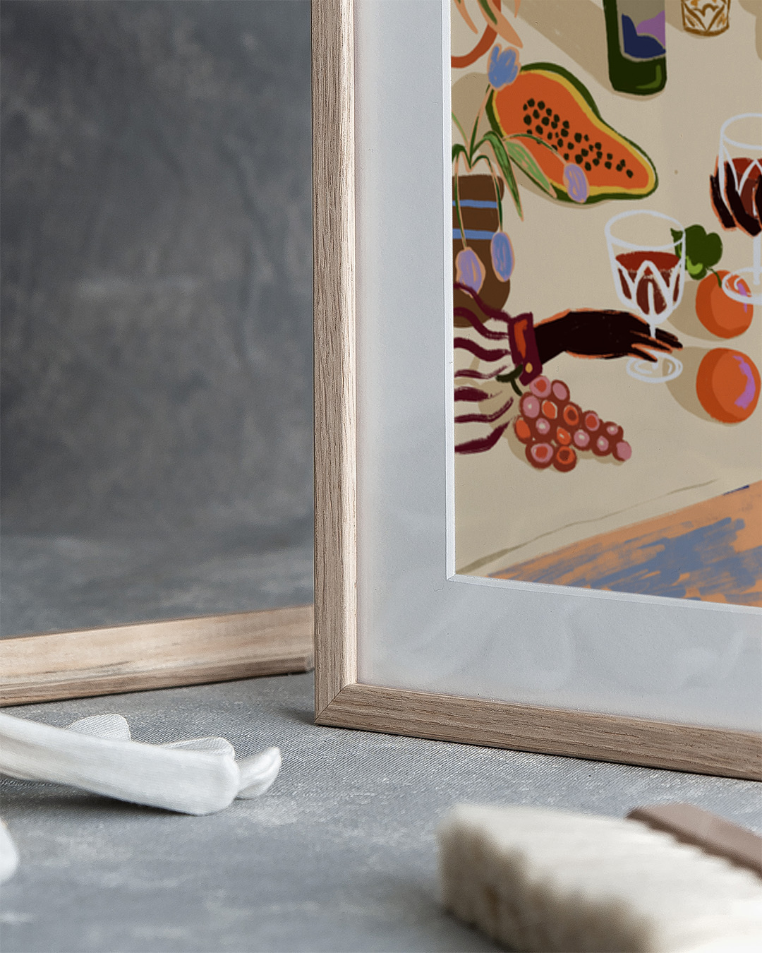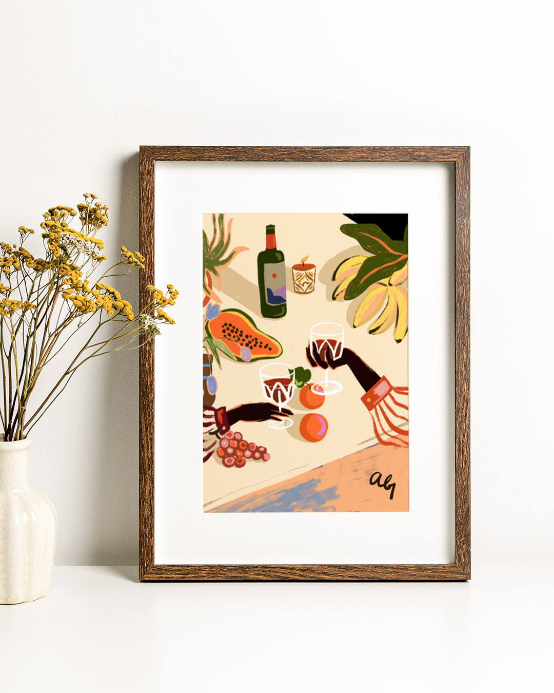 Nyd en livlig illustration af en tropisk samling. Denne charmerende scene med frisk frugt, vinglas og dristige gestus giver et muntert præg til ethvert rum.