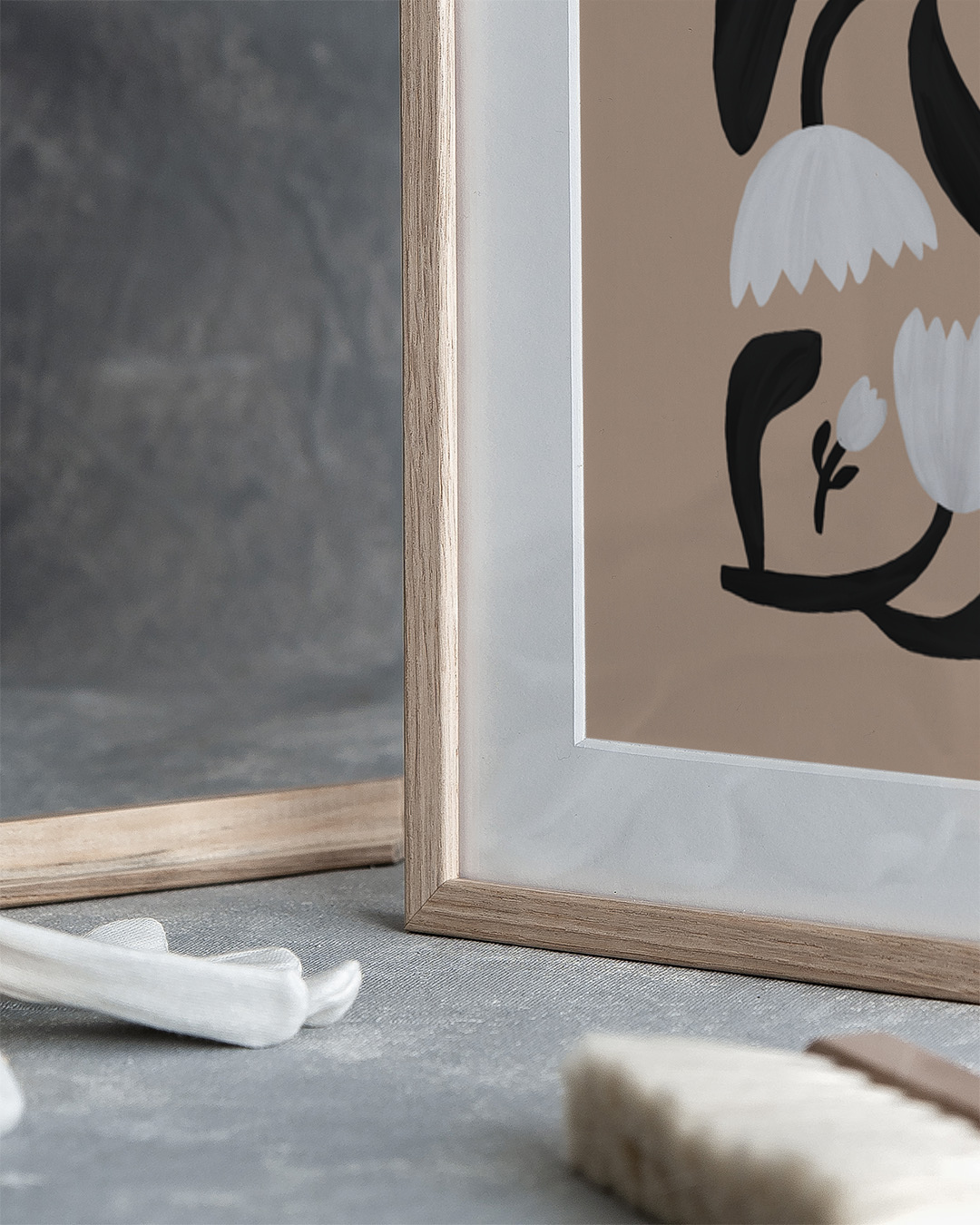 Den ekstra dybe og brede rammeprofil skaber stabilitet og et ægte blikfang på din væg. Håndlavet og afsluttet med et præcisionsskåret