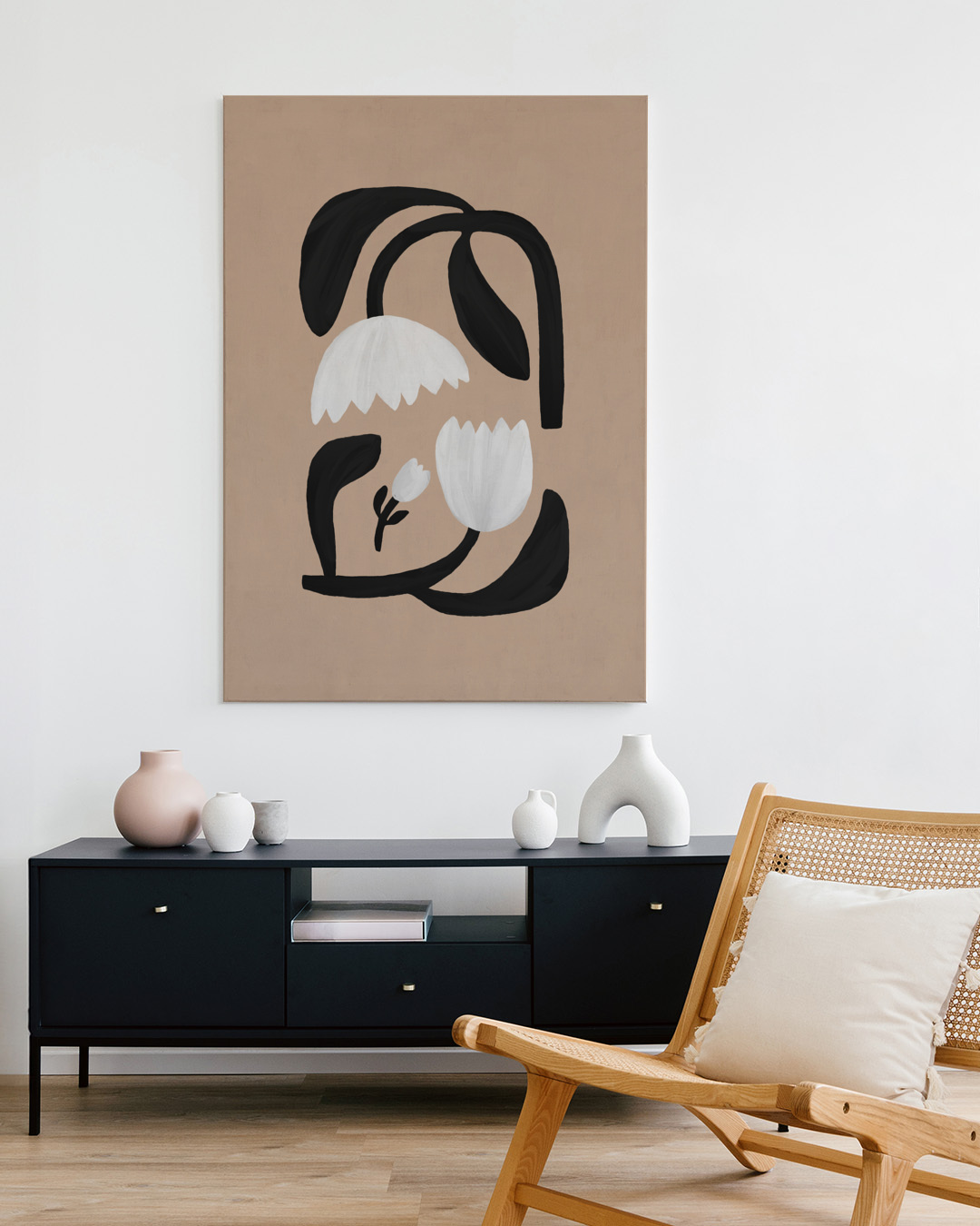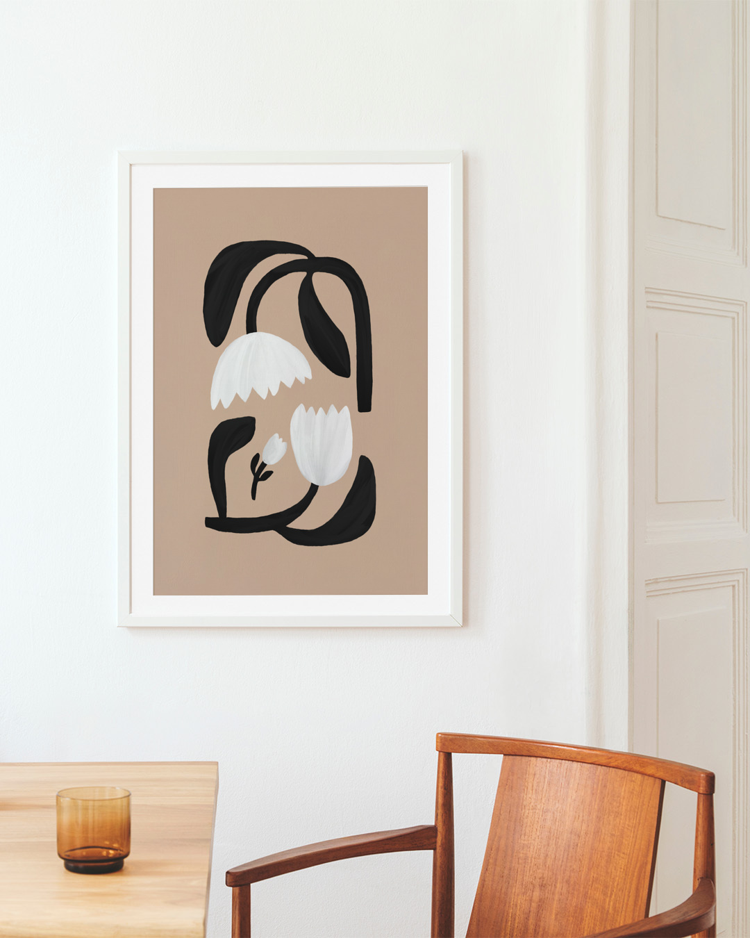 Denne minimalistiske botaniske illustration fremviser elegante sort-hvide blomster mod en blød beige baggrund.