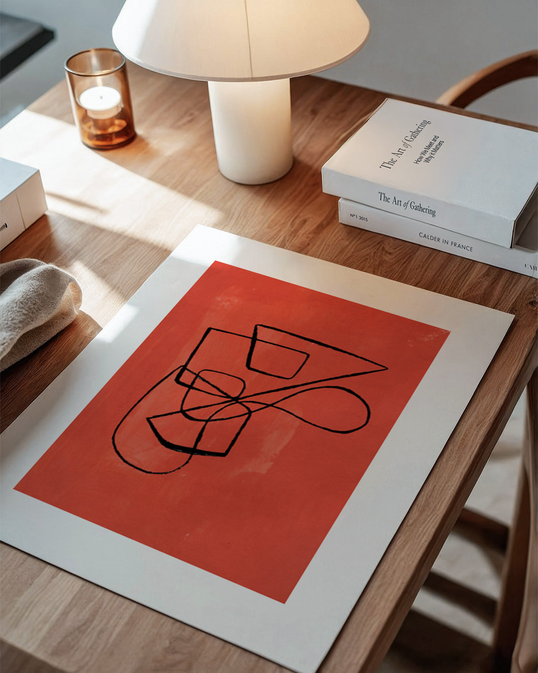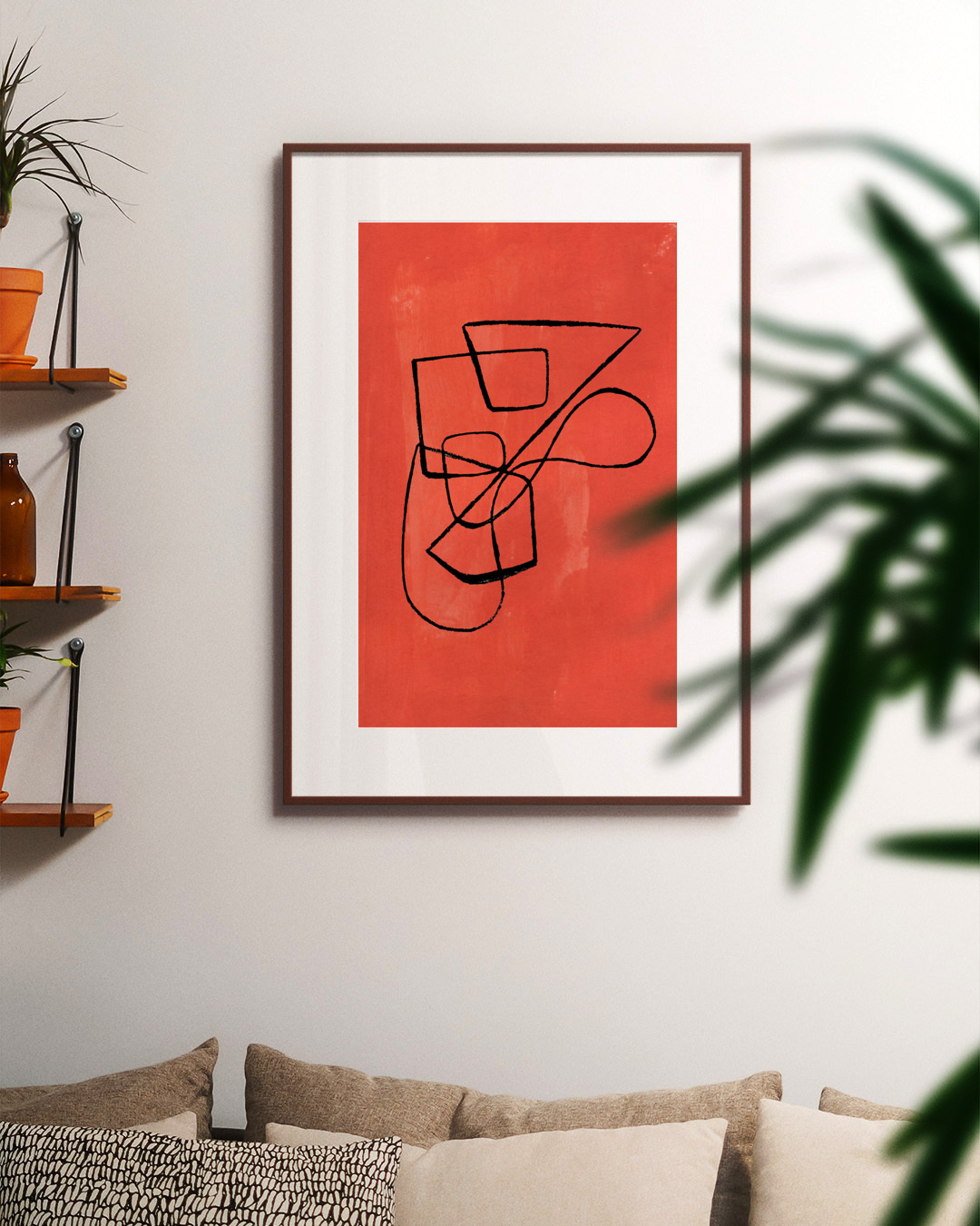 Ekspressiv abstrakt kunst med dynamiske sorte linjer mod en levende orange baggrund. Det indviklede spil af linjer skaber en følelse af bevægelse, hvilket gør det til en fængslende tilføjelse til moderne rum.