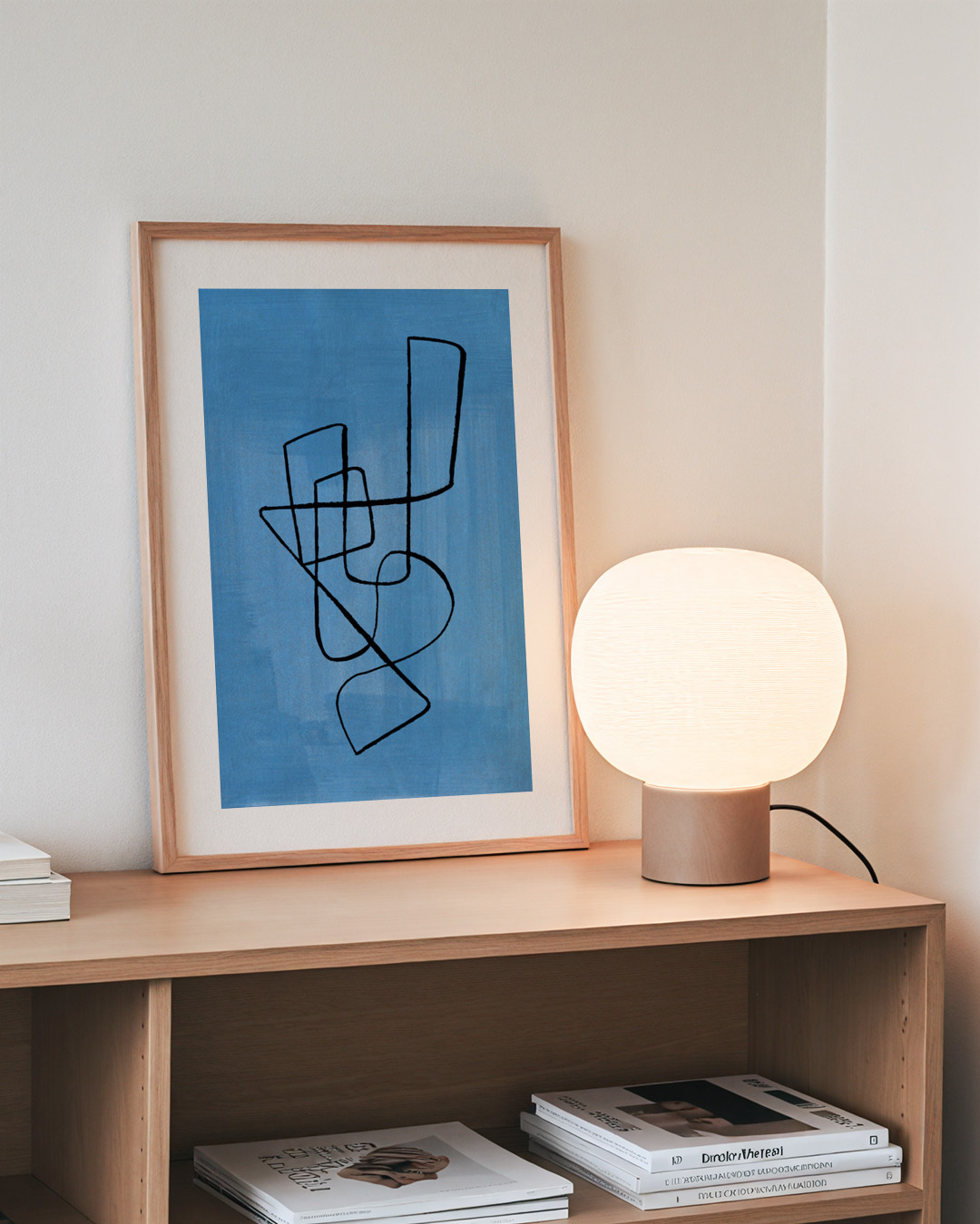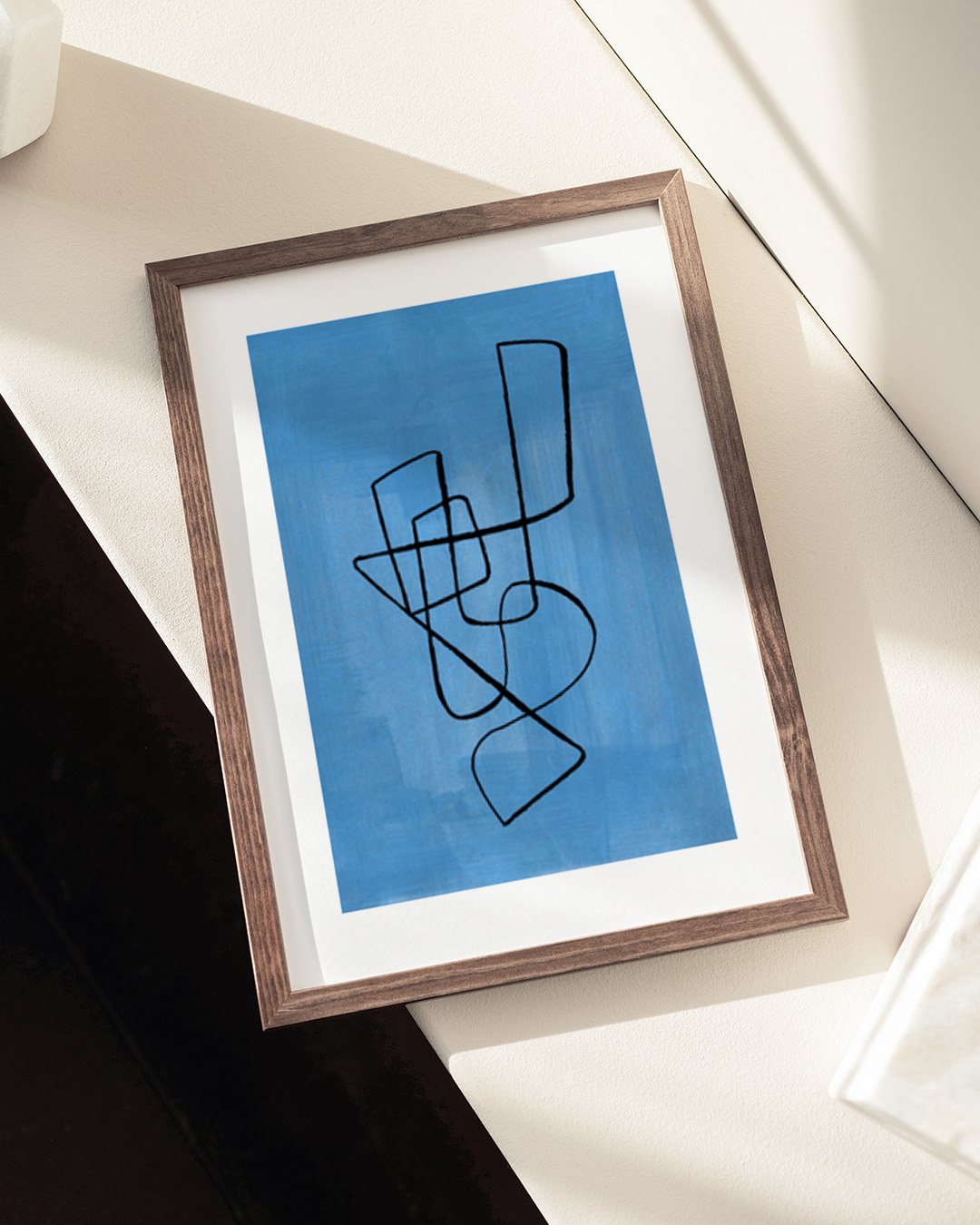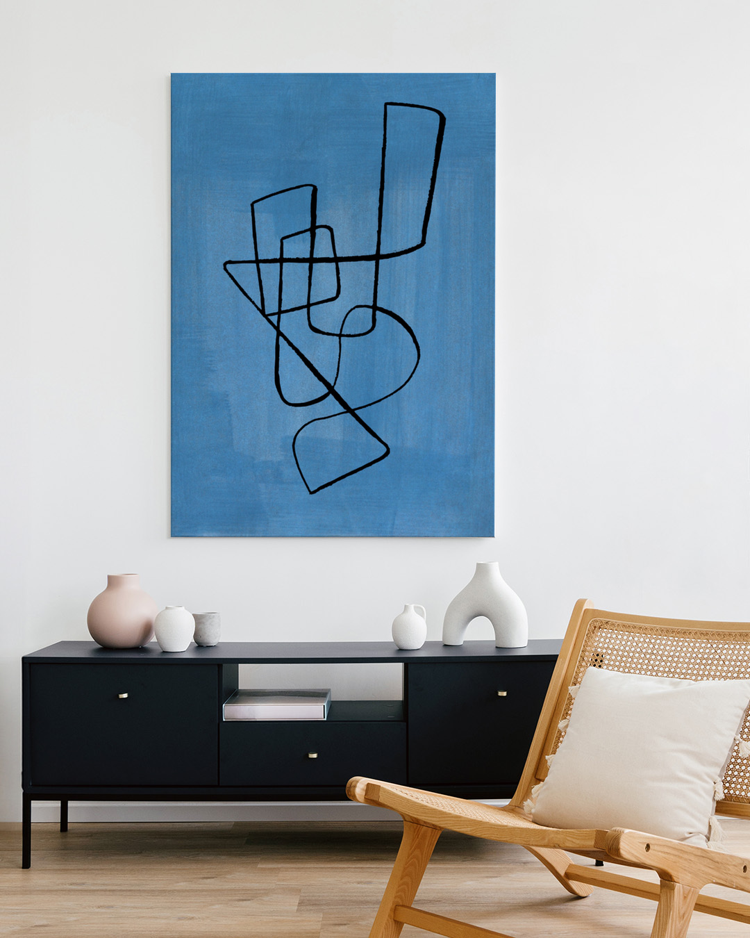 Et kunsttryk med flettede sorte linjer på en blød pastelblå baggrund, perfekt til at give modernitet til ethvert rum.
