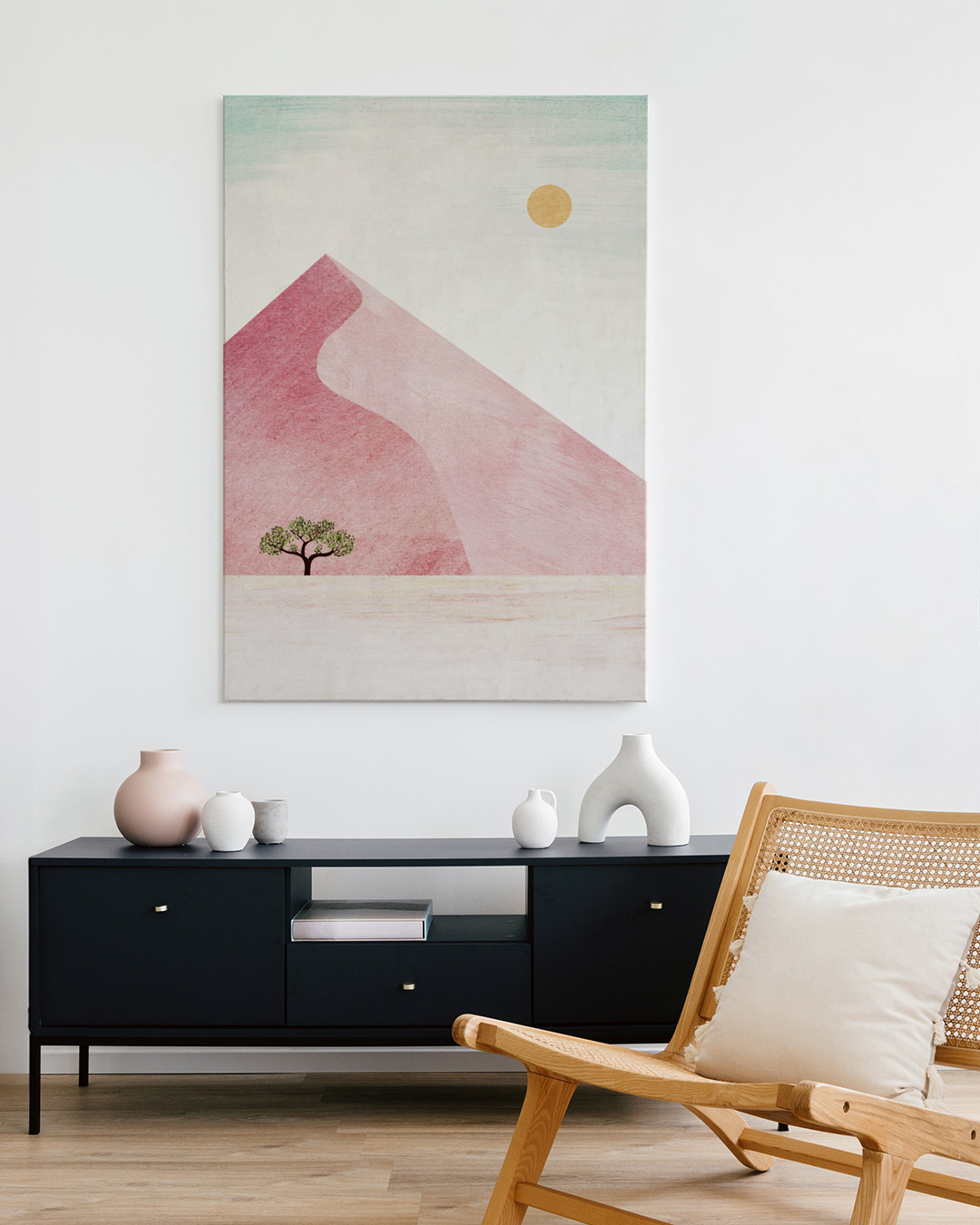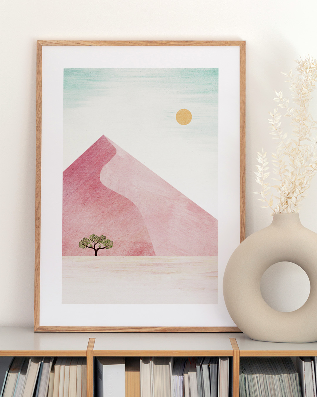 Udforsk Sossusvleis rolige skønhed med dette fascinerende kunstværk. Med de ikoniske klitter i lyserøde nuancer og et ensomt grønt træ under en middagssol fanger dette værk essensen af ørkenens ro.
