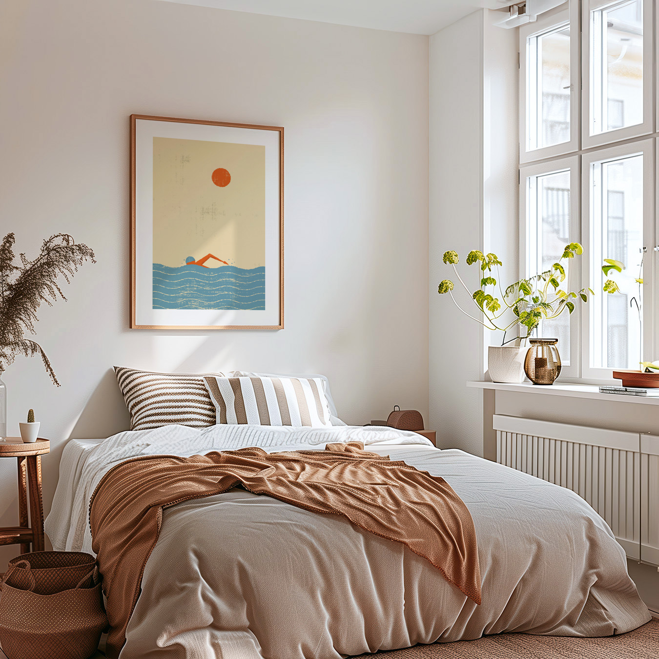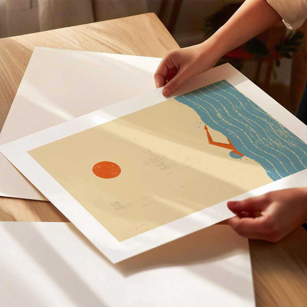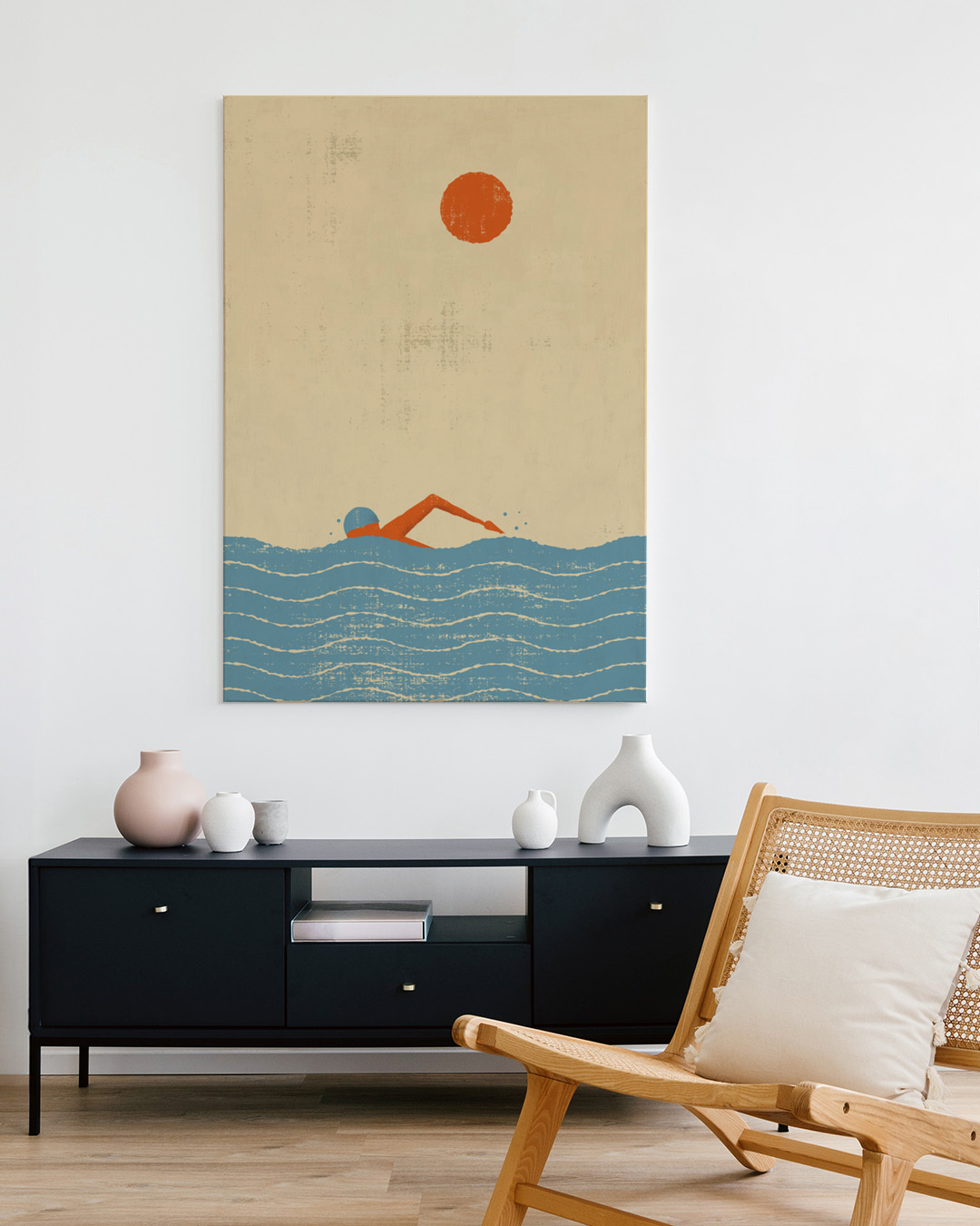 En fængslende illustration af Amer Karic med en svømmer, der skærer gennem det blå hav under en brændende rød sol. Denne livlige blanding af sport og kunst fanger bevægelse og energi med minimalistisk charme.