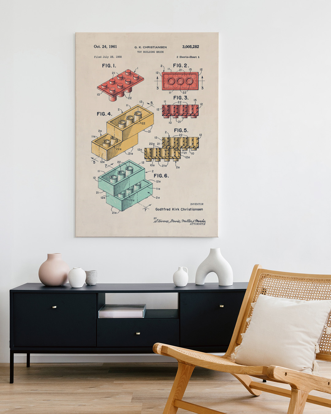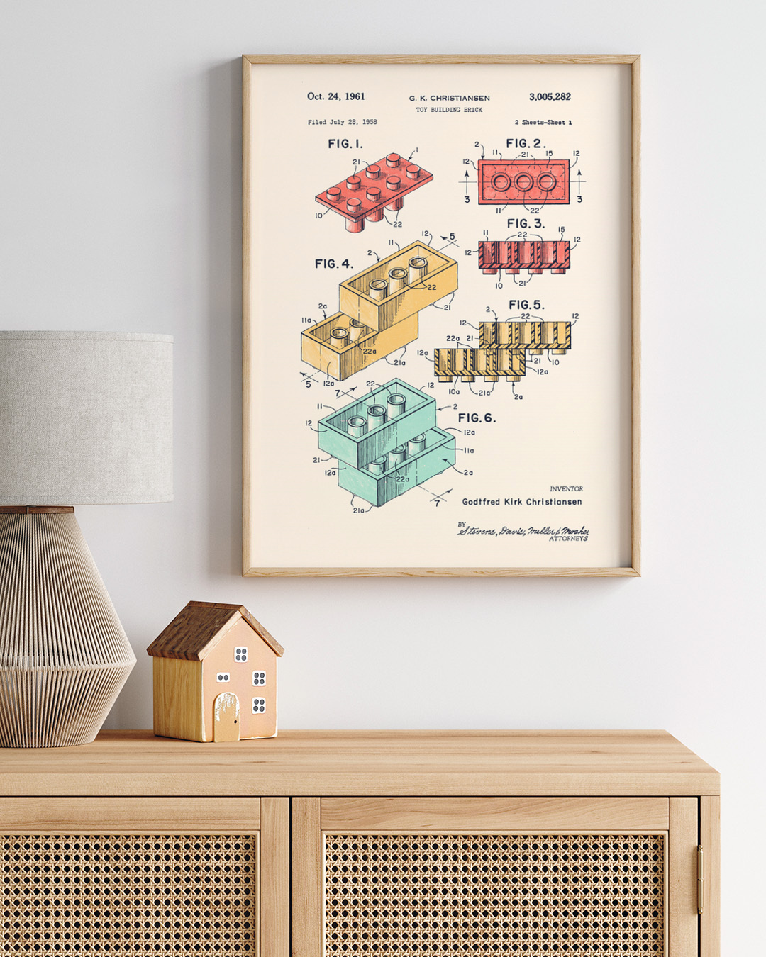 Gå på opdagelse i tiden med denne charmerende vintage plan over en legoklods. De detaljerede grafiske detaljer bringer nostalgi til ethvert rum og fejrer kreativitetens og legens arv.