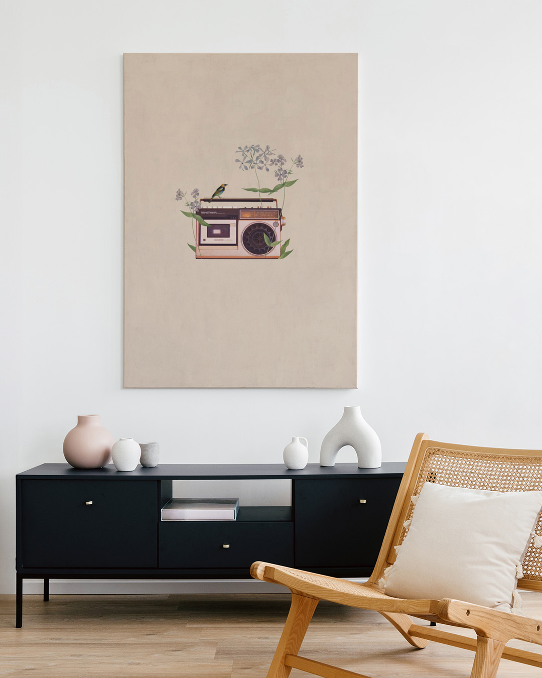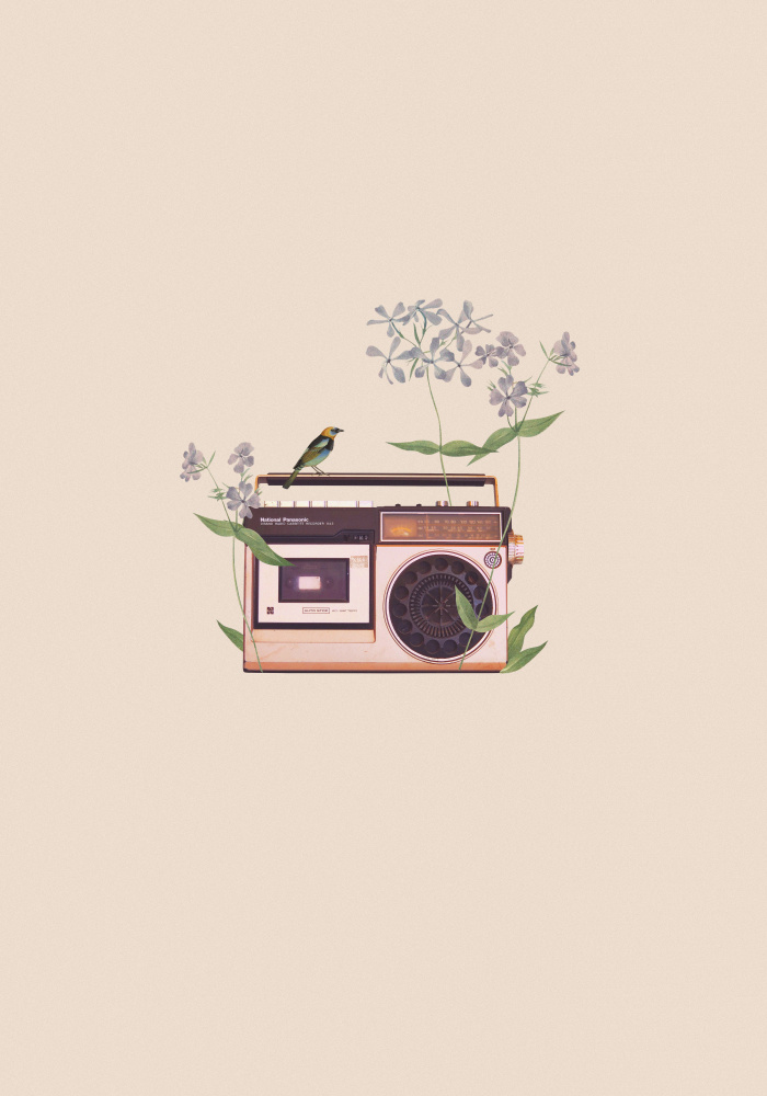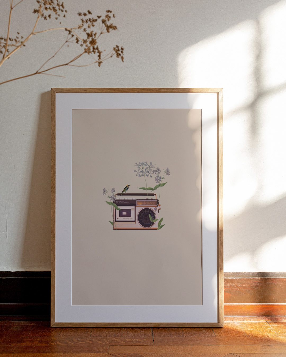 Et charmerende kunstværk fra Frida Floral Studio med en vintage radio pyntet med blomster og en lille fugl, der forener nostalgi og natur.