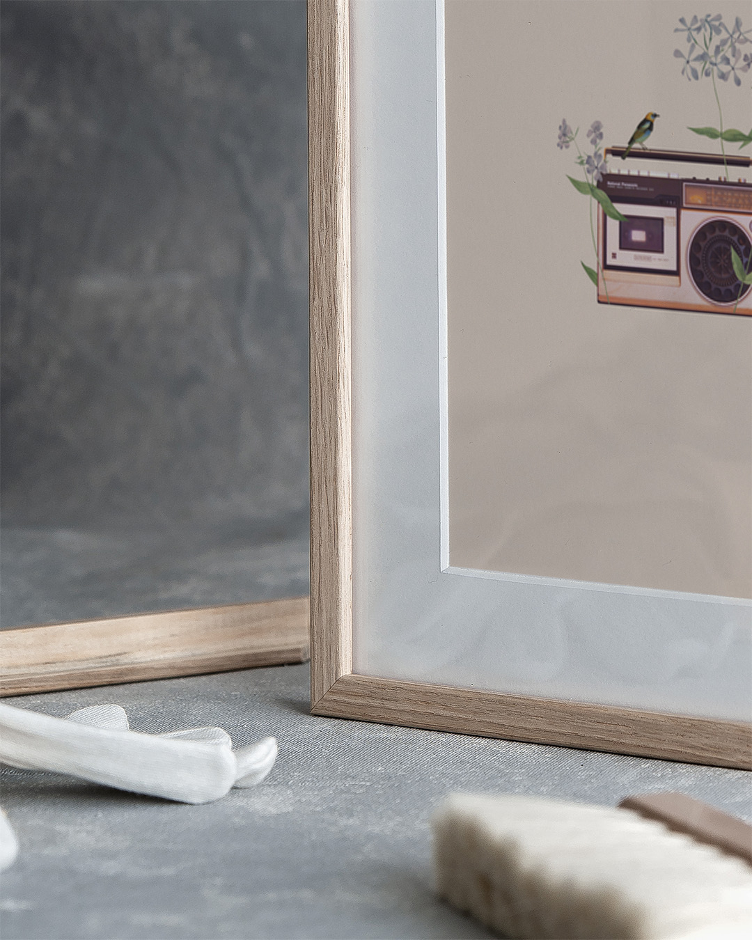 Den ekstra dybe og brede rammeprofil skaber stabilitet og et ægte blikfang på din væg. Håndlavet og afsluttet med et præcisionsskåret