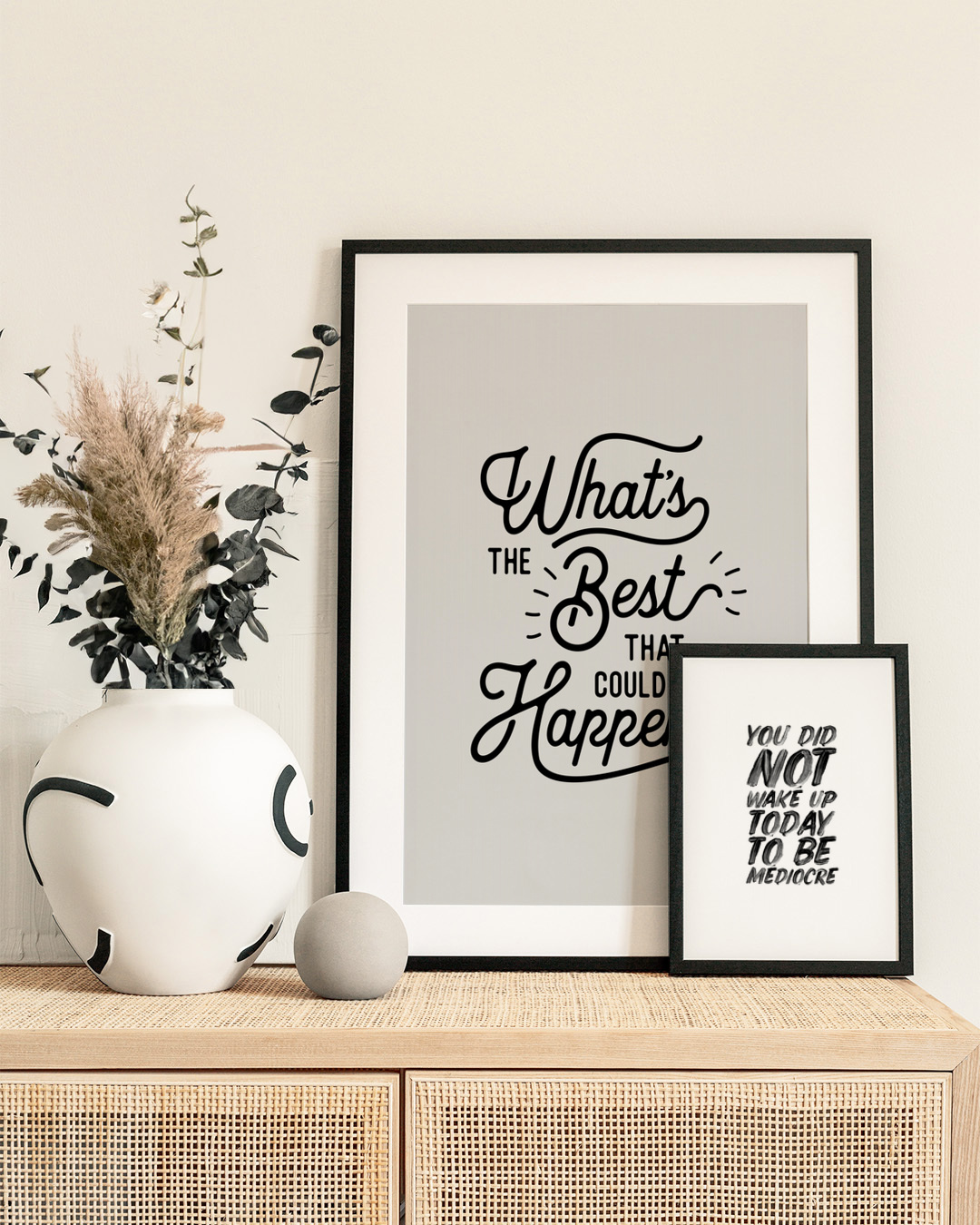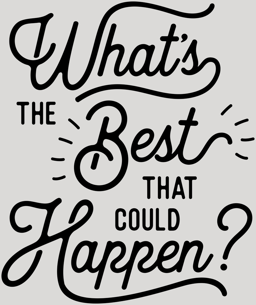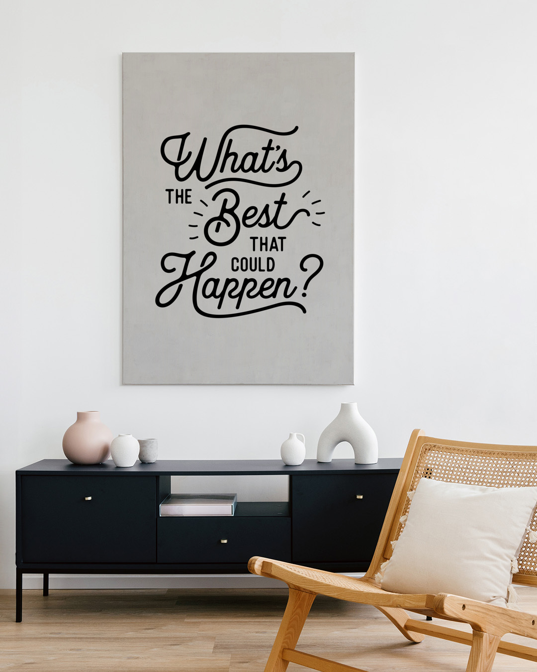 Denne iøjnefaldende typografi af Brett Wilson stiller det inspirerende spørgsmål: 'What's the Best That Could Happen?' i en stilfuld skrifttype, perfekt til at motivere ethvert rum.