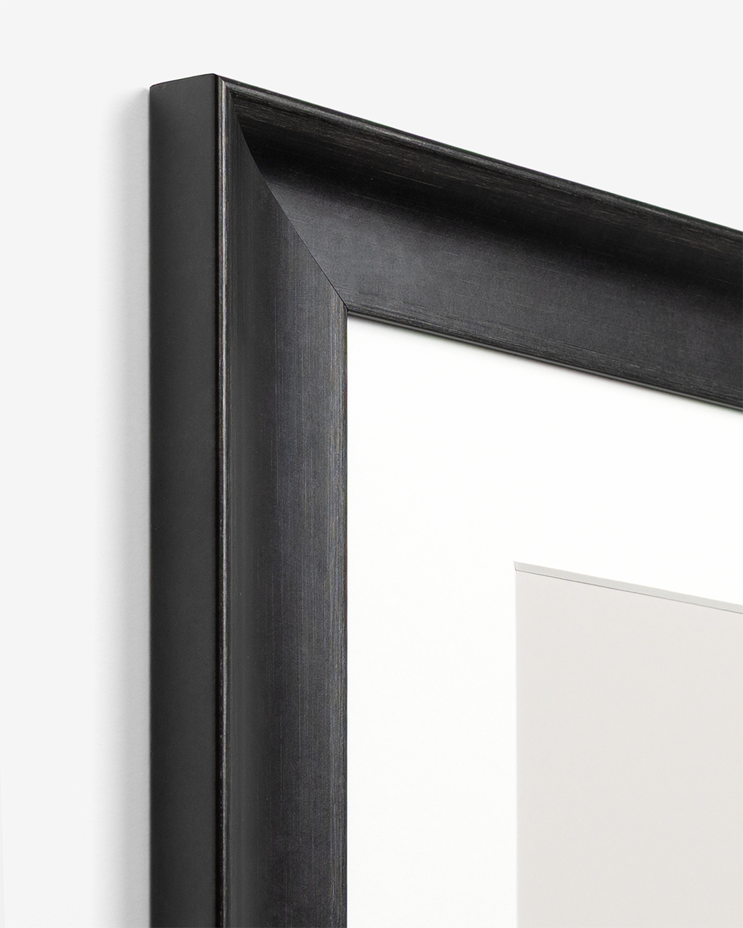 A versatile collection, each frame with its own unique details and profile. Elegant and wide wooden frame with a gently inward-curved profile and an anthracite-colored finish.