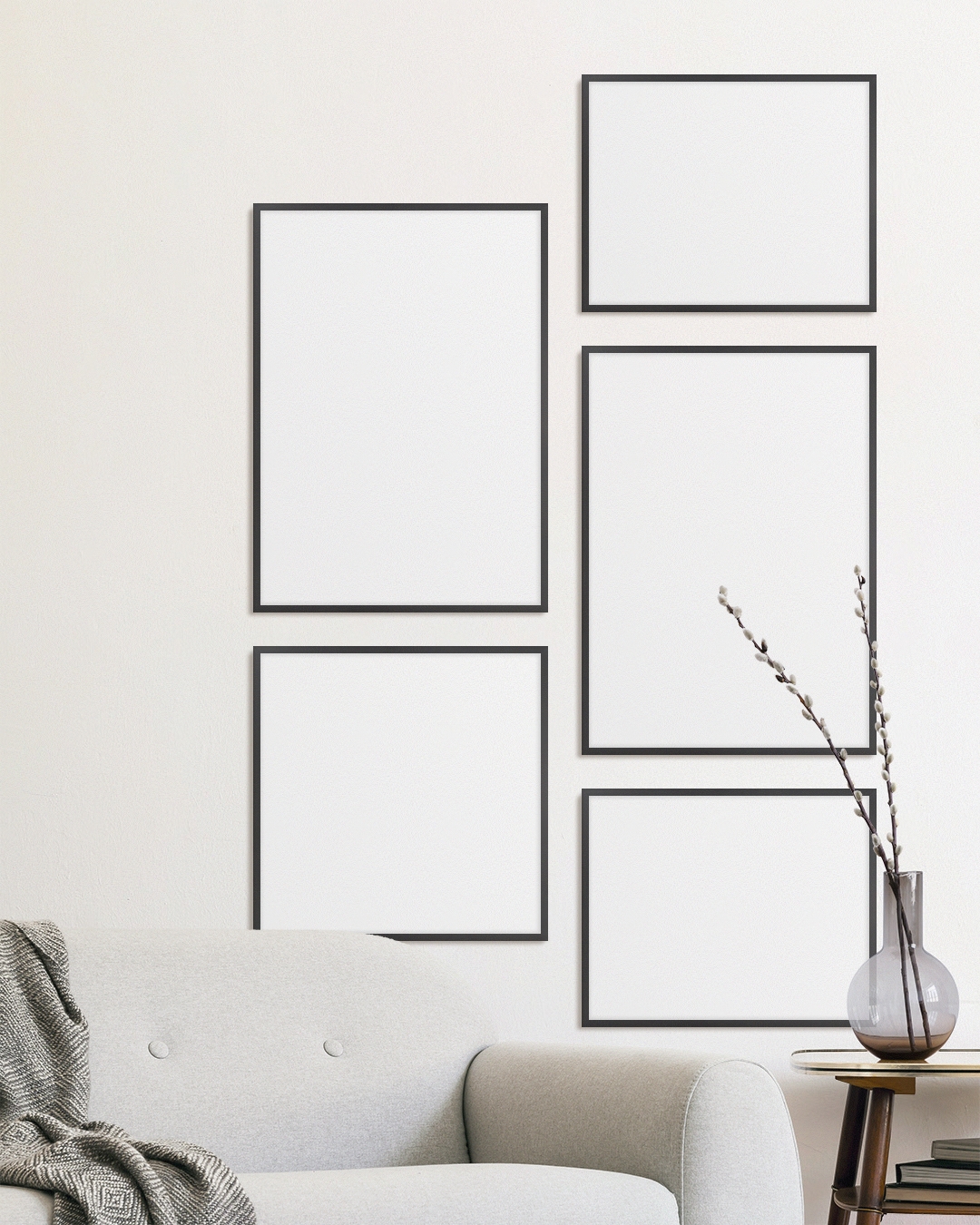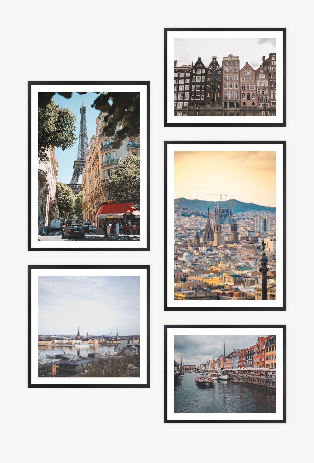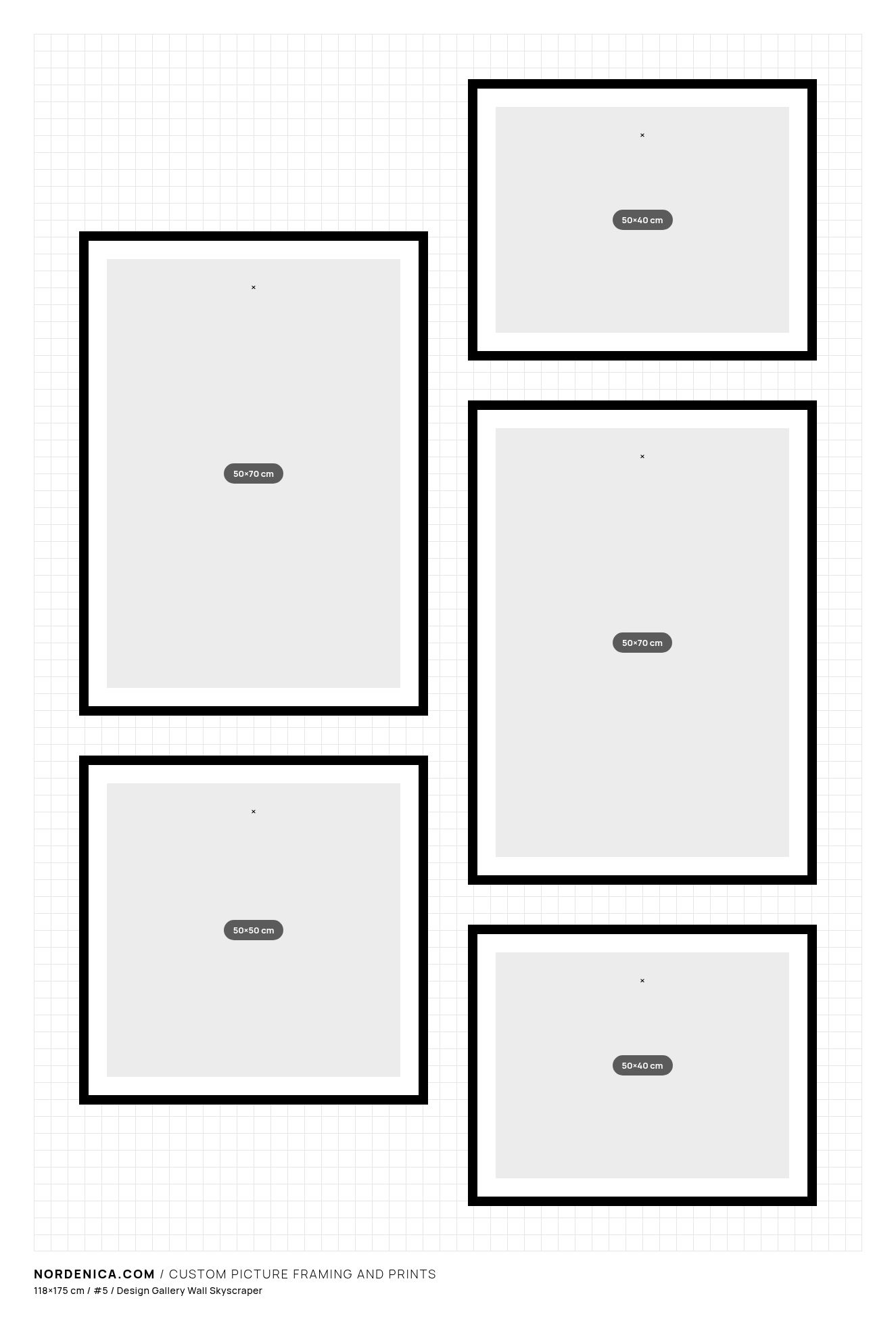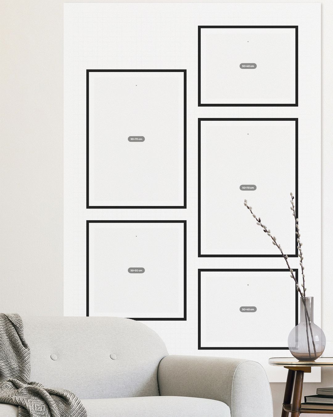 A photo wall featuring 5 framed photos in 3 different sizes. Select from a variety of frame profiles, passepartout options, and add-ons. Customise the layout to your preference.