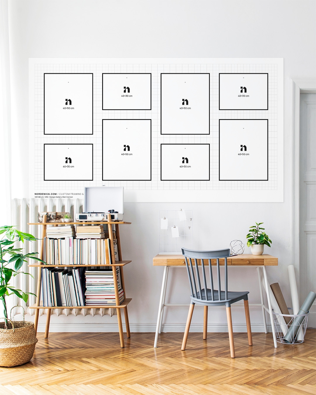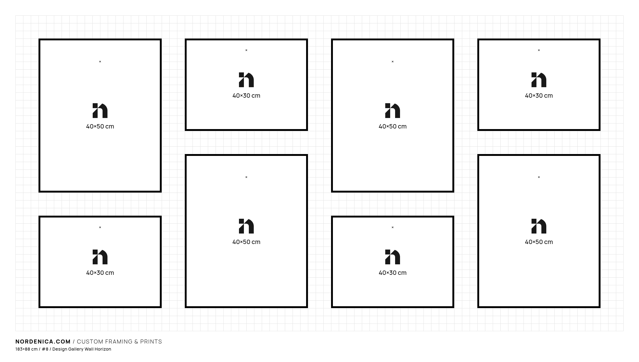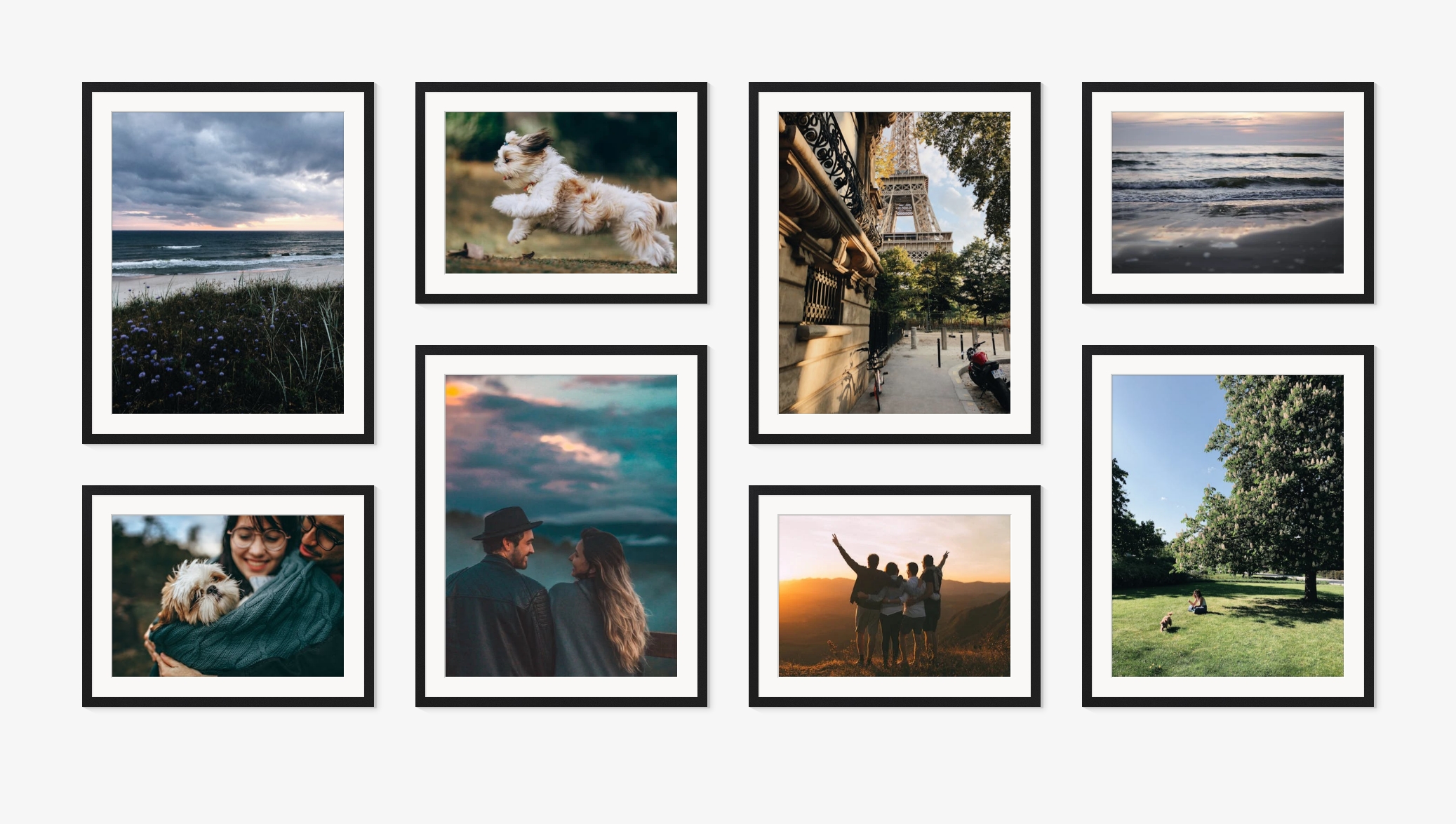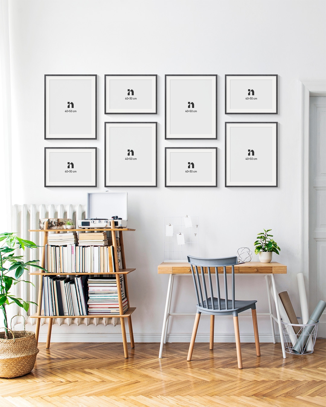 A photo wall featuring 8 framed photos in 2 different sizes. Select from a variety of frame profiles, passepartout options, and add-ons. Customise the layout to your preference.
