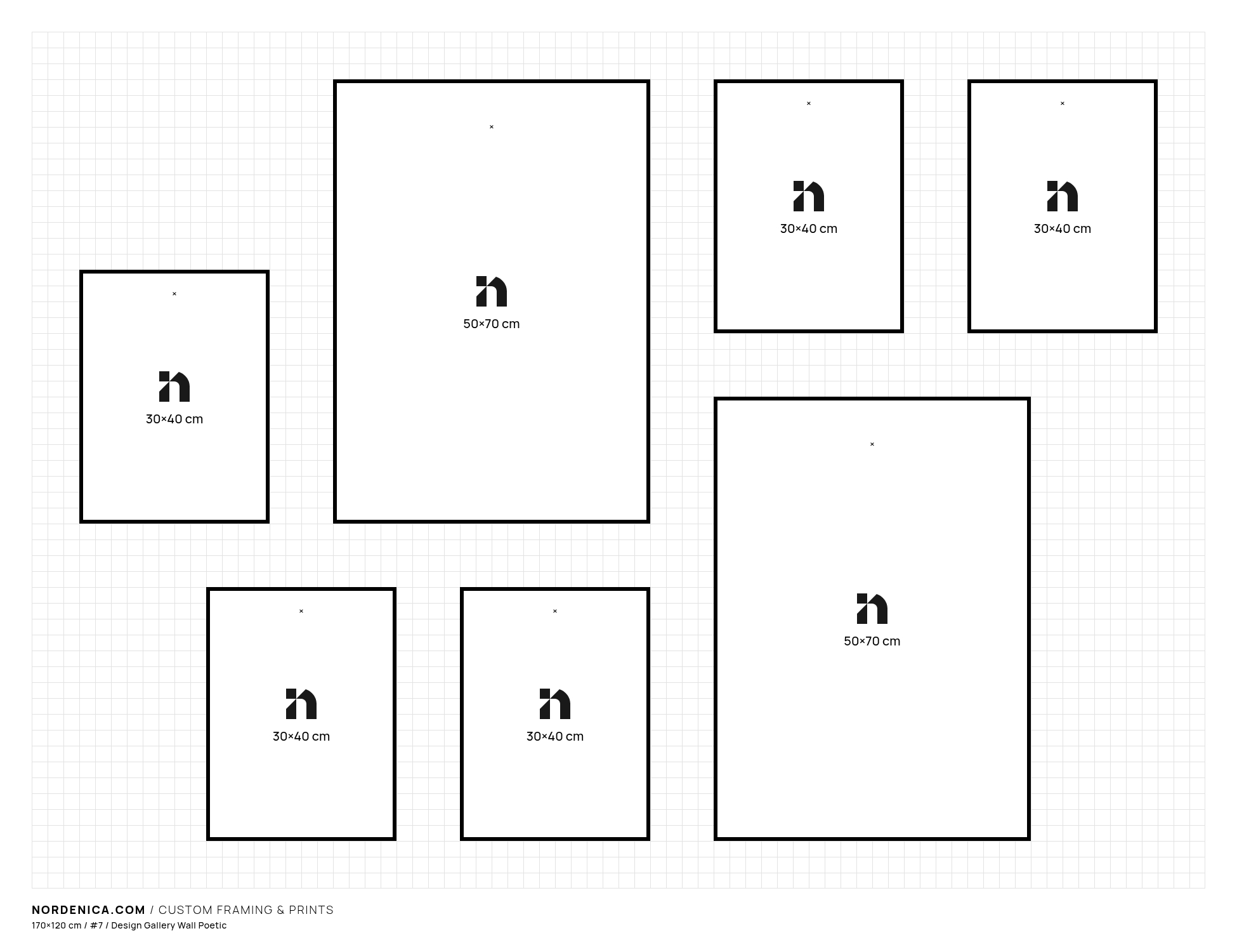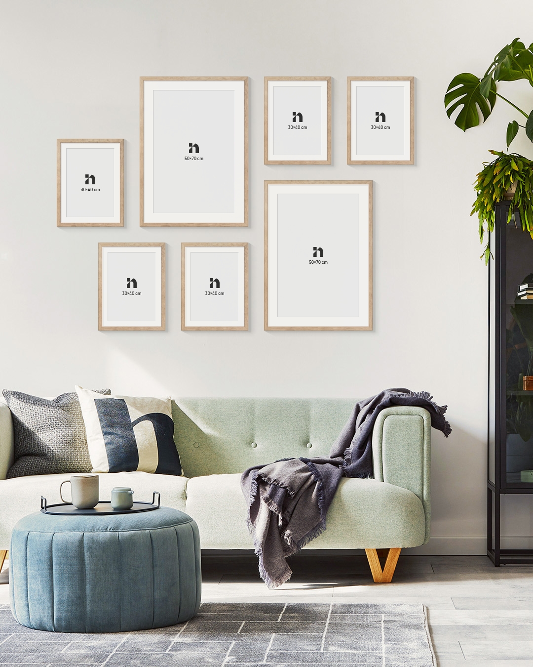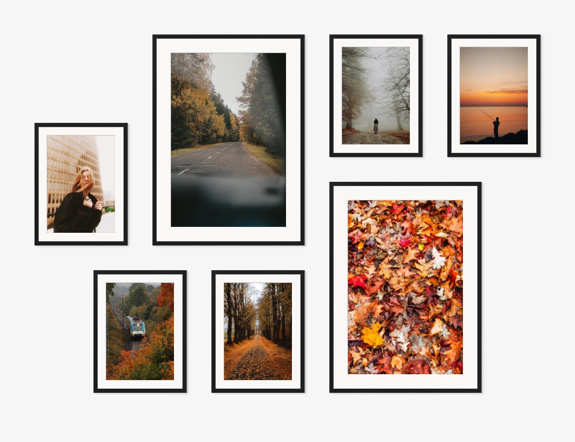 A photo wall featuring 7 framed photos in 2 different sizes. Select from a variety of frame profiles, passepartout options, and add-ons. Customise the layout to your preference.