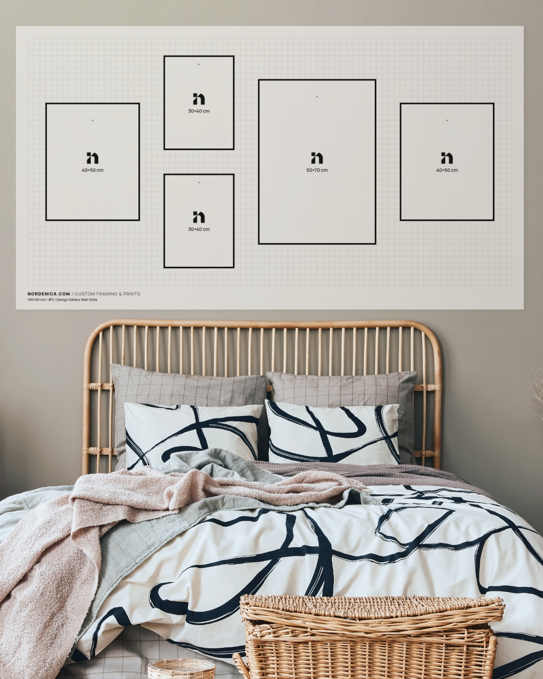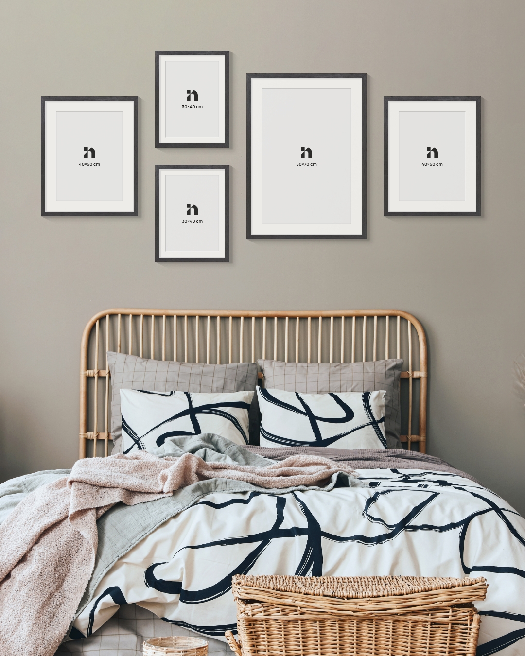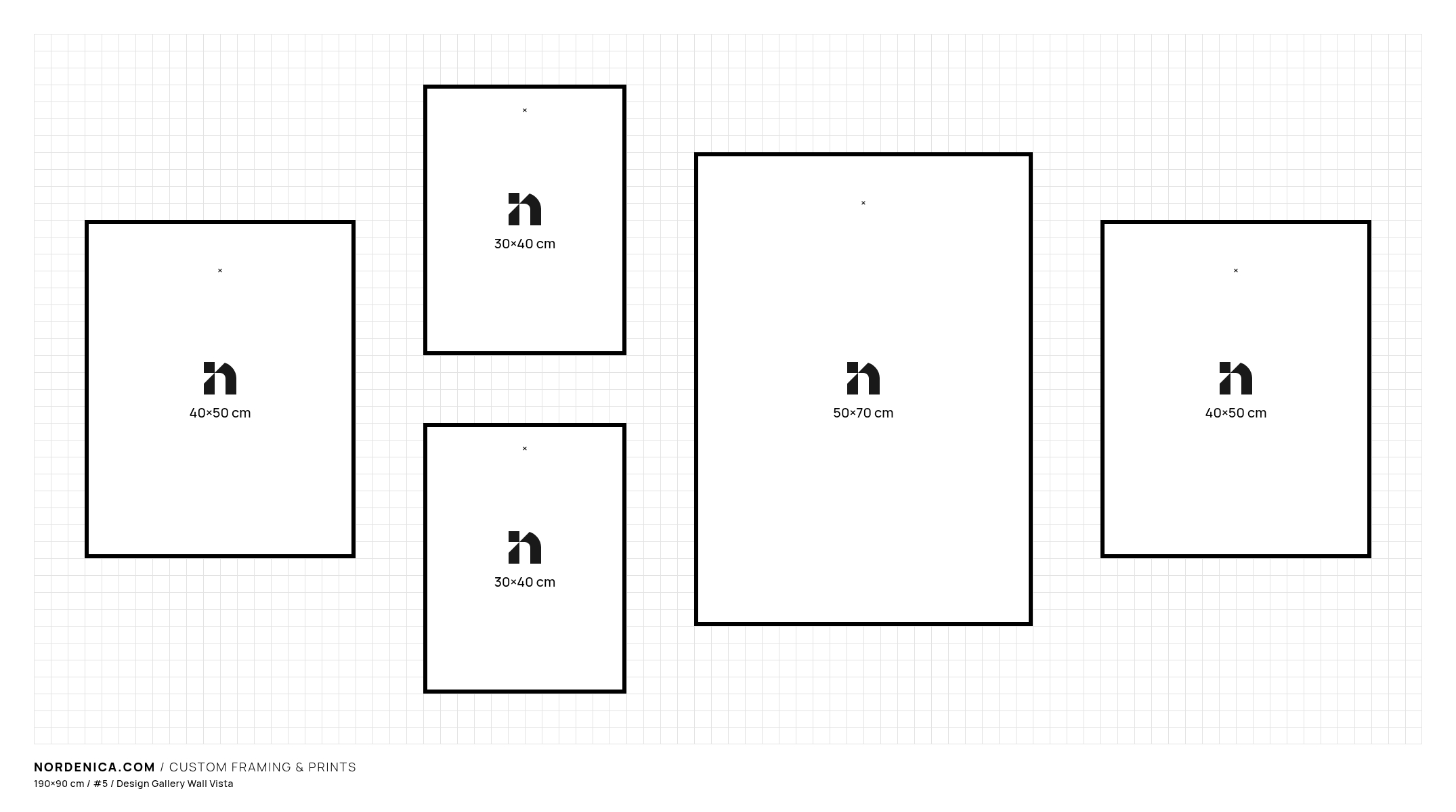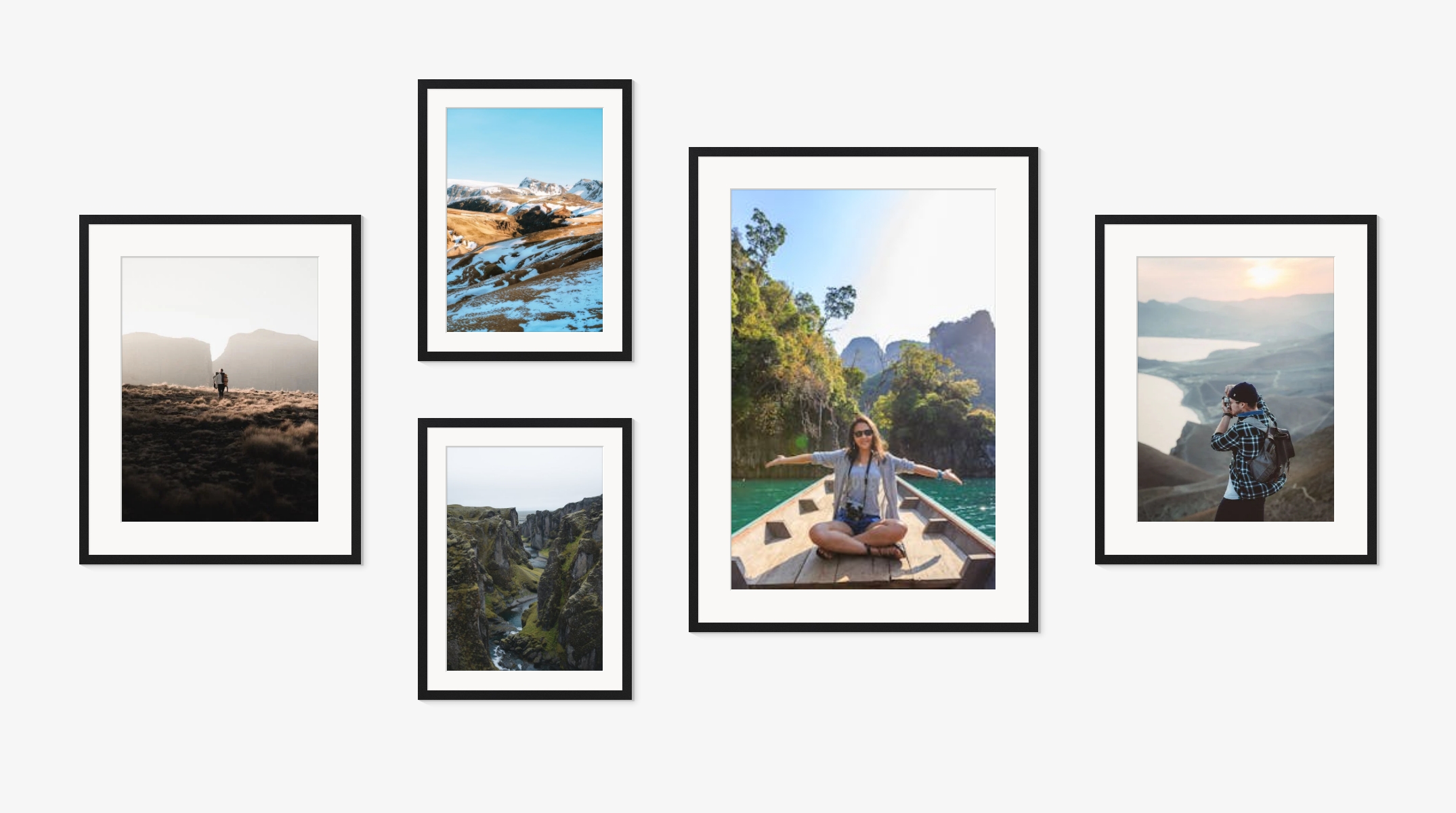 A photo wall featuring 5 framed photos in 3 different sizes. Select from a variety of frame profiles, passepartout options, and add-ons. Customise the layout to your preference.