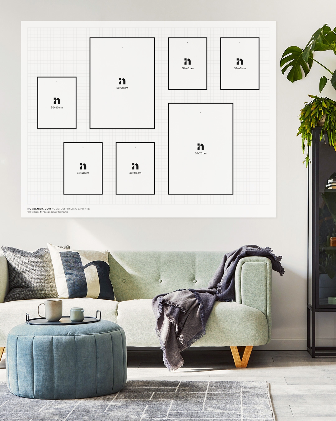 A gallery wall featuring 7 framed prints in 2 different sizes. Select from a variety of frame profiles and add-ons. Customize further by changing the artwork or layout.