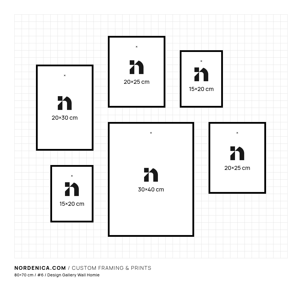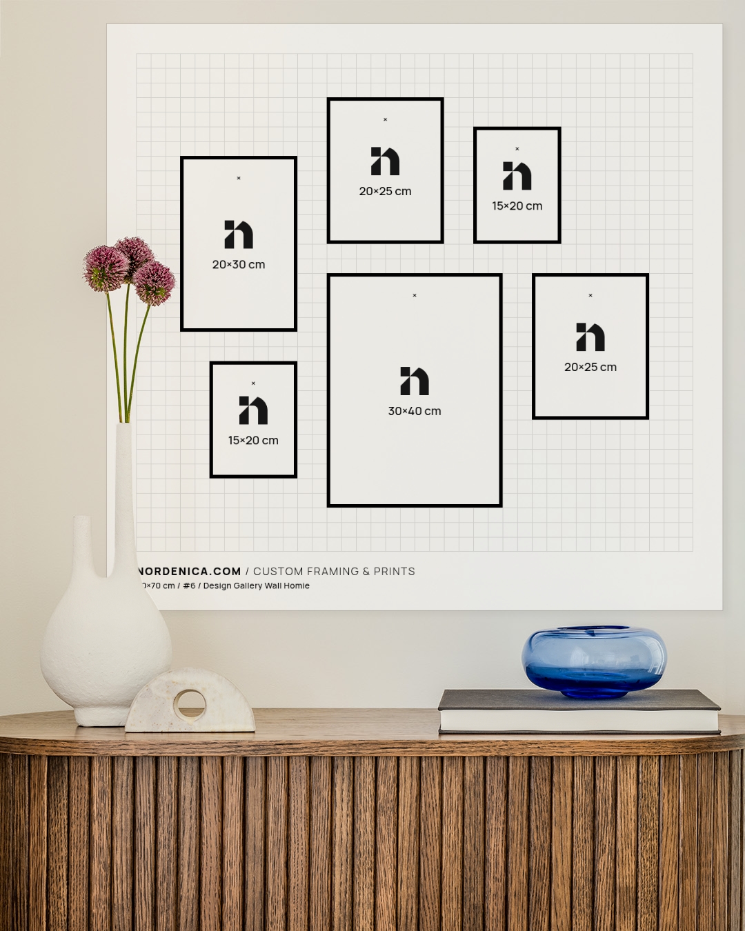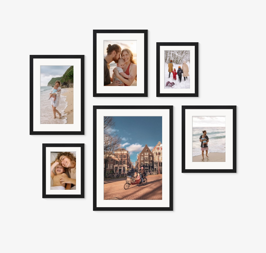 Een fotomuur met 6 ingelijste foto’s in 4 verschillende maten. Kies uit diverse lijstprofielen, passepartout-opties en extra's. Pas de lay-out aan zoals je wilt.