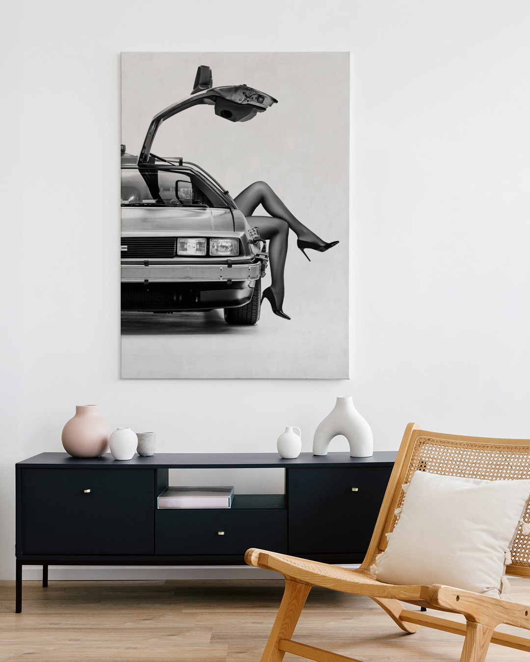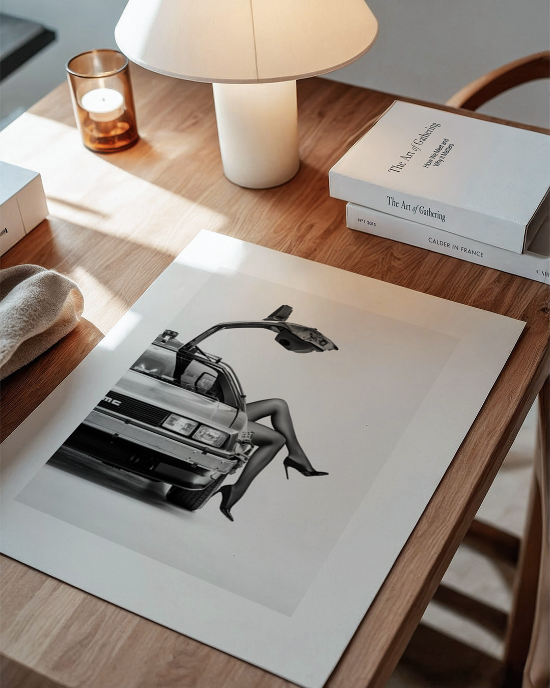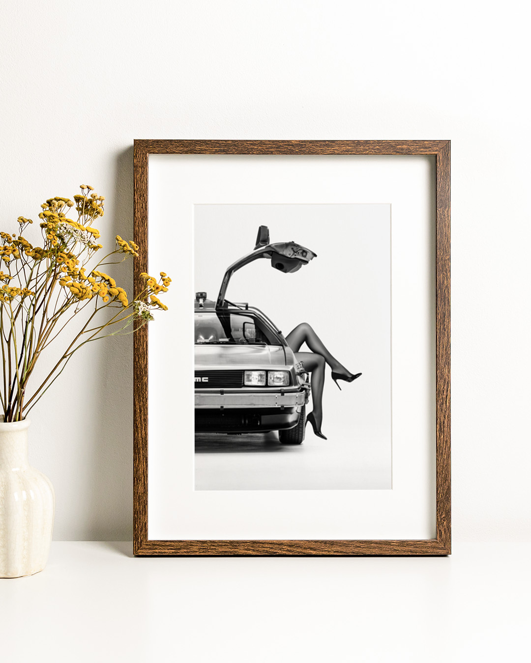 Een opvallende zwart-witfoto met de iconische DeLorean-auto uit 'Terug naar de toekomst' naast elegante vrouwenbenen in hoge hakken, die retrostijl combineren met een moderne verklaring.