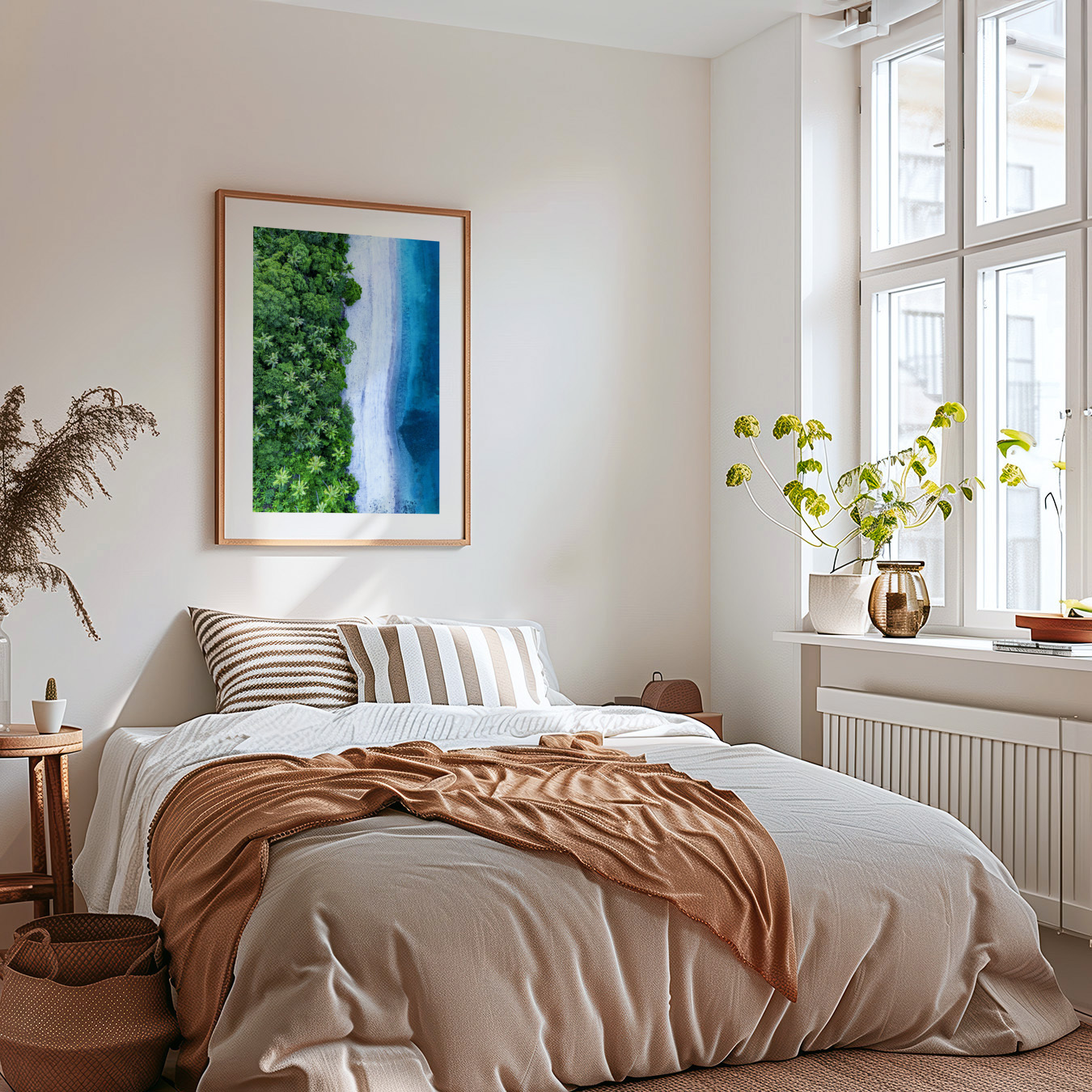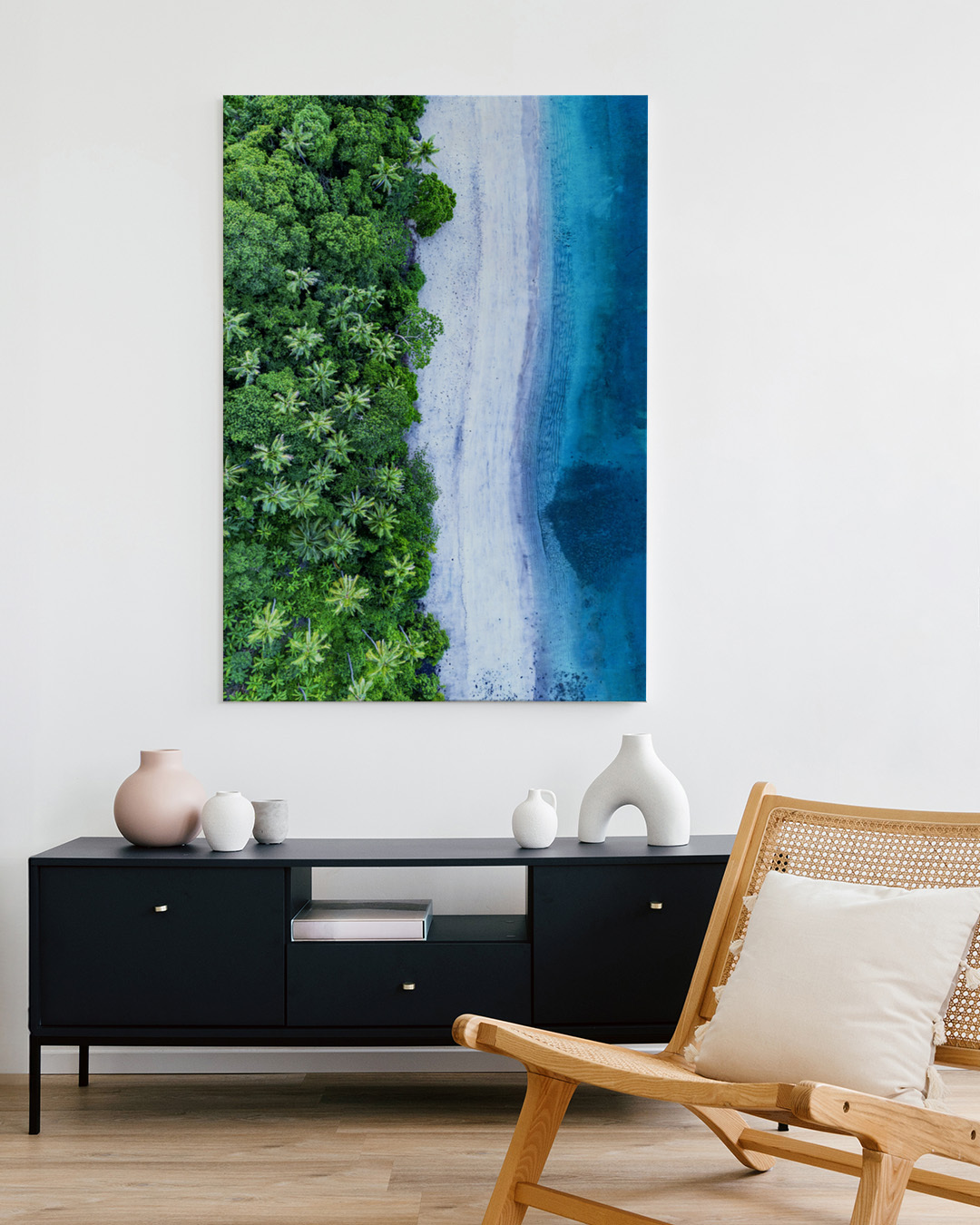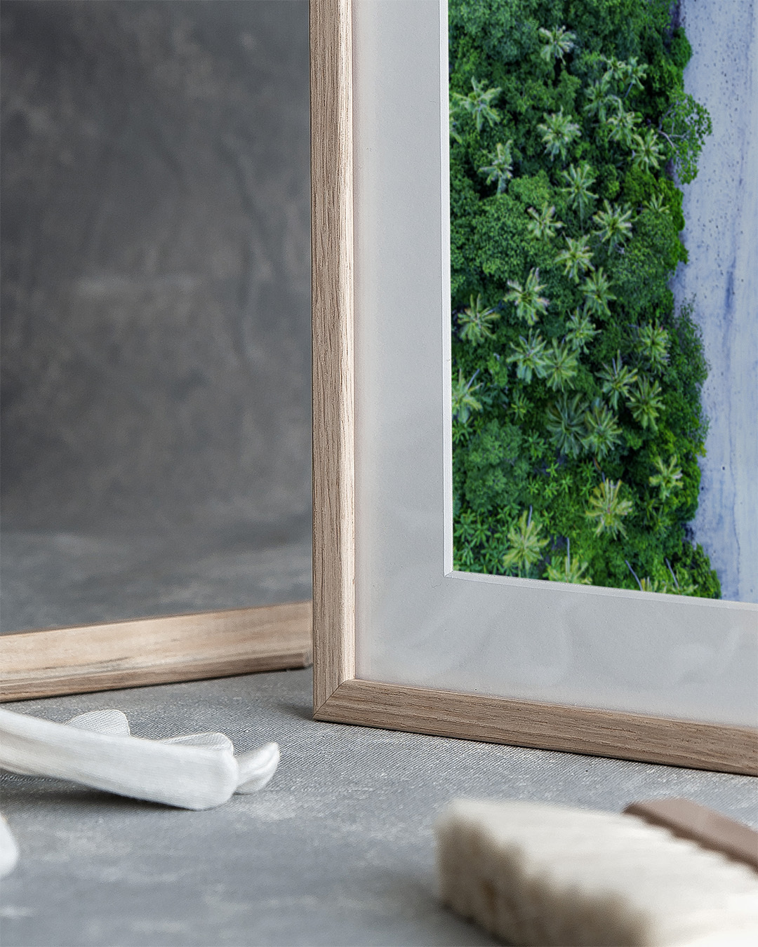Het gespannen canvas wordt gemonteerd in een stijlvolle baklijst van echt hout voor een elegante uitstraling en extra dimensie. De ruimte tussen het canvas en de lijst creëert een zwevend effect.