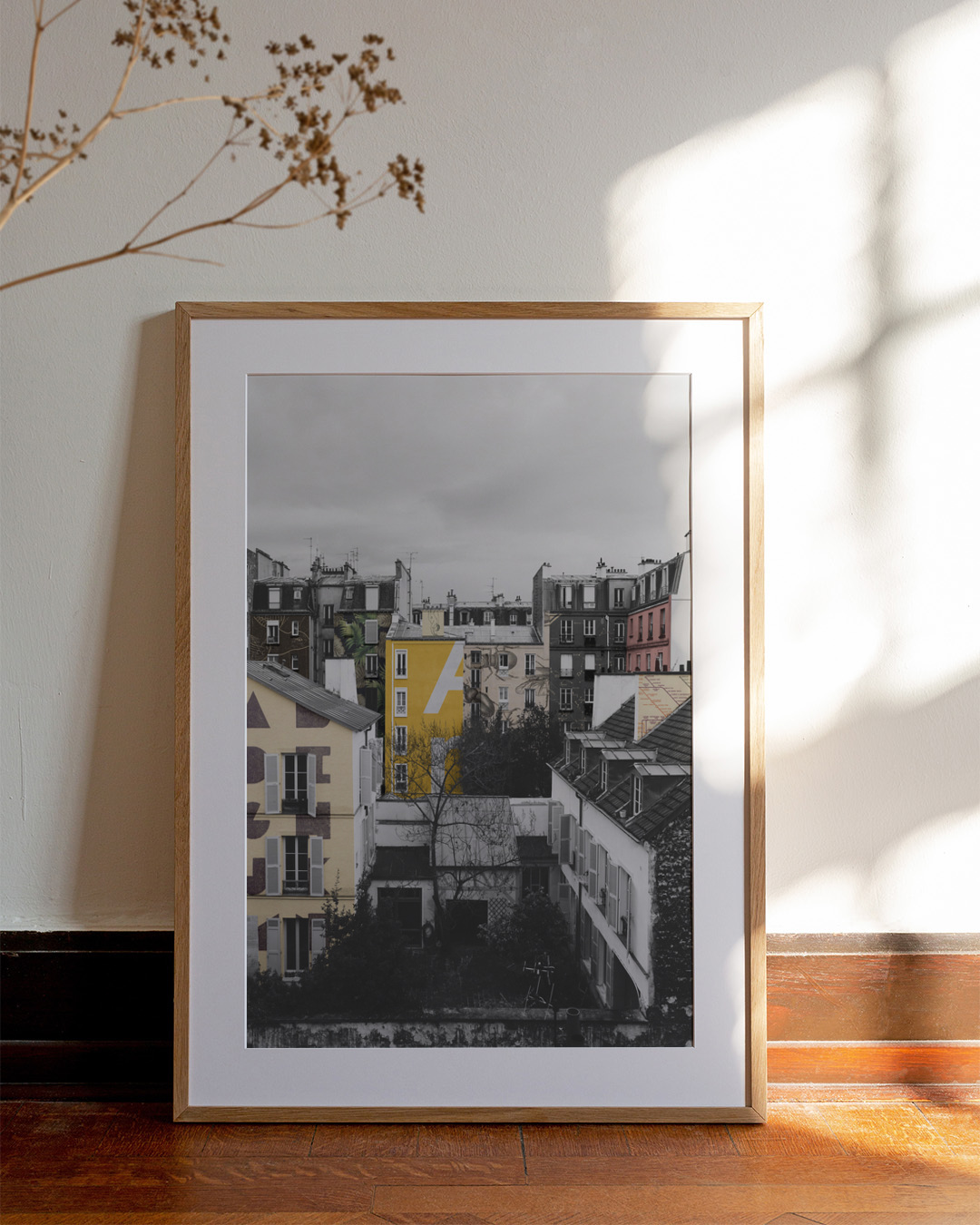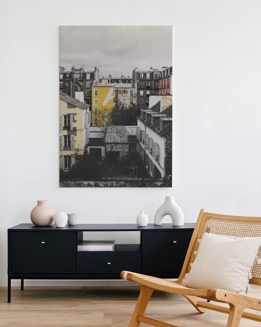 Vang de essentie van Parijs met deze prachtige foto van charmante gevels in levendig geel temidden van een monochroom stadsgezicht. Een opvallend stuk voor liefhebbers van stedelijke architectuur en iconische stadsgezichten.