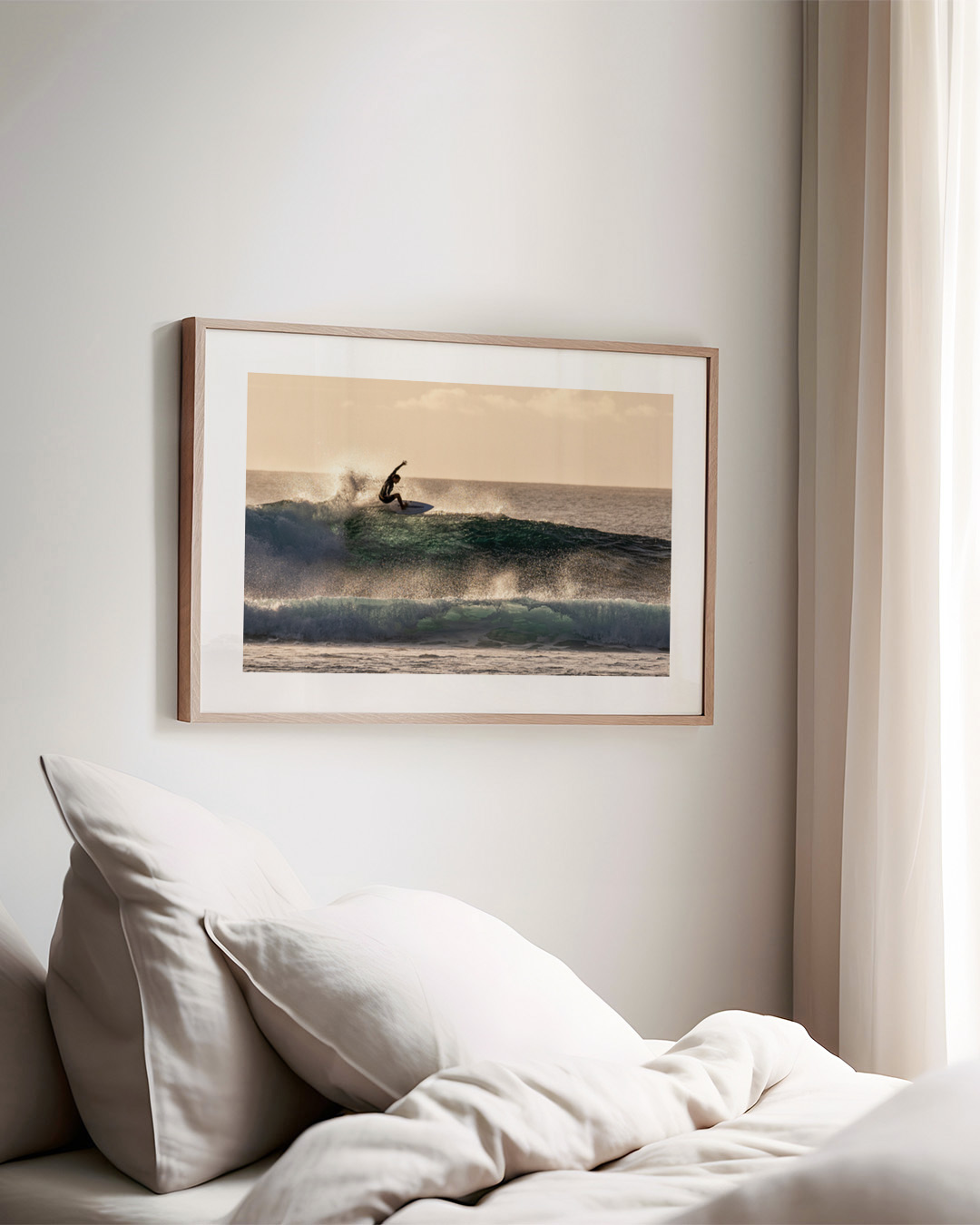 Het gespannen canvas wordt gemonteerd in een stijlvolle baklijst van echt hout voor een elegante uitstraling en extra dimensie. De ruimte tussen het canvas en de lijst creëert een zwevend effect.