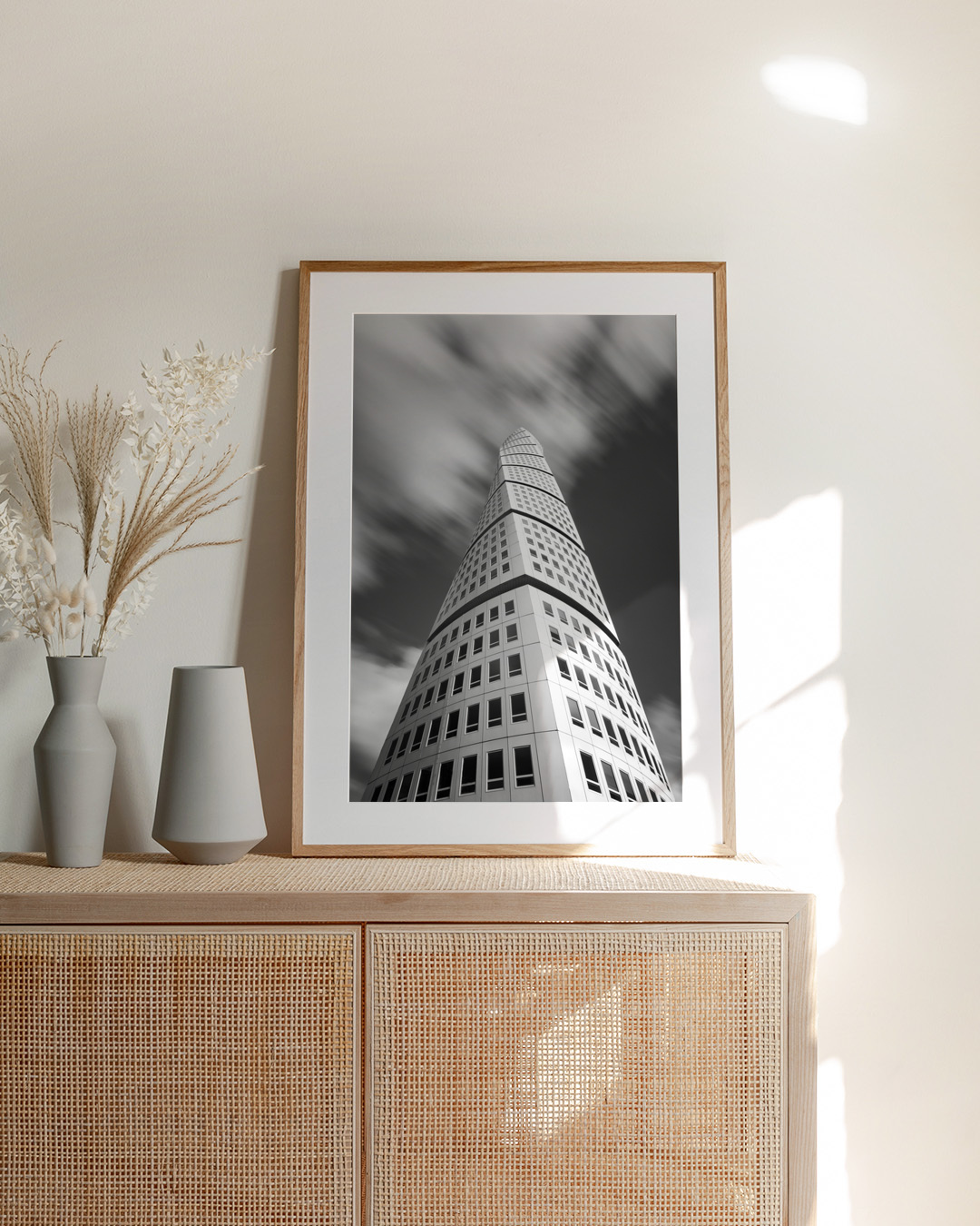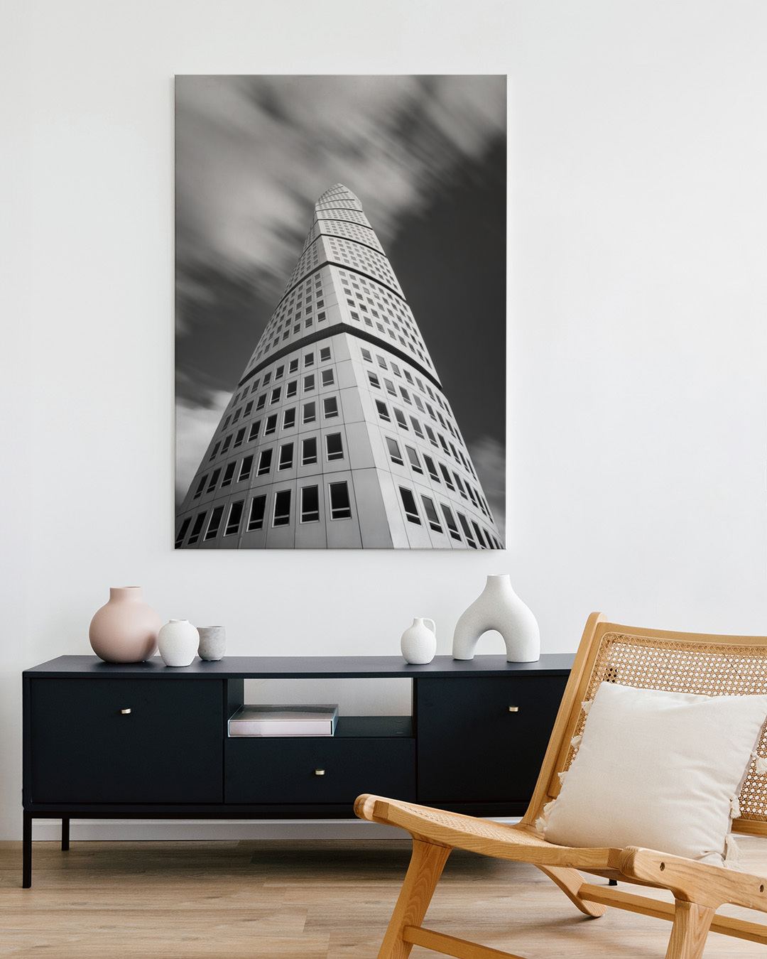 Een opvallende opname van het beroemde Turning Torso-gebouw in Malmö, Zweden, die de unieke, moderne architectuurstijl ervan benadrukt.