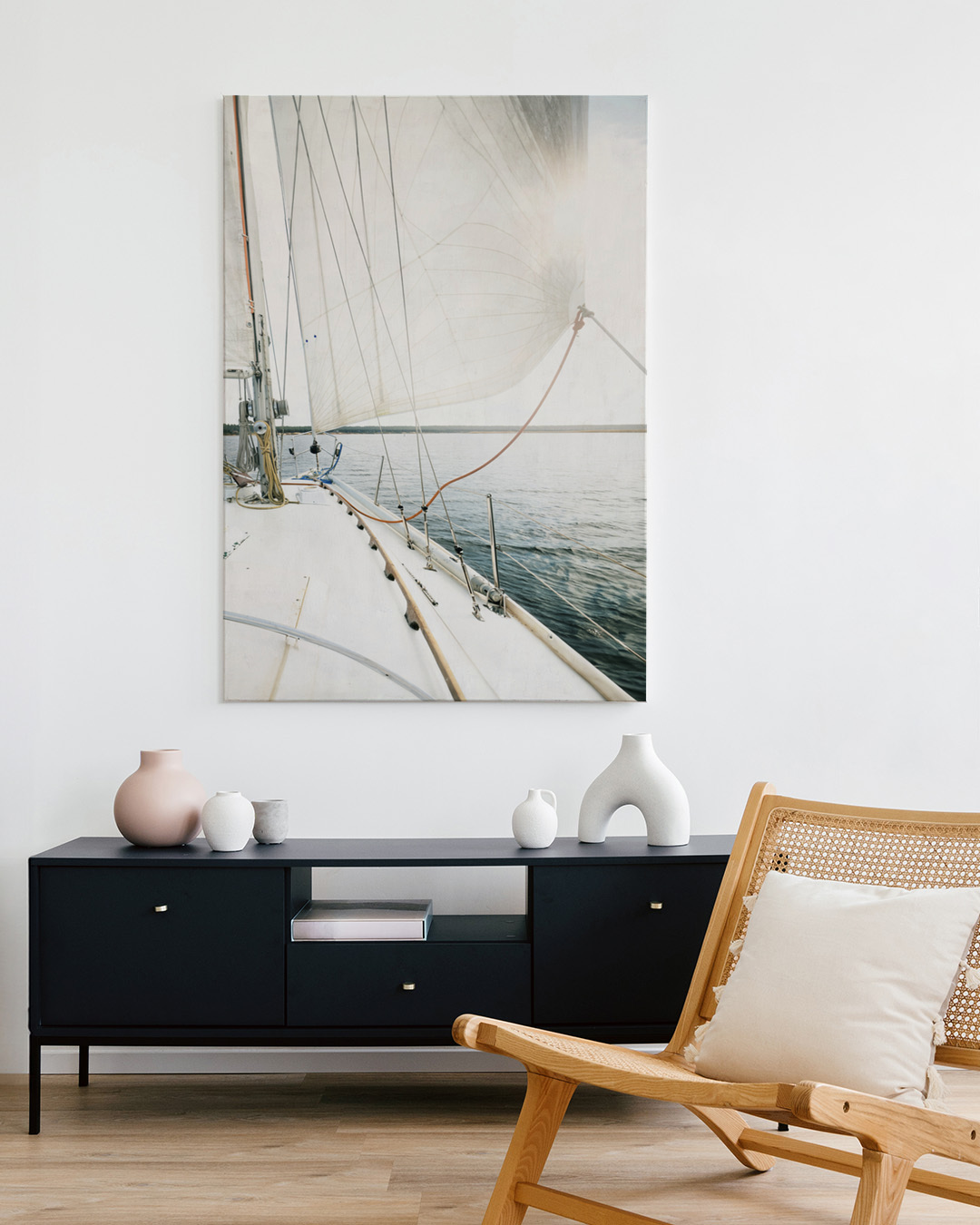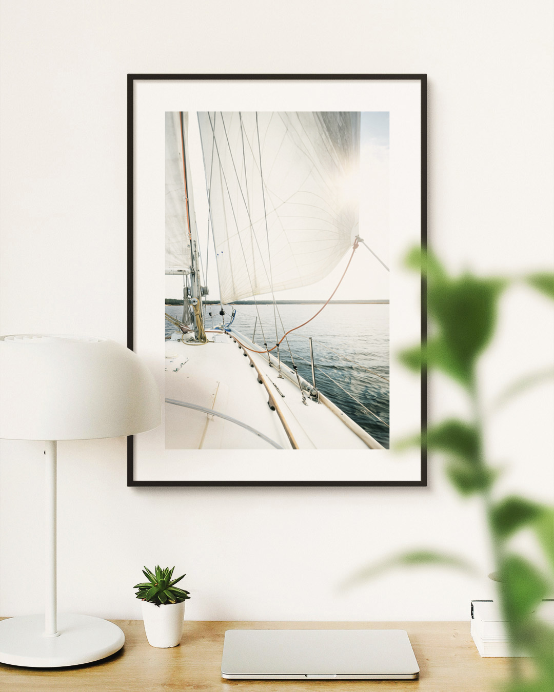 Ervaar de rust van een zeilavontuur met deze fotoafdruk van Kathrin Pienaar. De afbeelding vangt de zonovergoten zeilen van een jacht terwijl het over serene wateren glijdt, wat een gevoel van vrijheid en verkenning weergeeft.