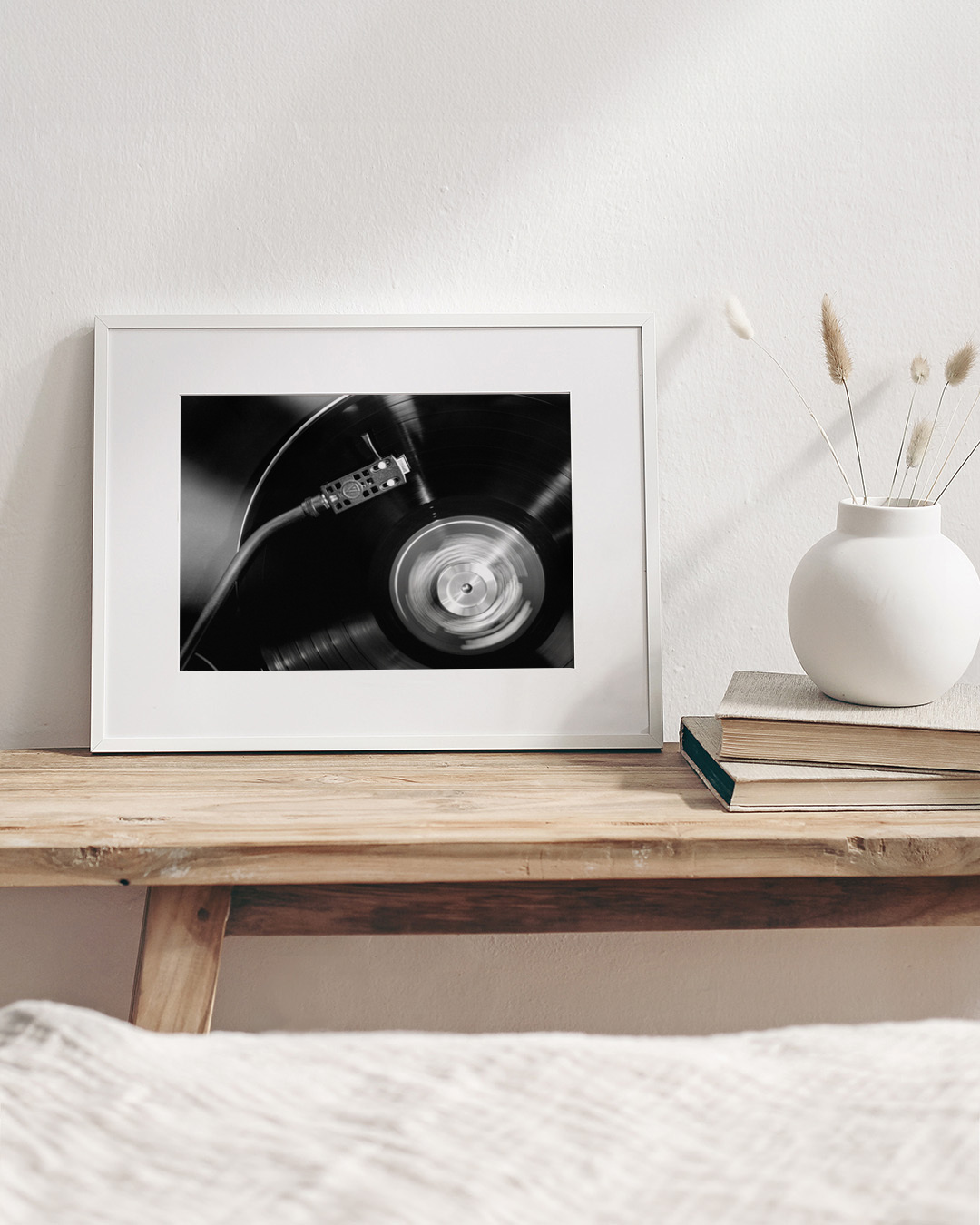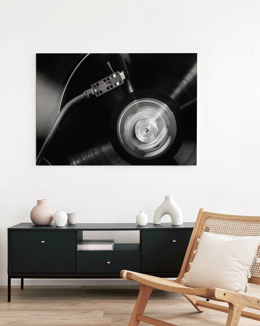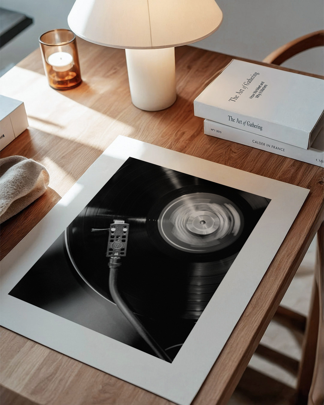Deze zwart-wit foto vangt de essentie van nostalgie met een draaiende grammofoonplaat. Perfect voor muziekliefhebbers en liefhebbers van retrobeelden.