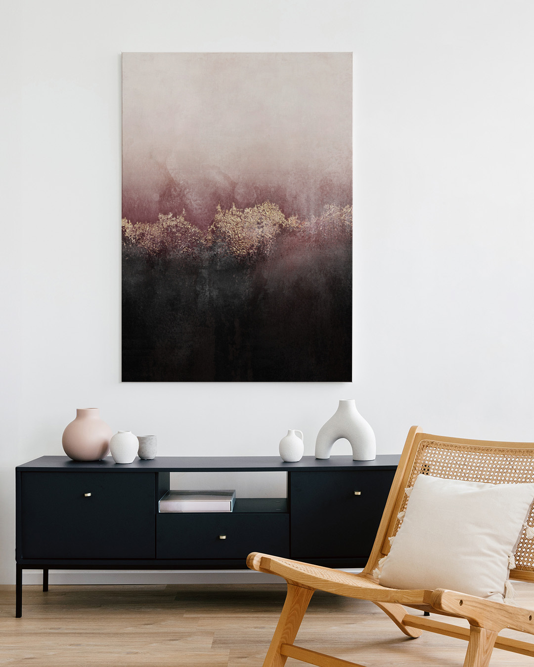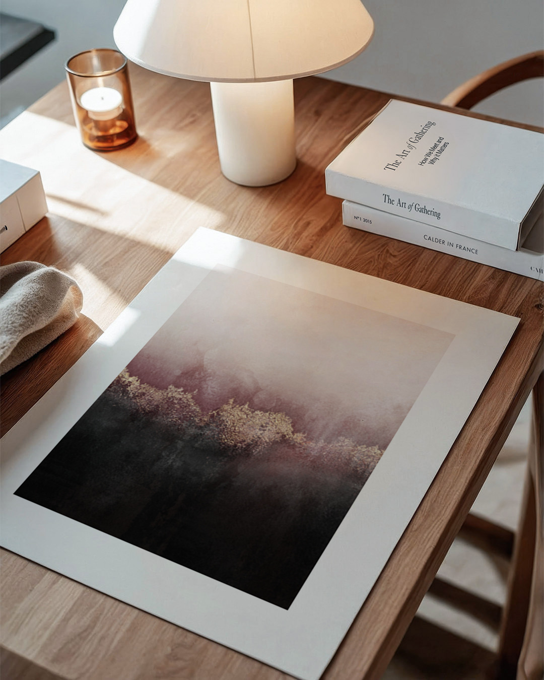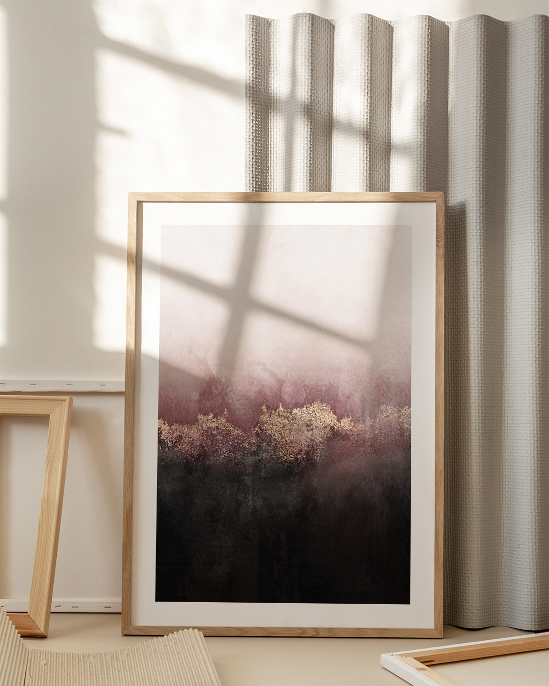 Een boeiende abstracte print waarin een bos onder een verzachtende roze lucht met roze tinten die naadloos in elkaar overgaat. Perfect om een modern vleugje natuur aan elke ruimte toe te voegen.