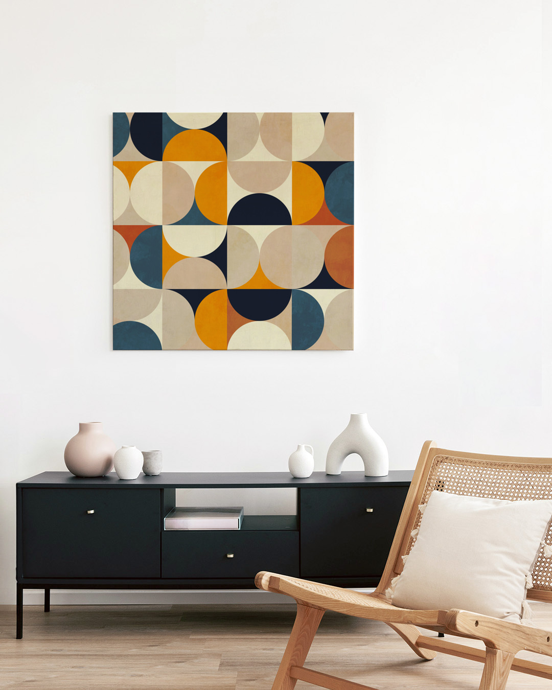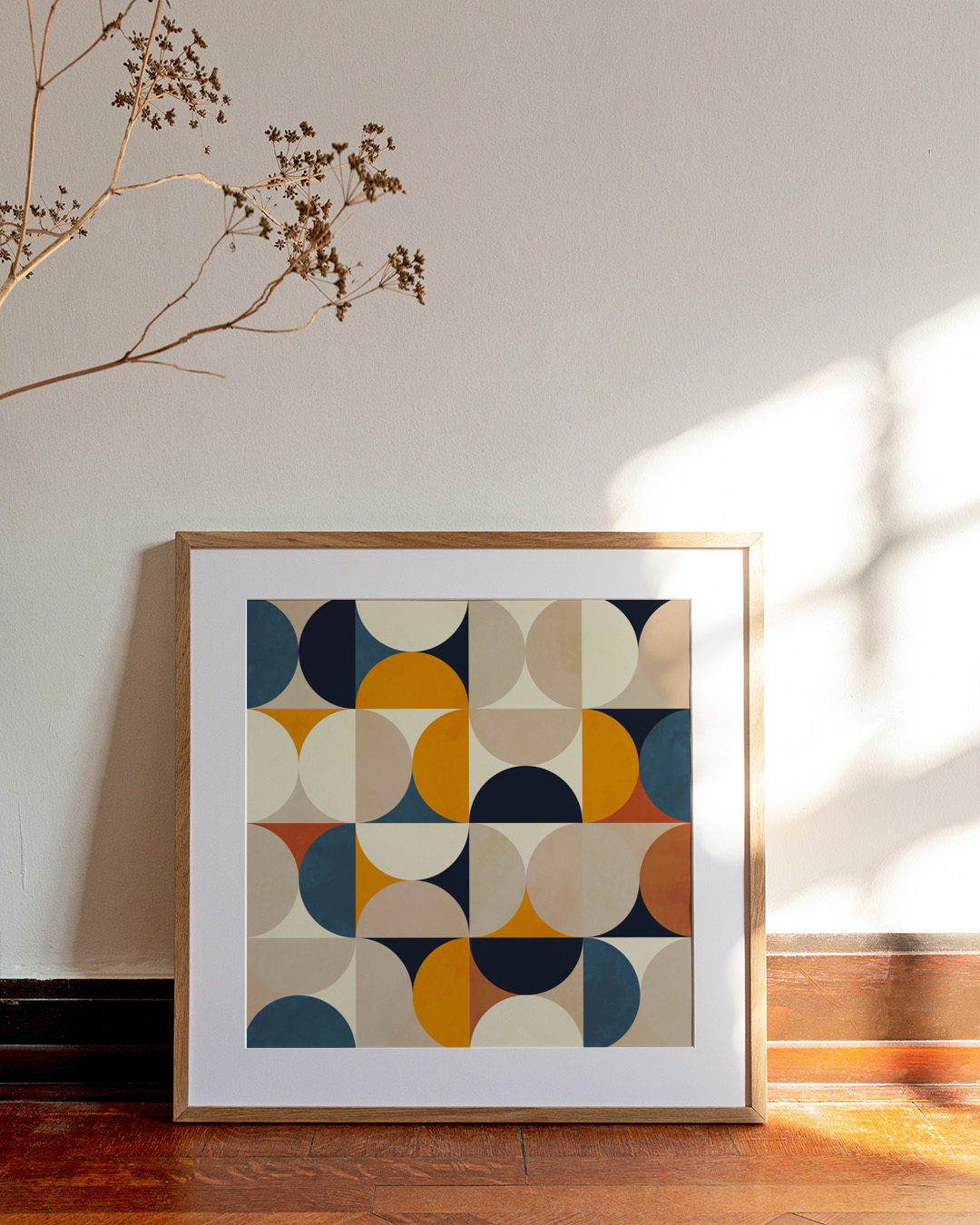Een abstracte geometrische kunstafbeelding van Ana Rut Bre met een ritmisch patroon van vormen in warme beige en bruine tinten, perfect om een retro uitstraling aan elke ruimte te geven.