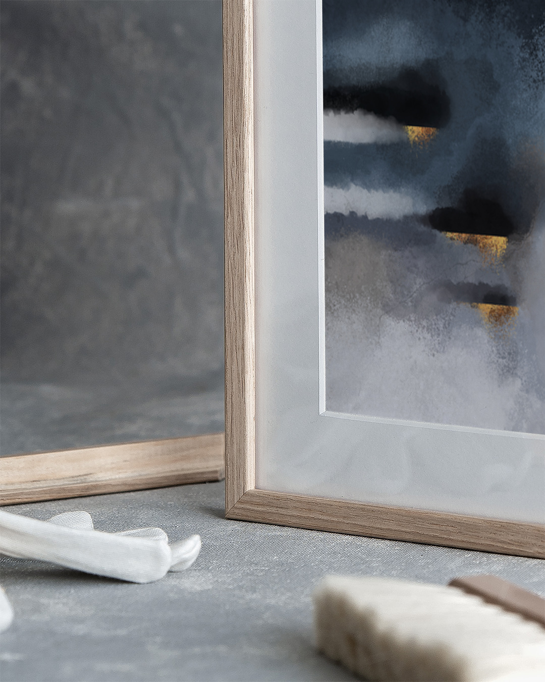 Het gespannen canvas wordt gemonteerd in een stijlvolle baklijst van echt hout voor een elegante uitstraling en extra dimensie. De ruimte tussen het canvas en de lijst creëert een zwevend effect.