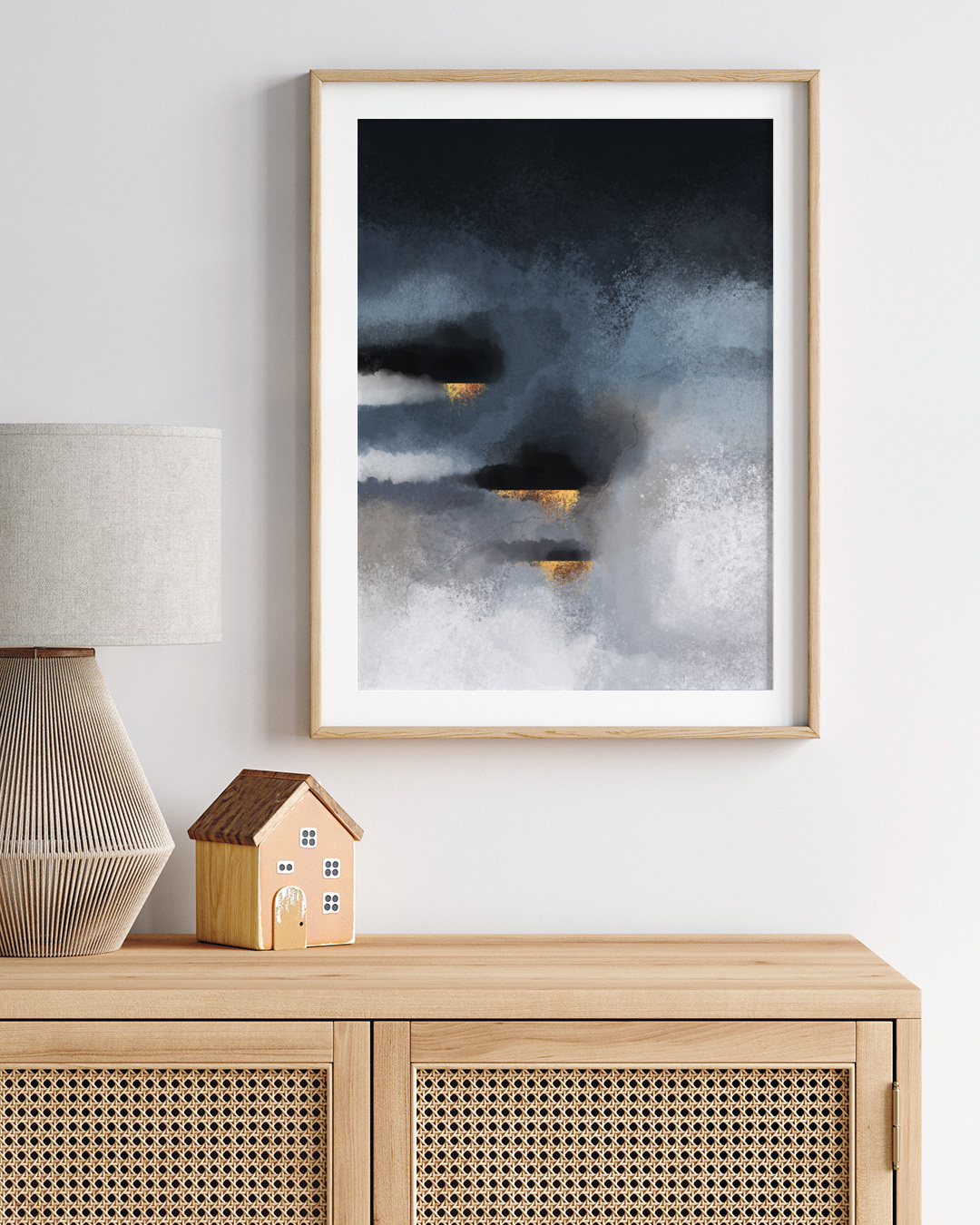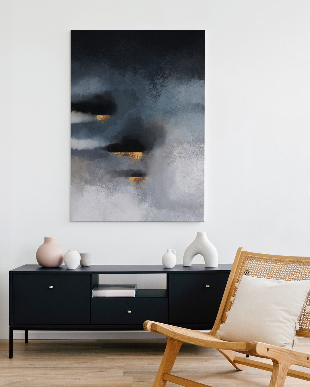 Deze abstracte print toont een intrigerende compositie die lijkt op mistige vormen met opvallende gouden accenten. De atmosferische lagen wekken een gevoel van diepte en mysterie op en bieden zo een uniek brandpunt in eigentijdse ruimtes.