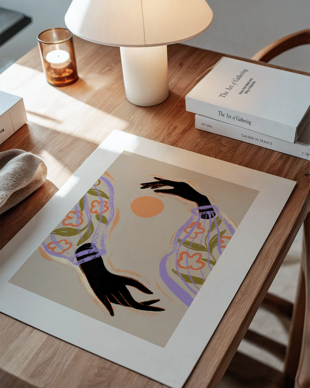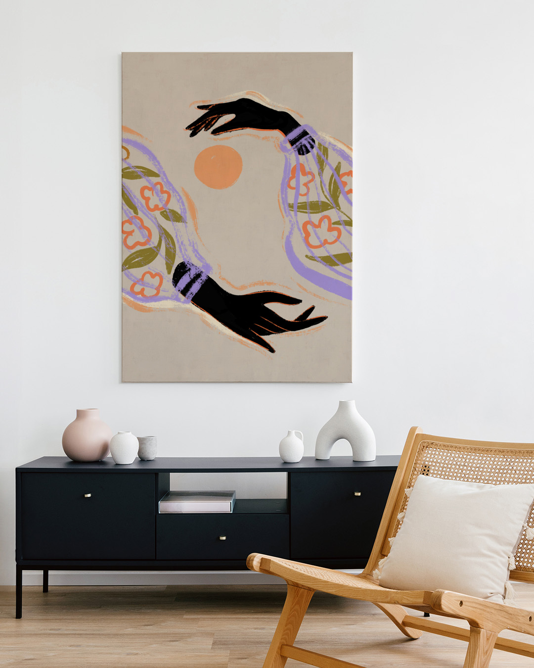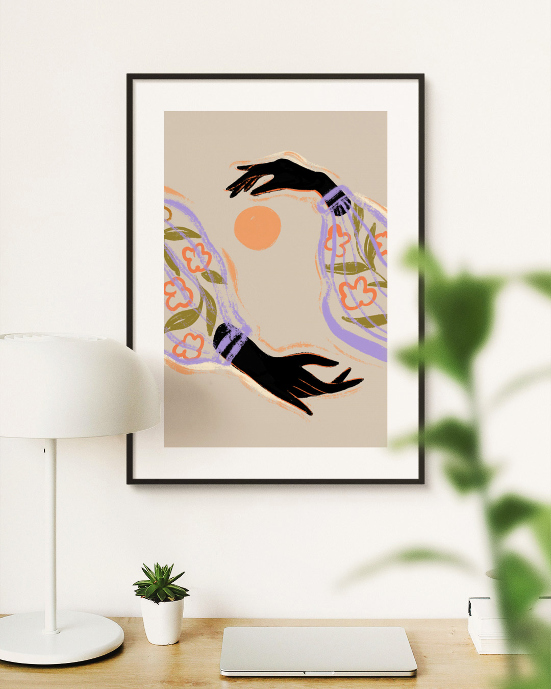 Een boeiende illustratie van Arty Guava met twee expressieve armen met bloemmotieven, reikend naar een oranje zon tegen een zacht beige achtergrond. Het contrast van zwarte armen met kleurrijke patronen zorgt voor een dramatische flair.