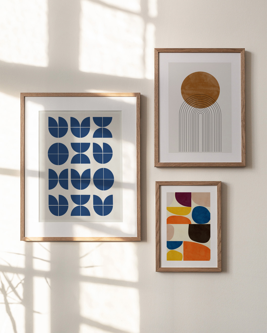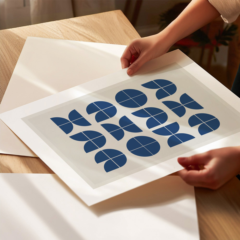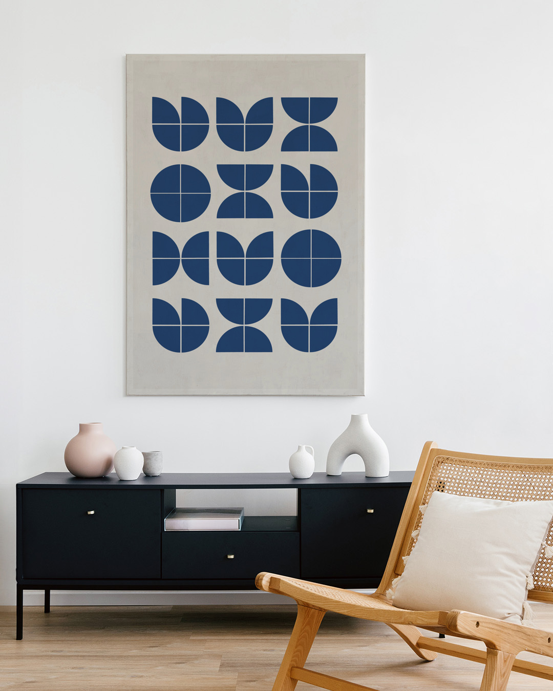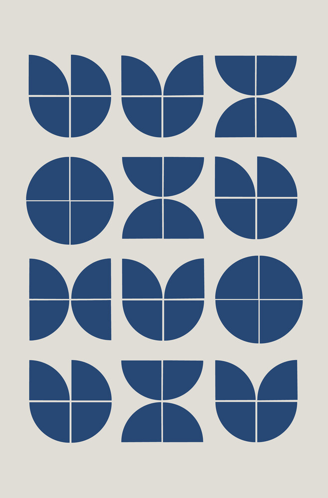 Ervaar een klassiek Bauhaus-geïnspireerd geometrisch patroon van Miuus Studio. Dit kunstwerk bevat blauwe vormen op een zachte beige achtergrond, die minimalistische moderne kunst uitstraalt.