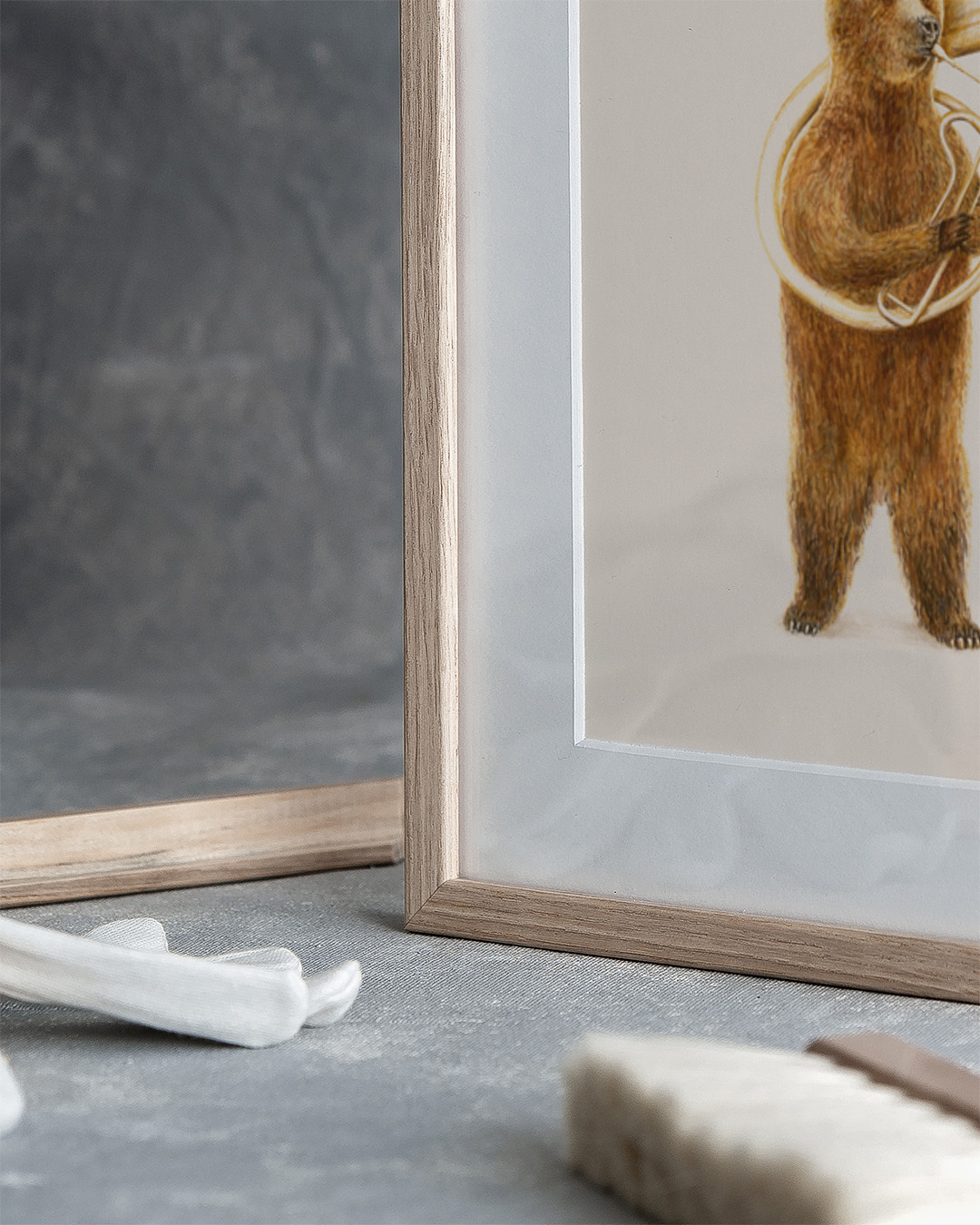 Het gespannen canvas wordt gemonteerd in een stijlvolle baklijst van echt hout voor een elegante uitstraling en extra dimensie. De ruimte tussen het canvas en de lijst creëert een zwevend effect.