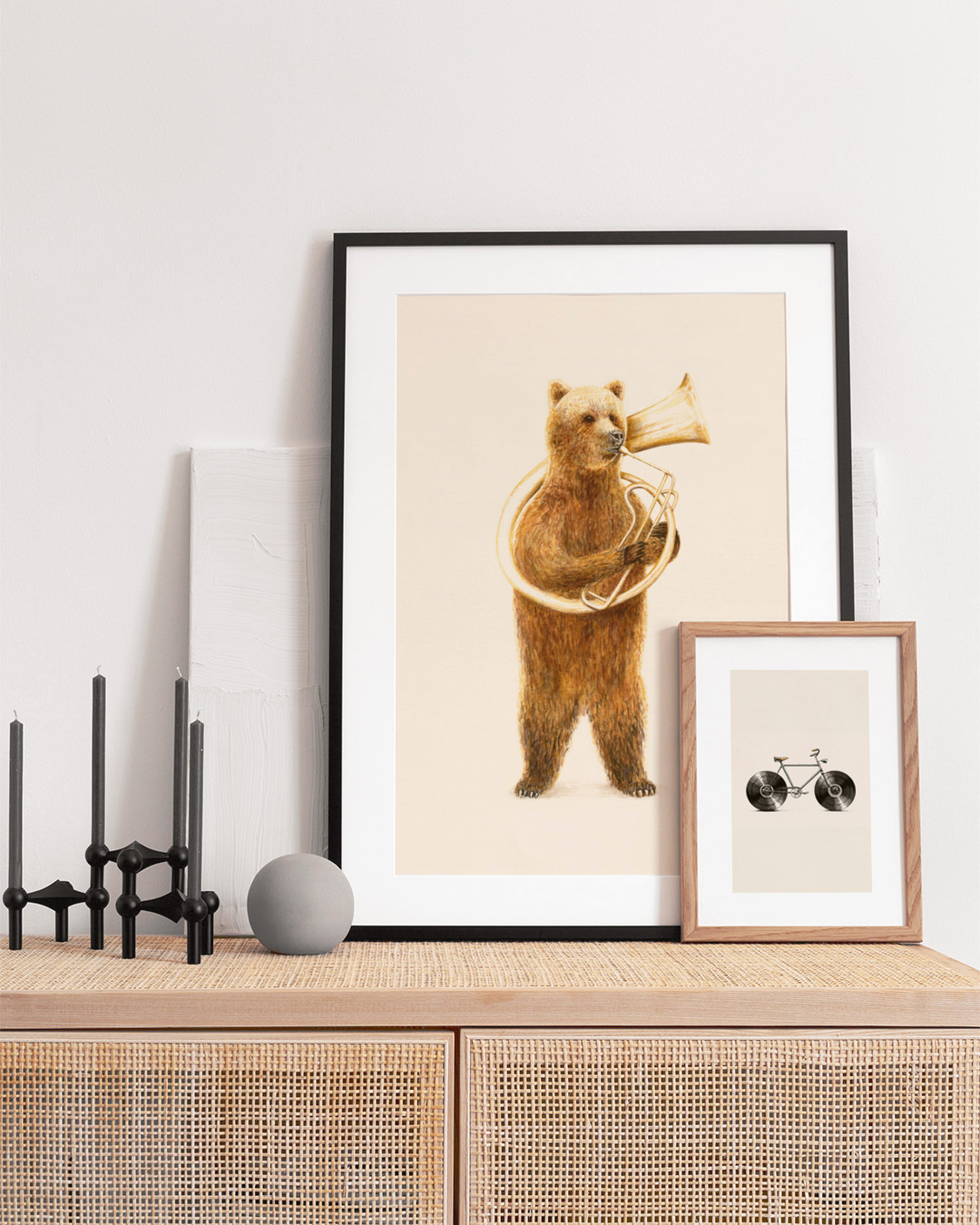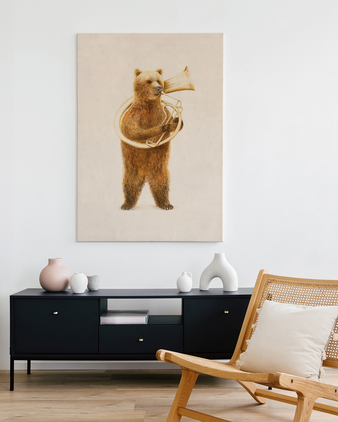 Florent Bodart's charmante stuk toont een speelse bruine beer die een helicon bespeelt. De combinatie van dierenleven en muziek creëert een fantasierijk en plezierig tafereel voor dieren- en muziekliefhebbers.