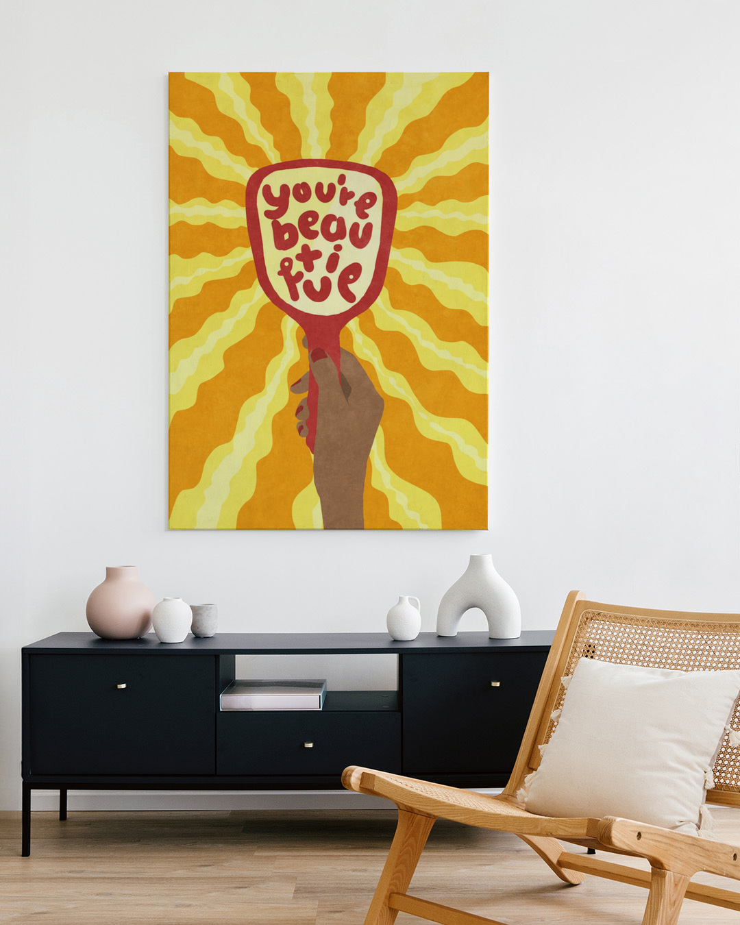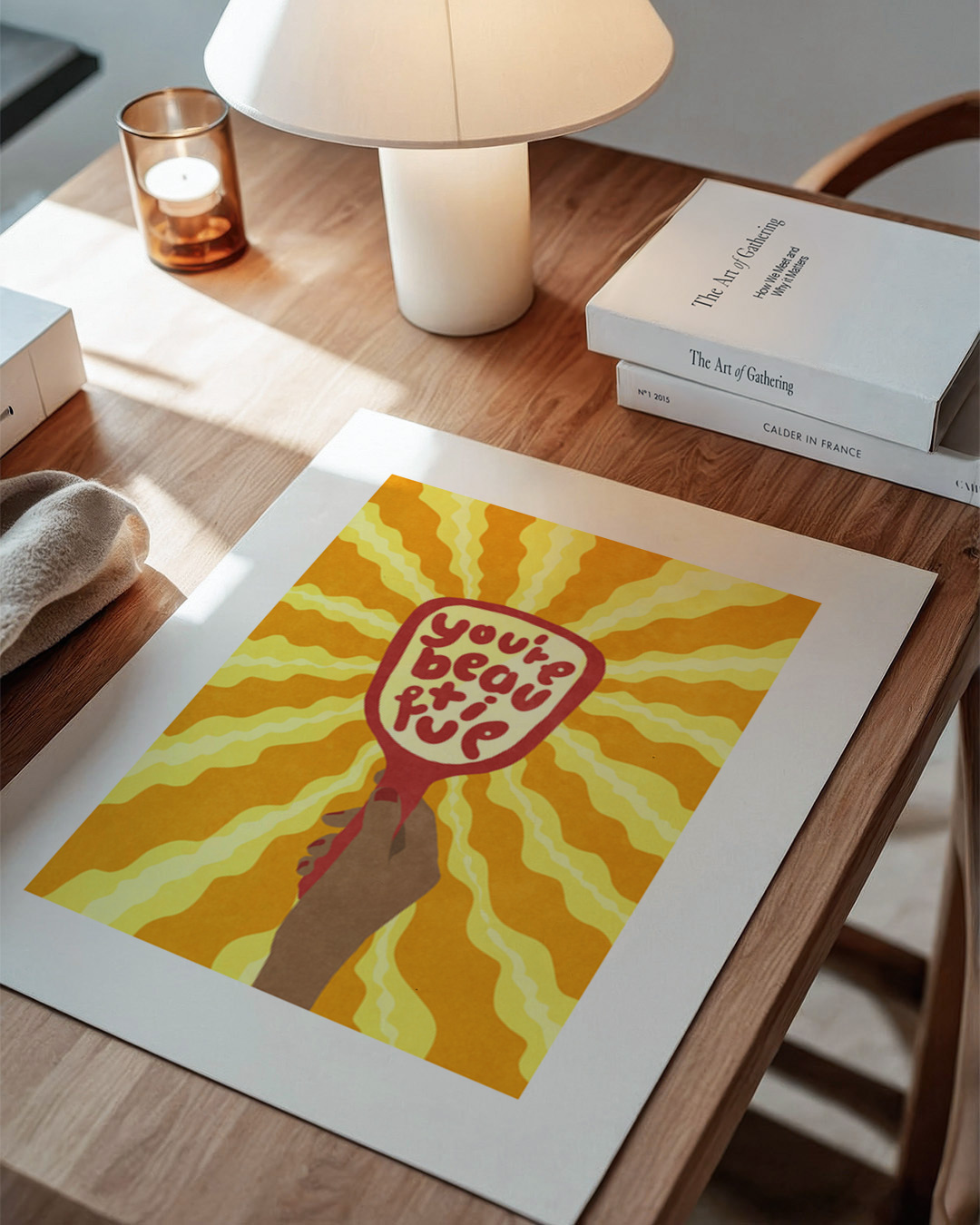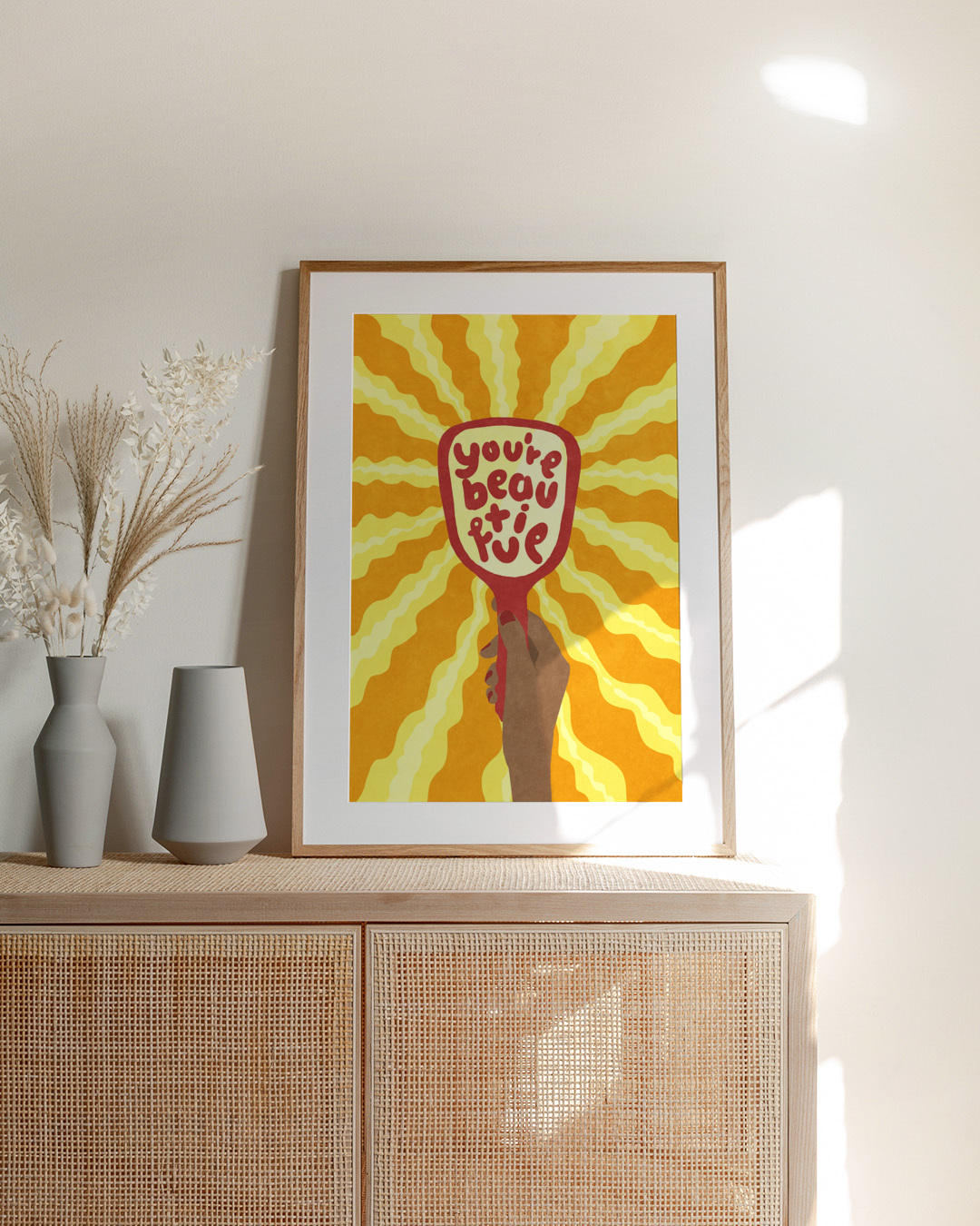 Het kunstwerk van Raissa Oltmanns toont een hand die een spiegel vasthoudt met 'You're beautiful' tekst, met stralende zonneschijn op de achtergrond. De heldere gele en oranje tinten versterken de positieve boodschap.
