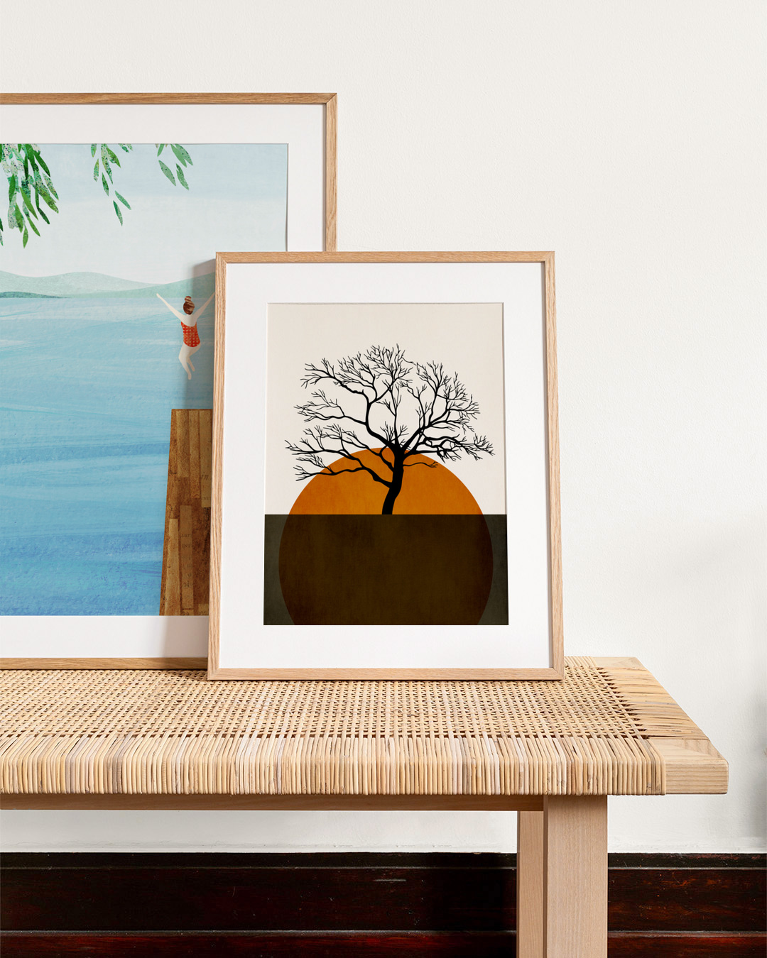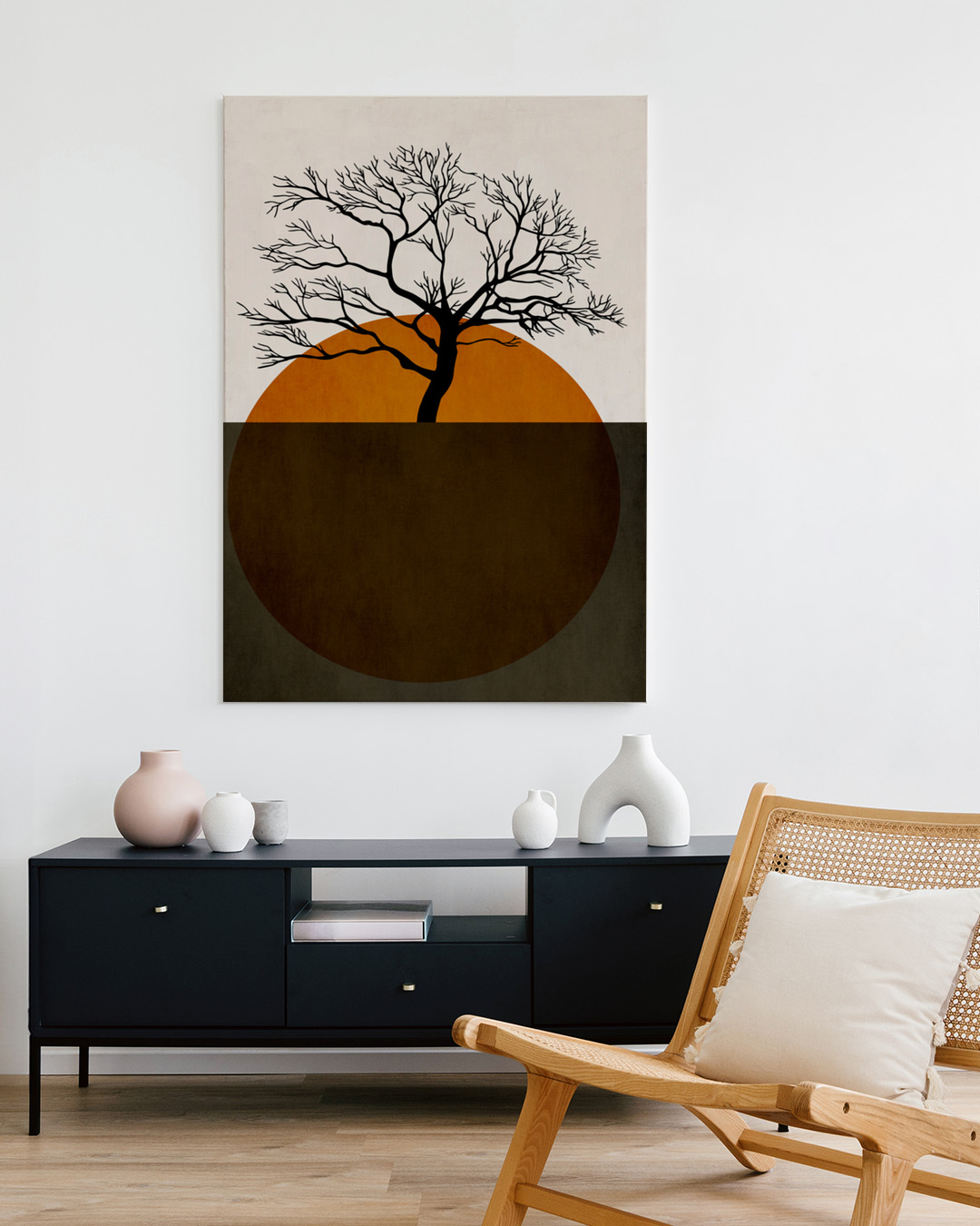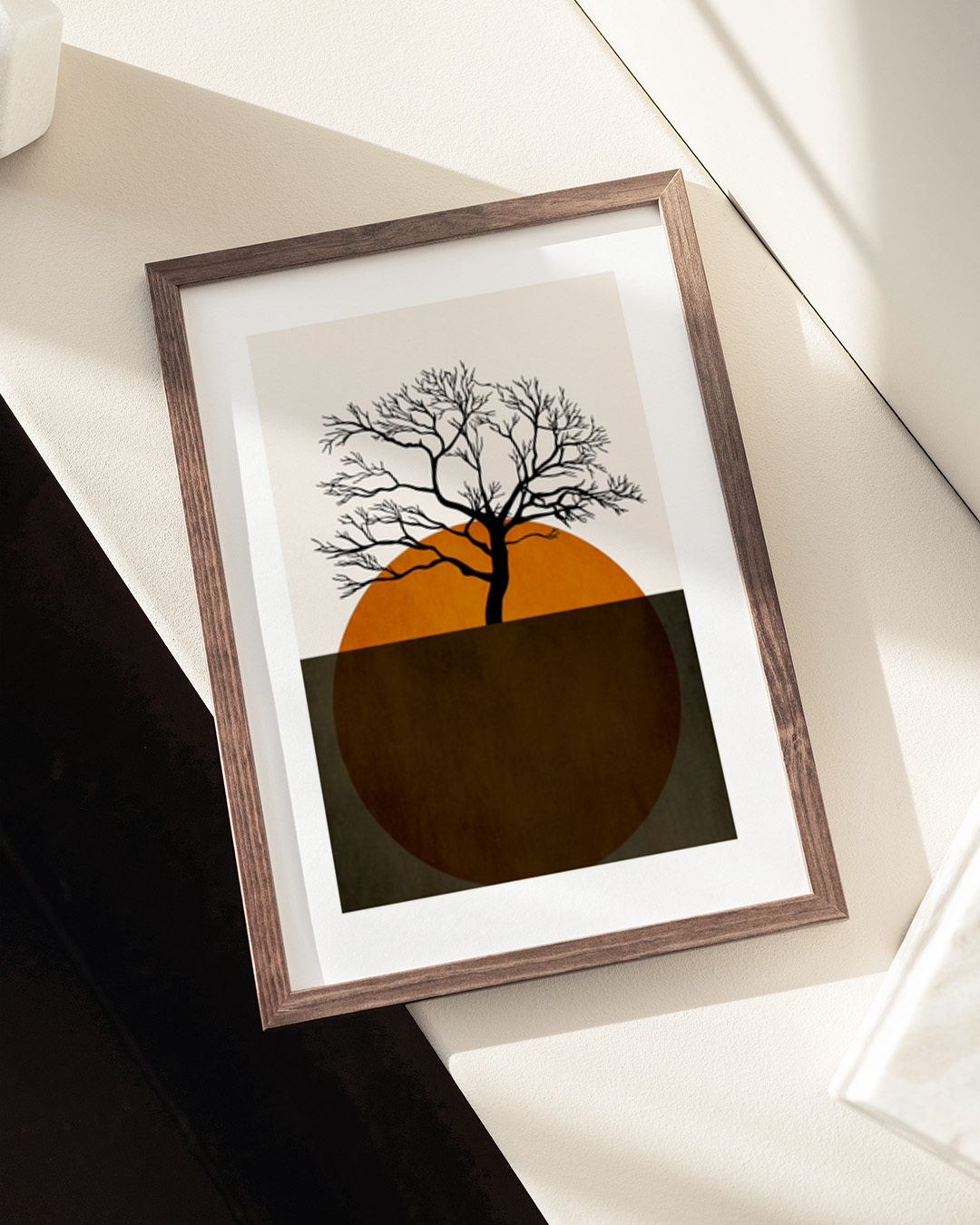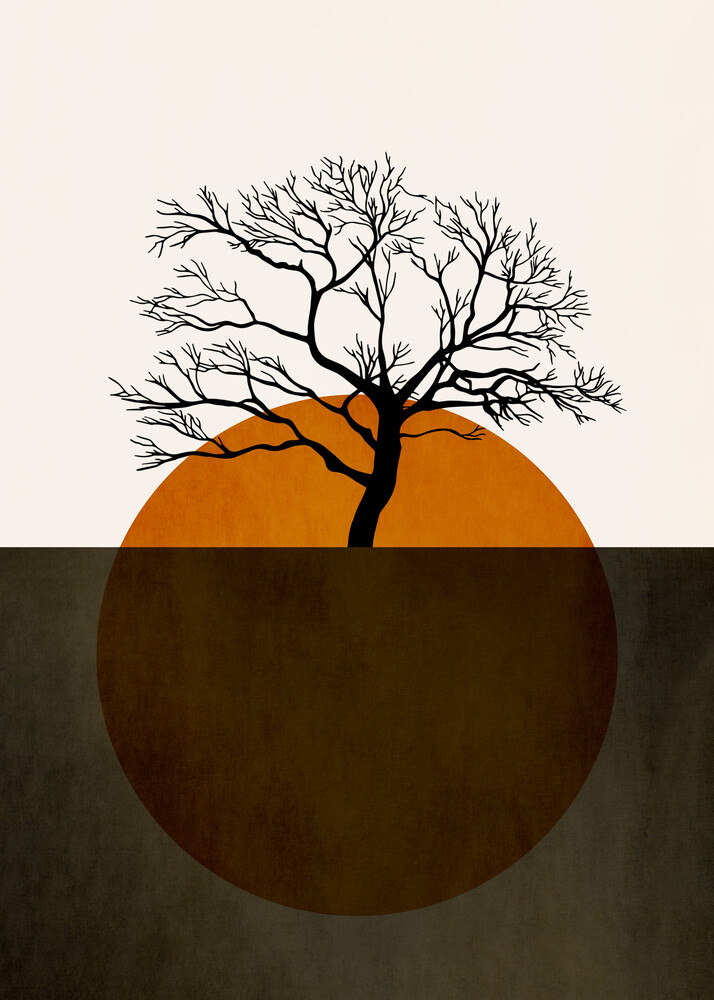 Dit boeiende kunstwerk van Boris Draschoff toont een solitaire boom silhouet tegen een levendige oranje cirkel. Het minimalistische ontwerp combineert natuurlijke en geometrische elementen, waardoor een vredige en visueel opvallende scène ontstaat.