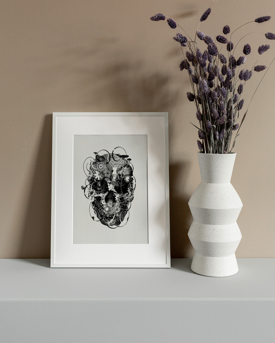 De fantasievolle illustratie van Jaco Putker toont een schedel met botanische versieringen. Deze zwart-witfusie combineert flora en fantasie tot een speels en tot nadenken stemmend kunstwerk.