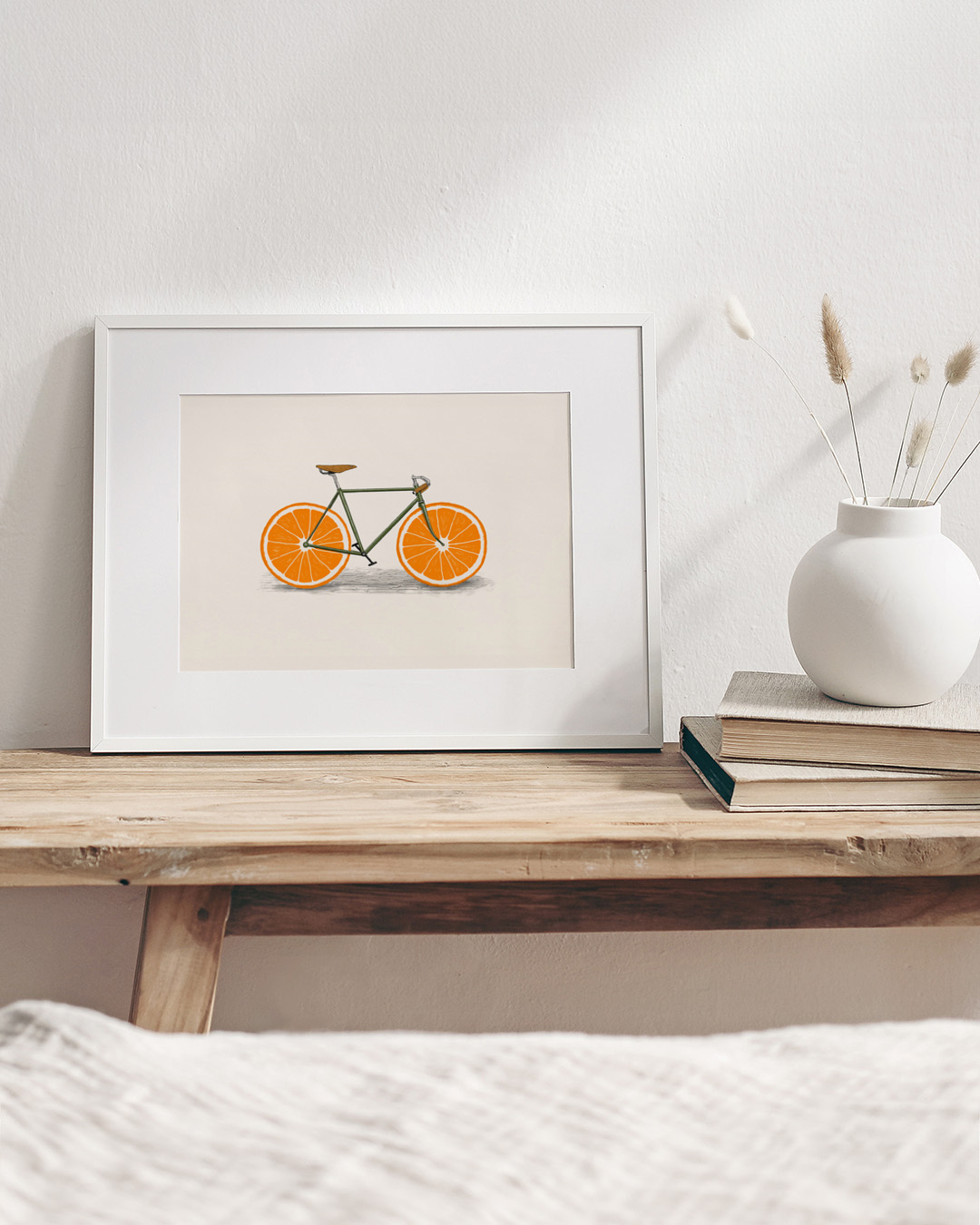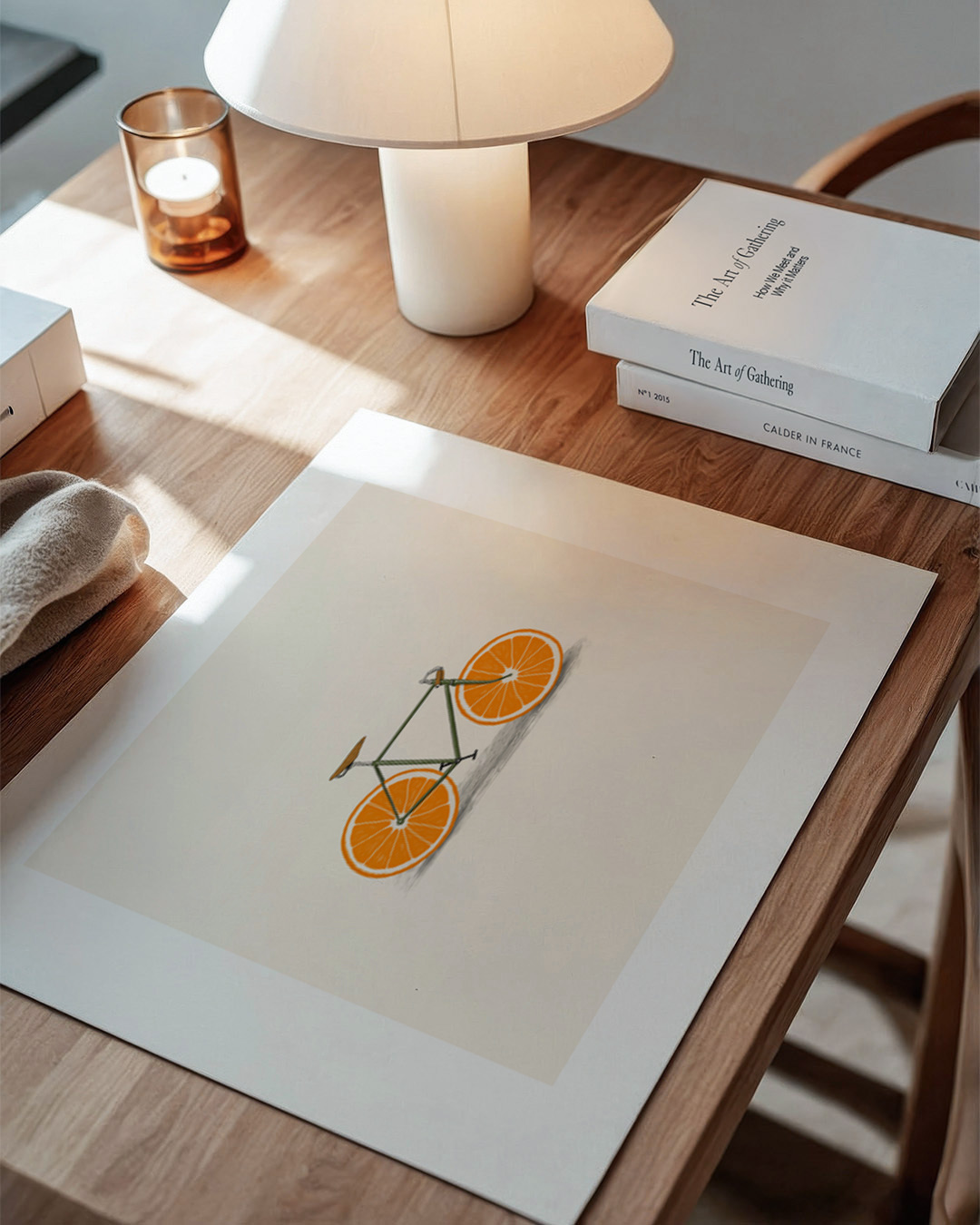 Deze speelse illustratie van Florent Bodart toont een fiets met opvallende sinaasappelvruchtwielen. Een eigenzinnig stuk dat vervoer en gastronomie op een ongebruikelijke maar aantrekkelijke manier samenbrengt.